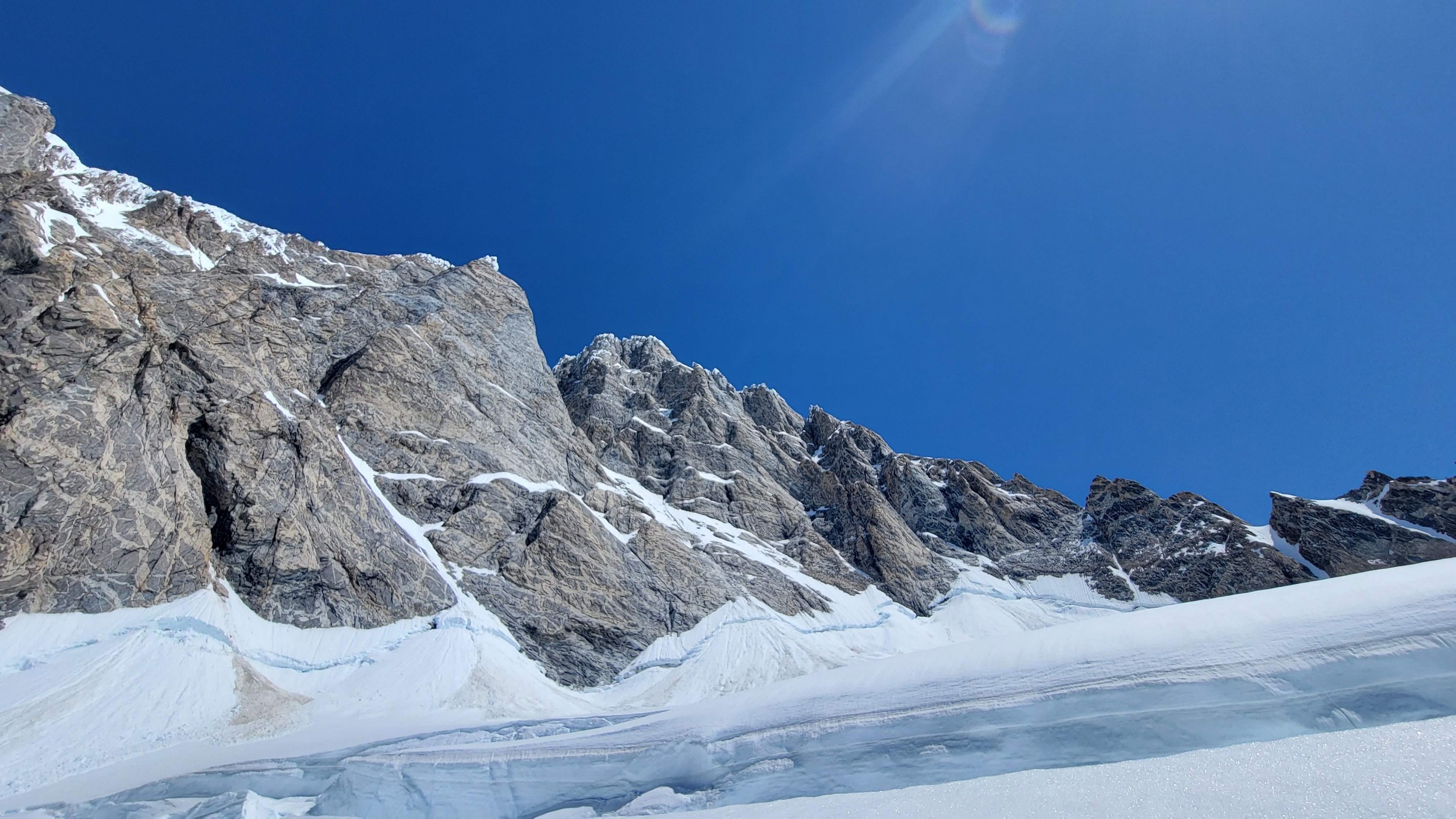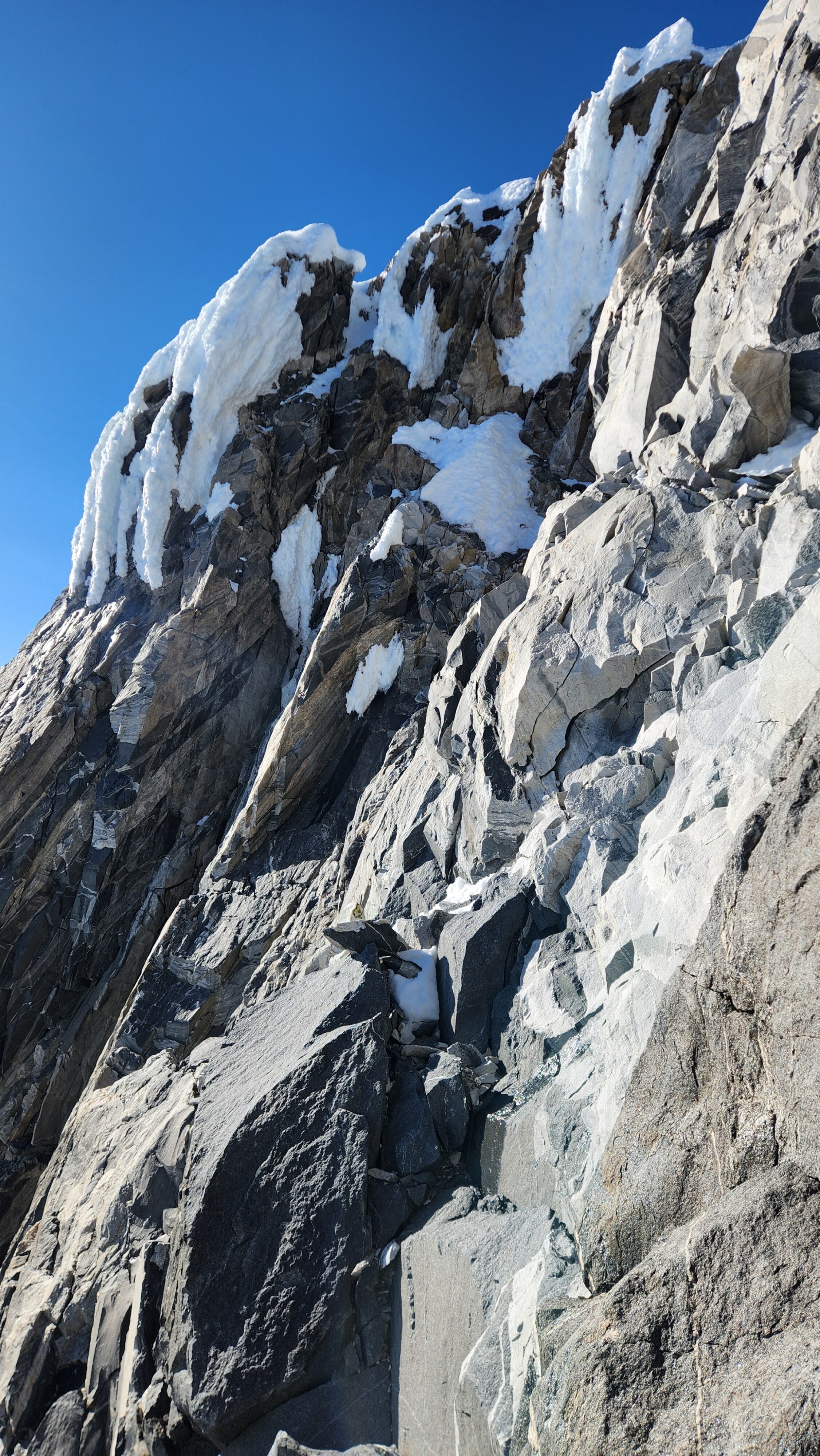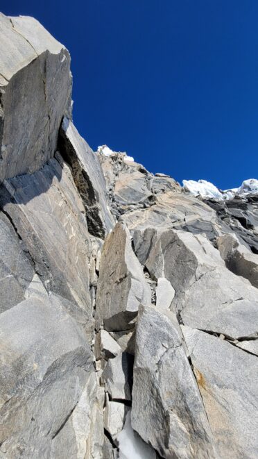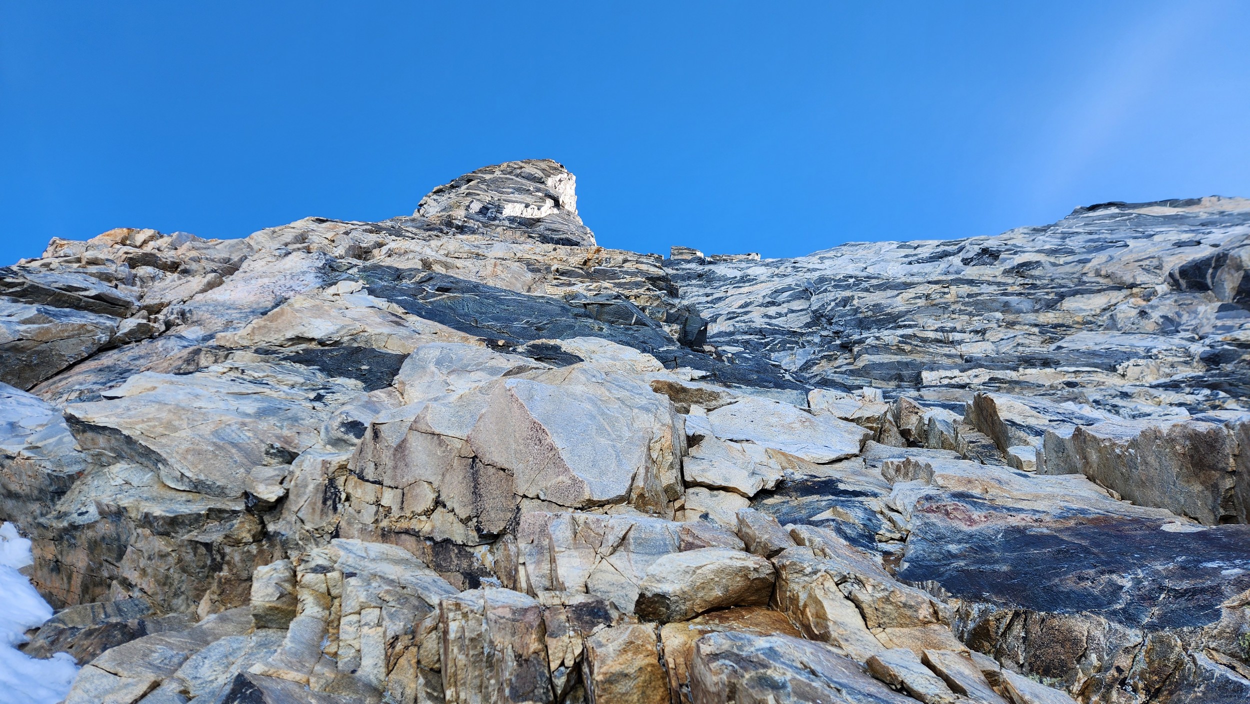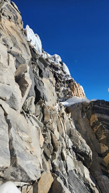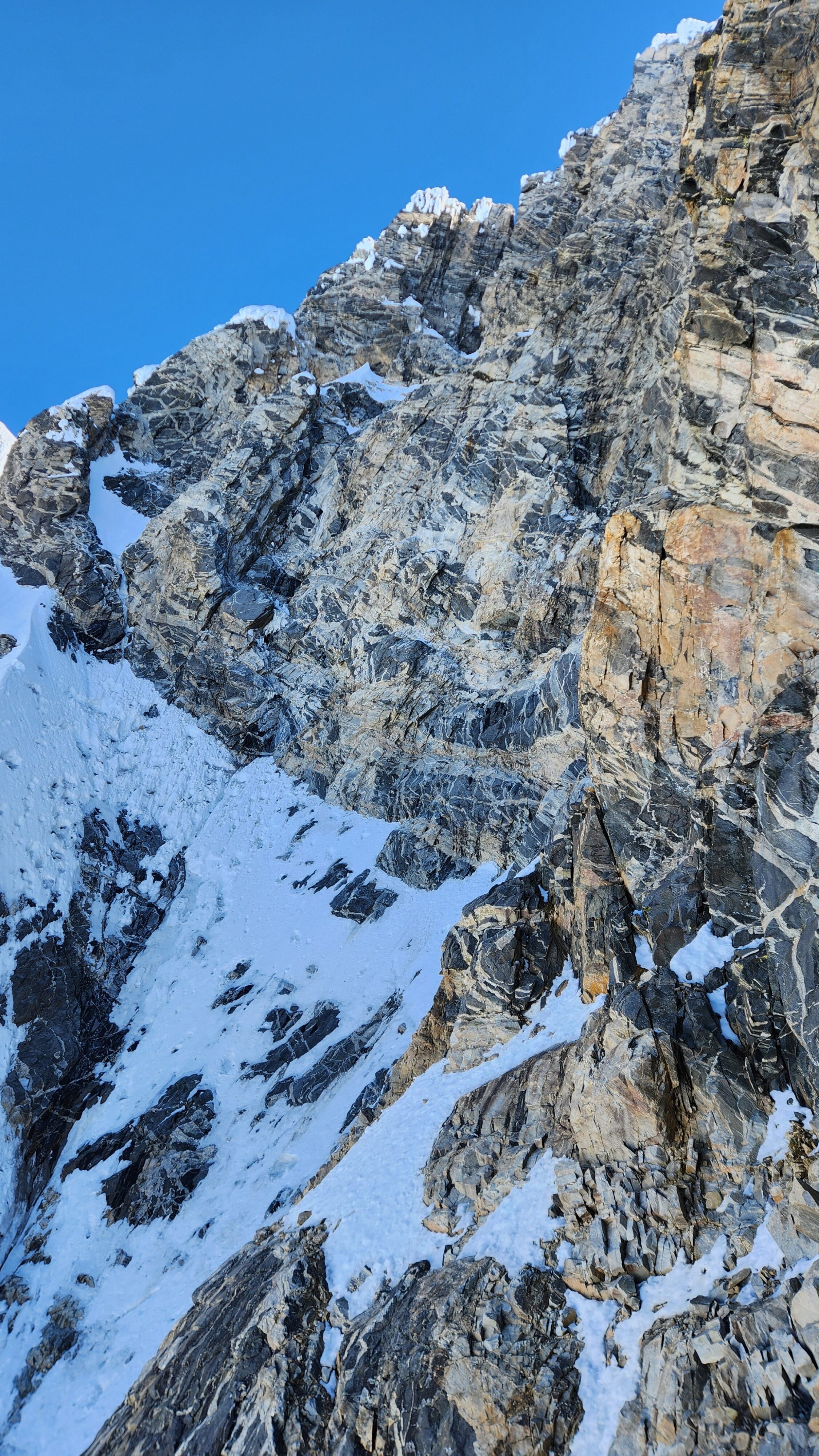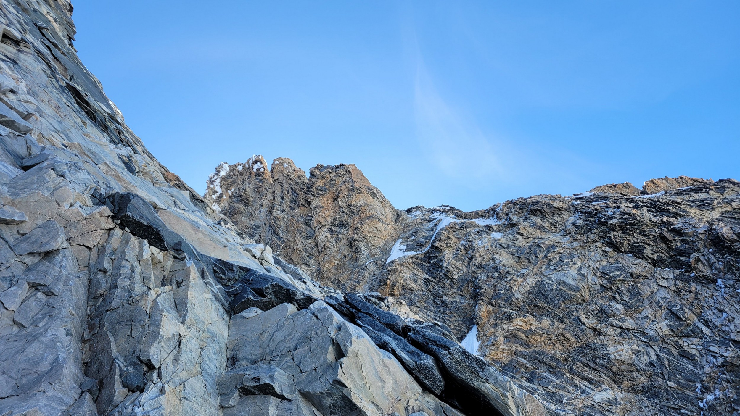 Above this we continued climbing up the now uniform shaded couloir which stayed a consistent 50 degrees. We made a special point to finish climbing the couloir before the sun hit it to ensure we were not getting pummeled with snow and ice due to sunlight thawing. The weather was perfect and warm for the foreseeable future and the temperatures were warm which was incredibly lucky. Conditions like this were something I'd waited half a decade for! We pretty quickly hit a fork in the couloir and we turned left and followed the ramp traversing up and cutting under a prominent rock pillar with a light colored cross on it shown in the beta photo above. The snow ramp abruptly ended and we found ourselves on some dry rock scrambling. The route took a sharp rightward traverse on a low angle but icy rock ledge to the triangle shaped snowfield. This infamous snowfield that had given previous parties pause or difficulty ended up being one of the easiest parts of the day for us. The snow had receded substantially in recent years and offered a very simple traverse across, with large steps/holes from where rocks had fallen offering plenty of places to casually stand. The photos below show the entry couloir through the triangle snowfield.
