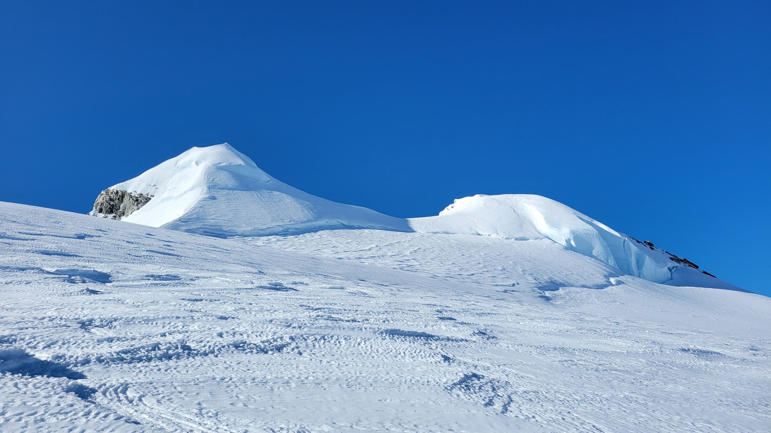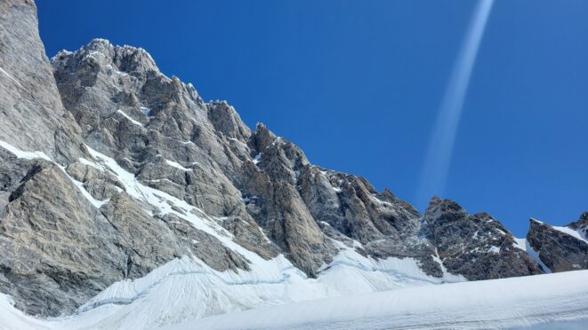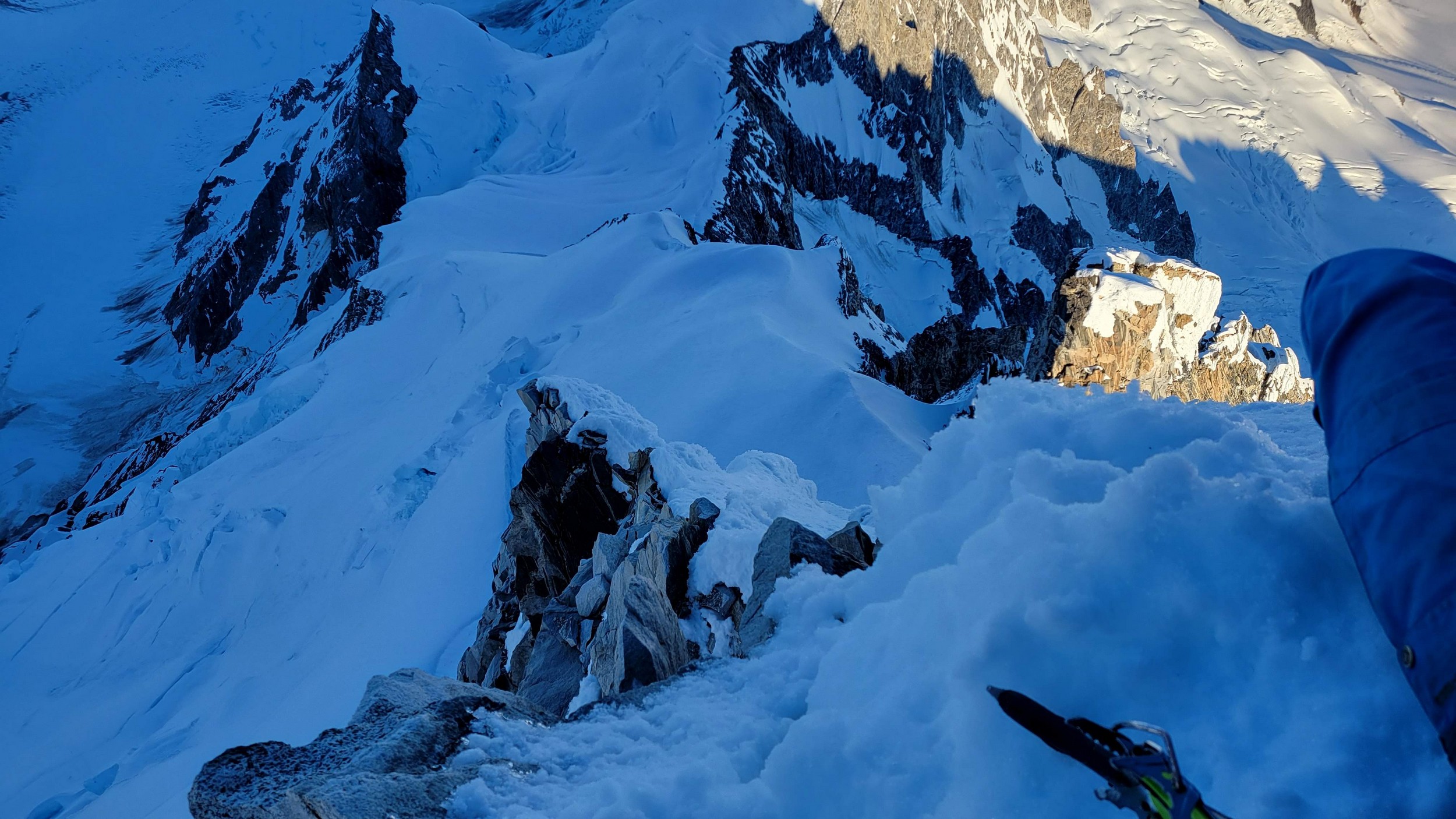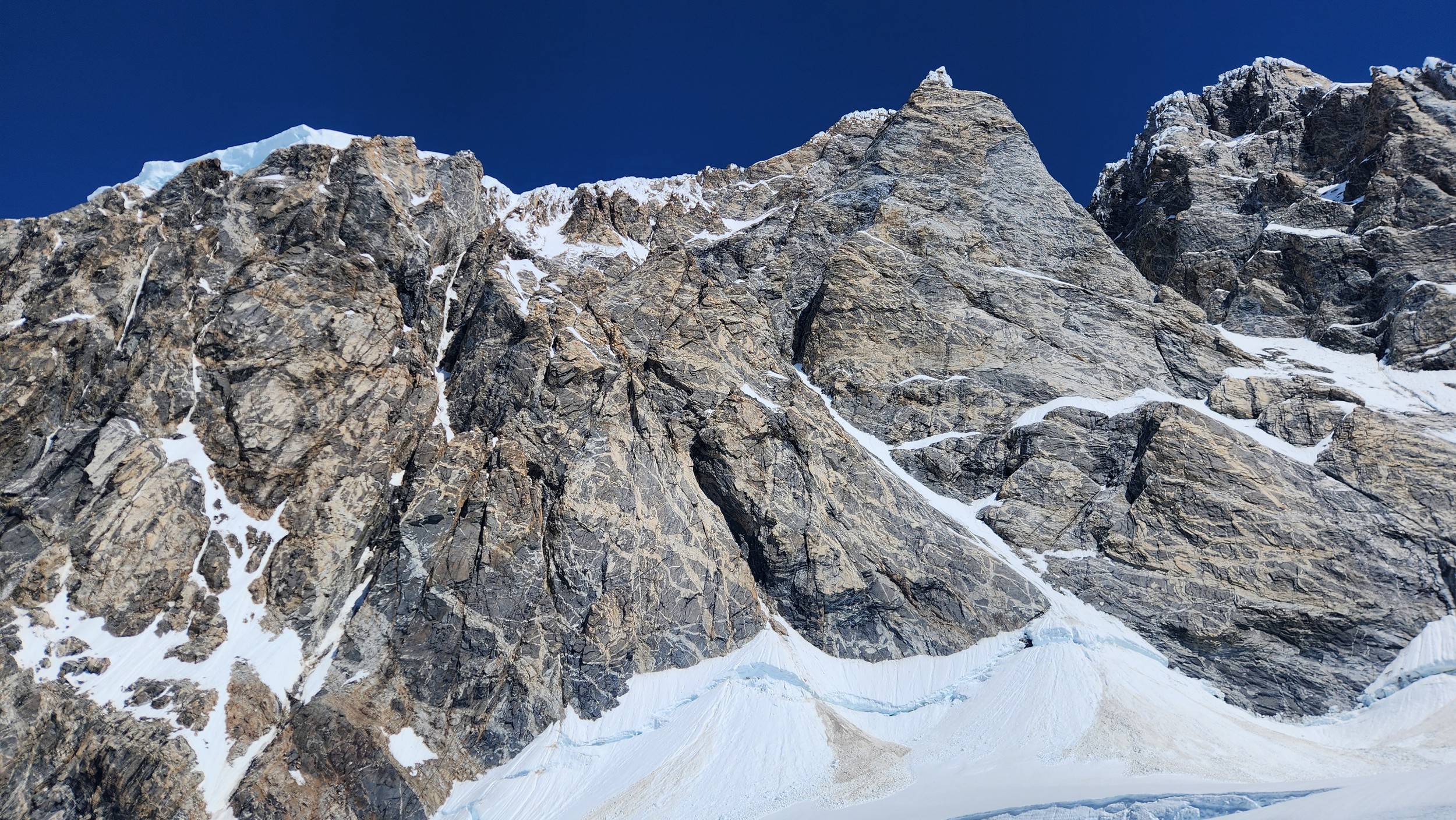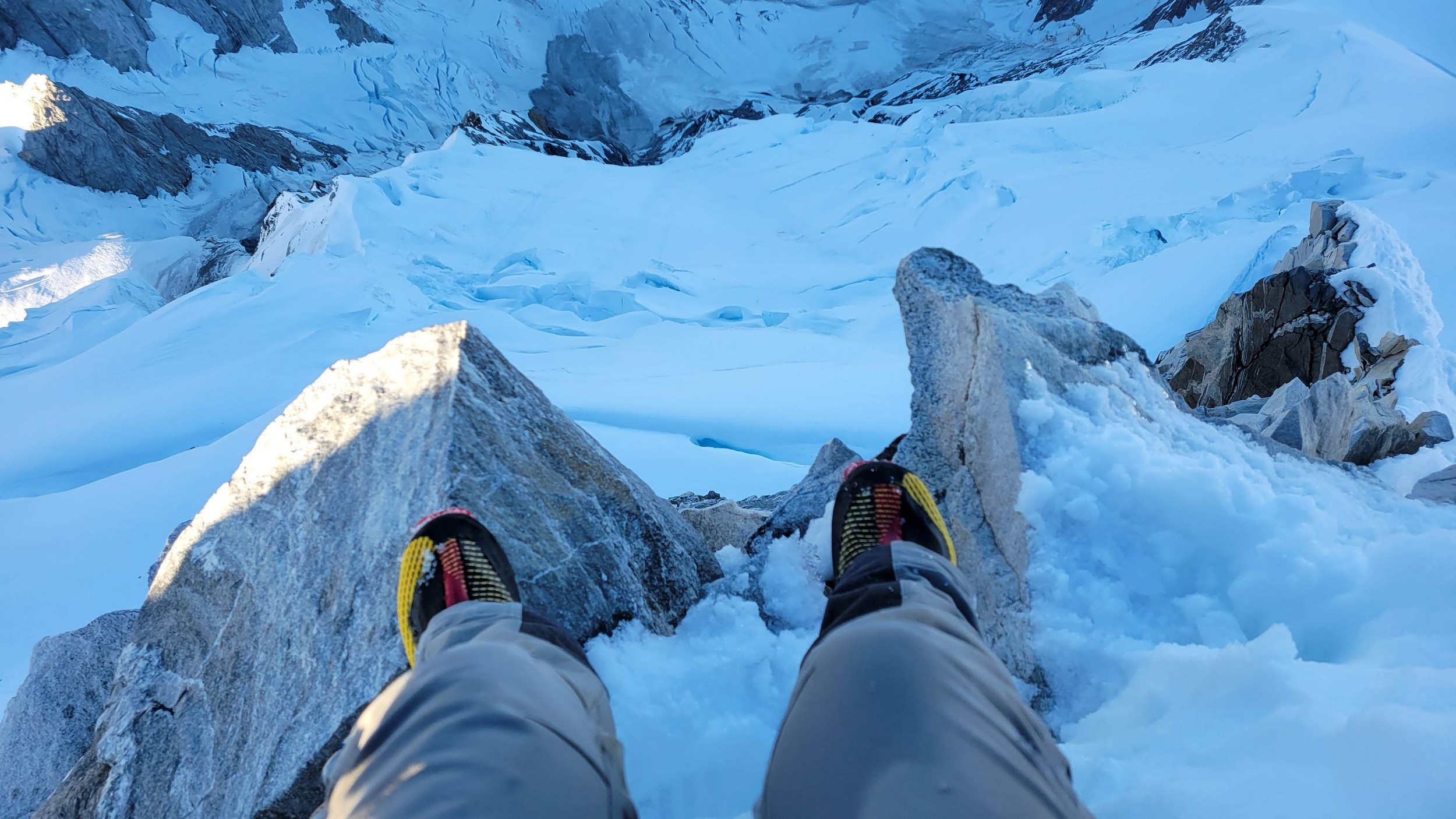 Above this we continued climbing up the now uniform shaded couloir which stayed a consistent 50 degrees. We made a special point to finish climbing the couloir before the sun hit it to ensure we were not getting pummeled with snow and ice due to sunlight thawing. The weather was perfect and warm for the foreseeable future and the temperatures were warm which was incredibly lucky. Conditions like this were something I'd waited half a decade for! We pretty quickly hit a fork in the couloir and we turned left and followed the ramp traversing up and cutting under a prominent rock pillar with a light colored cross on it shown in the beta photo above. The snow ramp abruptly ended and we found ourselves on some dry rock scrambling. The route took a sharp rightward traverse on a low angle but icy rock ledge to the triangle shaped snowfield. This infamous snowfield that had given previous parties pause or difficulty ended up being one of the easiest parts of the day for us. The snow had receded substantially in recent years and offered a very simple traverse across, with large steps/holes from where rocks had fallen offering plenty of places to casually stand. The photos below show the entry couloir through the triangle snowfield.