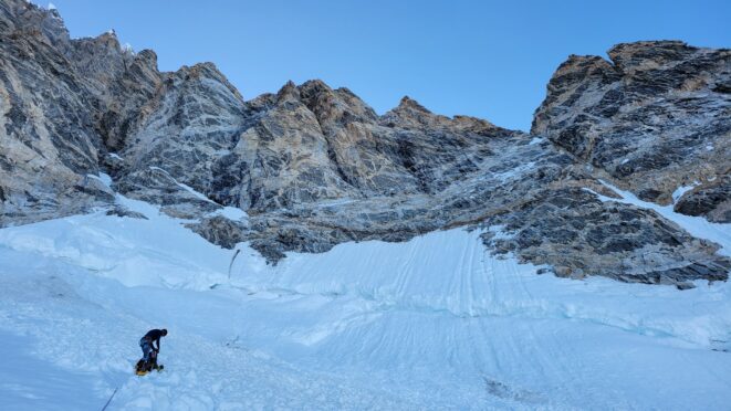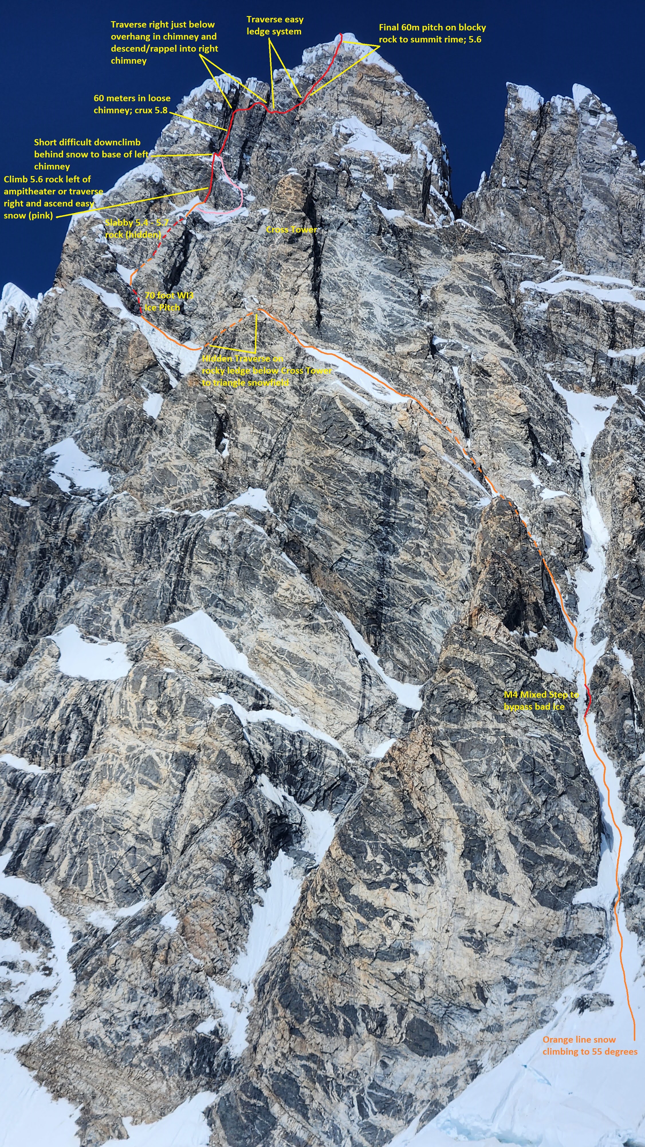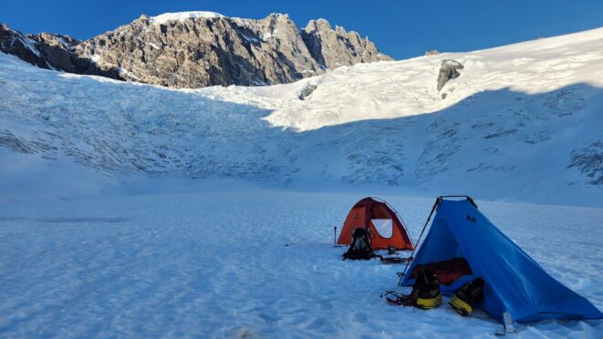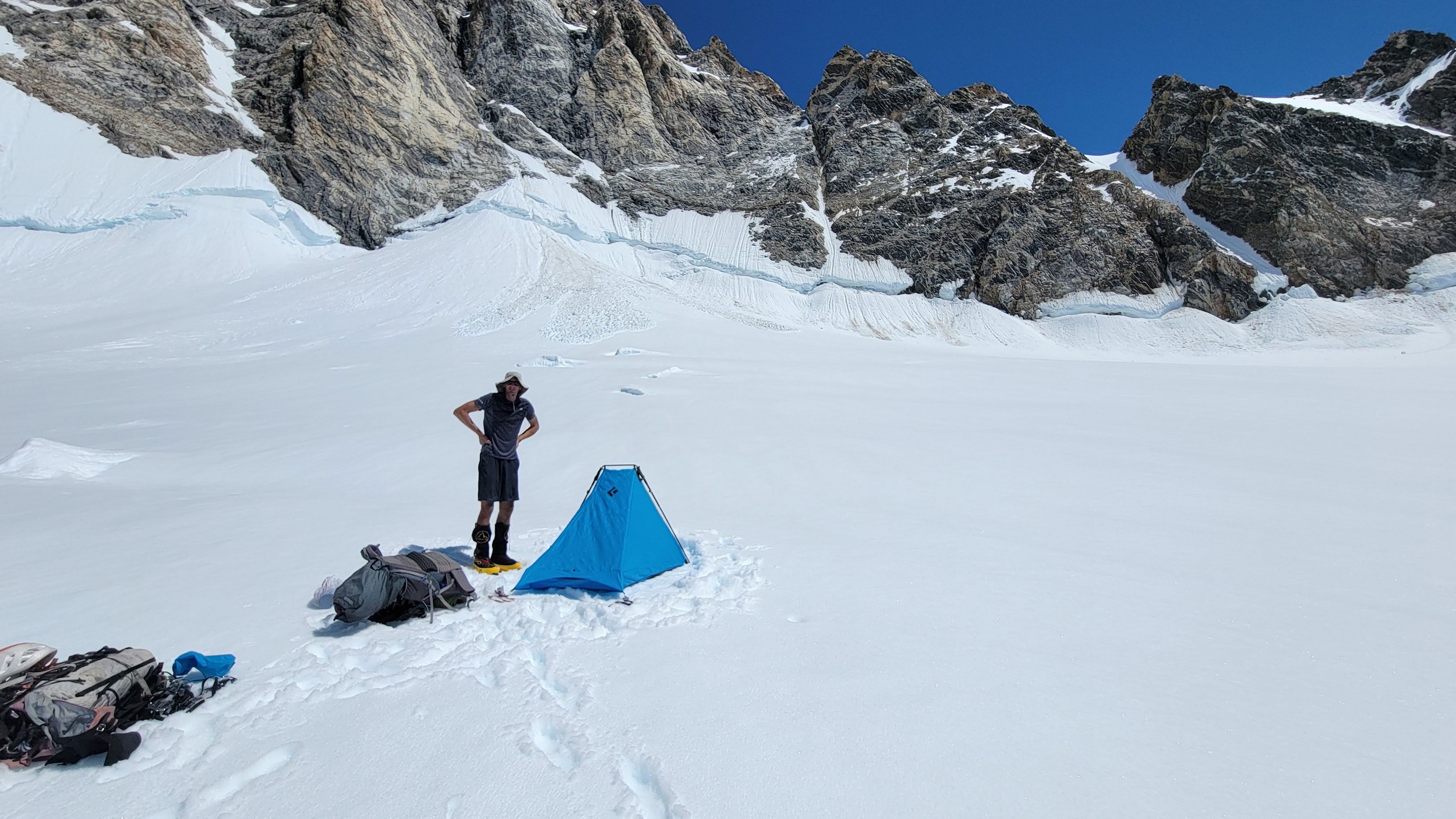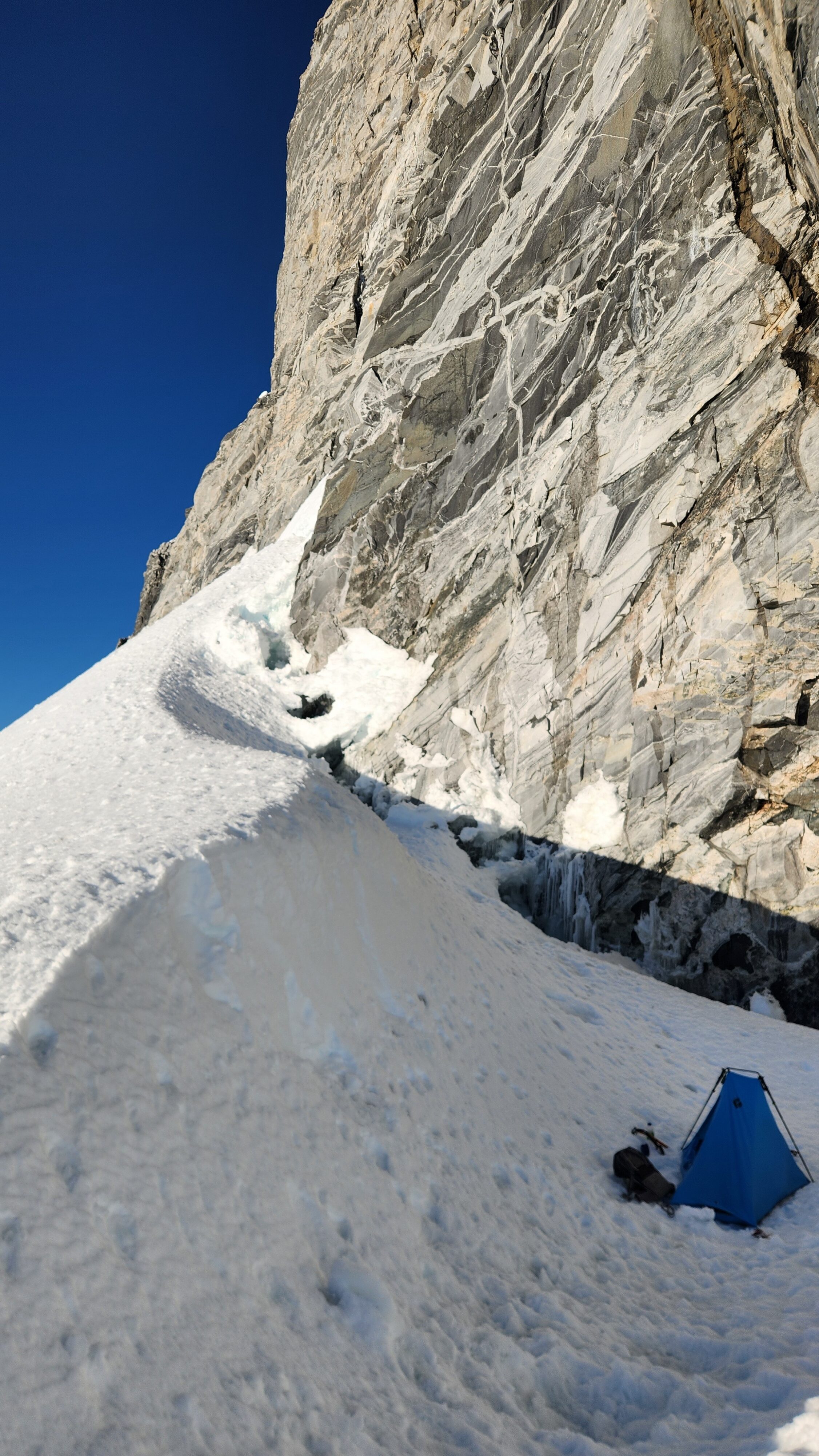 From this point, we started curving rightward and continued up a lower angle slope traversing along the base of the very steep west face of Mount Waddington. Midway up this traverse there was a large crevasse that did require a short vertical step to navigate after cutting way left towards the base of the cliff to find a spot with a snow bridge. Once we got past this one crevasse it was easy walking, however the snow was starting to get soft as we were approaching midday. By about 1:30pm we reached an elevation of 3200 meters right at the base of the start of the south face route. We setup the ultralight test right on the flattest spot on the upper bench as close as possible to the route. A nice afternoon of resting was had and I took a short walk further out to the south to the edge of the upper bench to the low spot in the SW ridge where I could get a good unobstructed view to the south, and a great view of the route behind me to the north. I snapped the photo with the route topo above from this spot and I gained some more confidence after studying it a bit, as all the snow/ice sections on the bottom 2/3 of the route all seemed fairly doable, with just a couple spots that looked challenging where there appeared to be thin bare ice in the entry couloir.