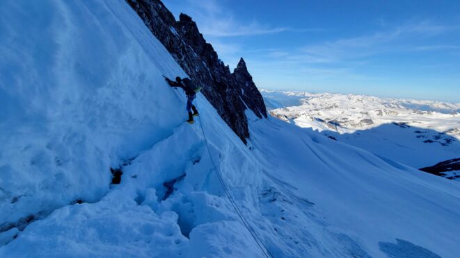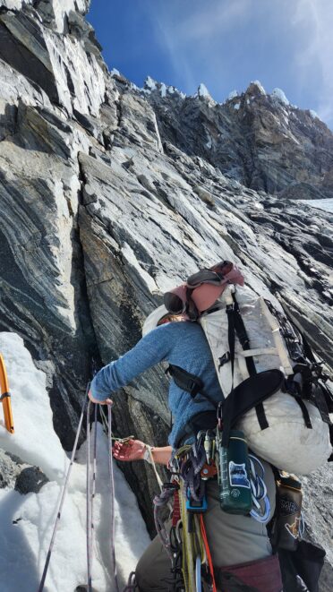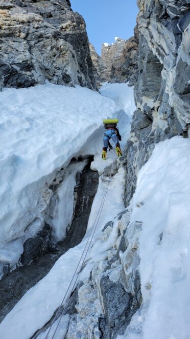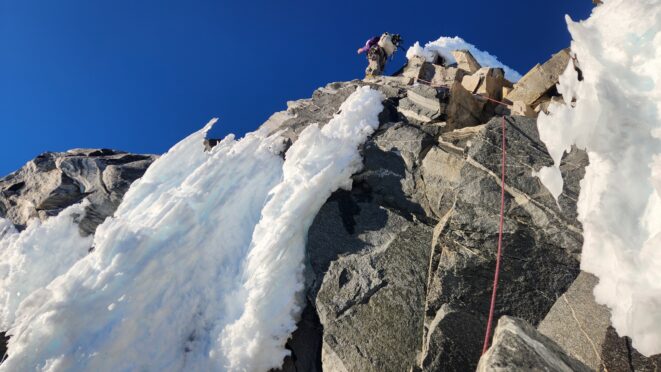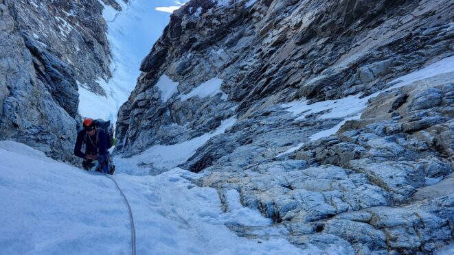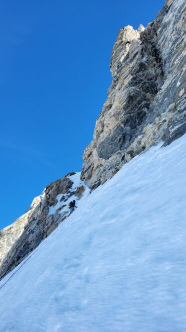 At about 5am we were packed up and started up the entry slopes up to the bergschrund, which thankfully was not a hard crossing. A zig zag to the left, right and then back left on a couple small snow bridges was all it took, then we could begin ascending the long steep couloir. The snow/neve in the couloir was in almost perfect condition offering excellent front pointing. After a few hundred feet of 50 degree climbing we hit the first obstacle, a 25 foot near vertical step where the ice was way too thin to try and climb, so Sarah led a wet and unprotectable rock line just to the right of the thin ice. It took over 30 minutes to get past this short but difficult 5.7 step where only one good cam placement was found.