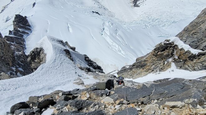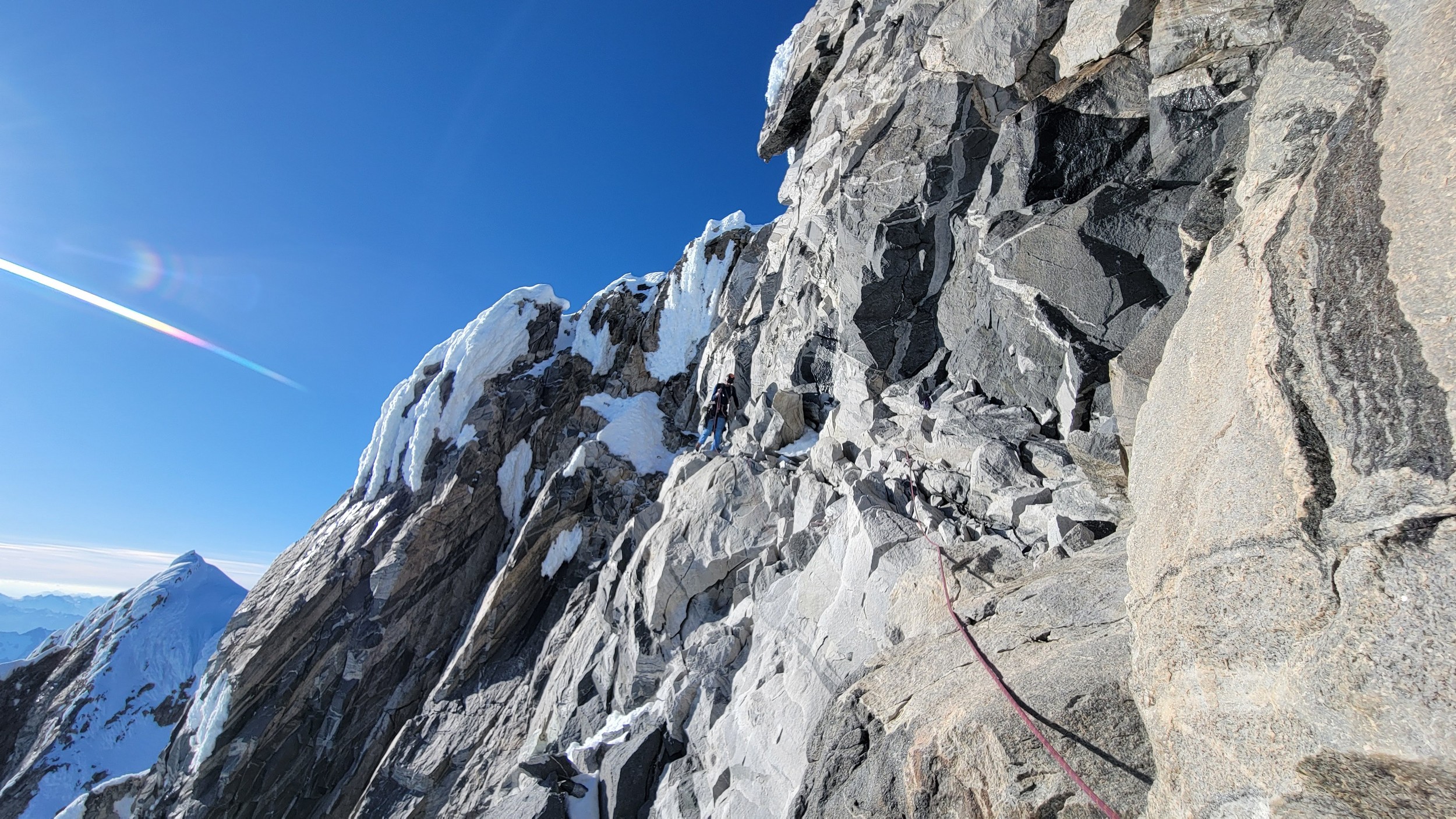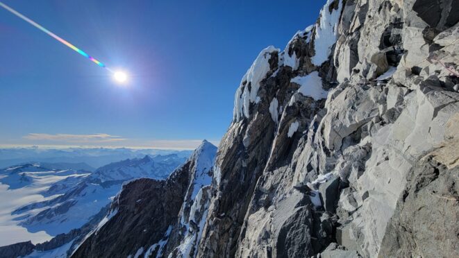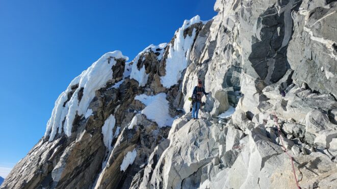 We regrouped at the top of the right gully as it looked improbably to continue traversing right and the ridge crest was an easy climb less than 1 pitch above us, but we were unsure how the remaining ridge crest would be to complete the traverse to the summit, which we knew was still off to our right. So Sarah setup an anchor and we made a short rappel into the narrow but deep notch further right which was the top of the amphitheater we climbed to the left of down lower. Thankfully after a 50 foot rappel or so, we found a nice ledge system that traversed rightward around the final difficulty from the notch. Rounding the next corner we found lower angle ramp/blocky terrain for one final pitch that took us right to the summit, which we reached about 8pm.