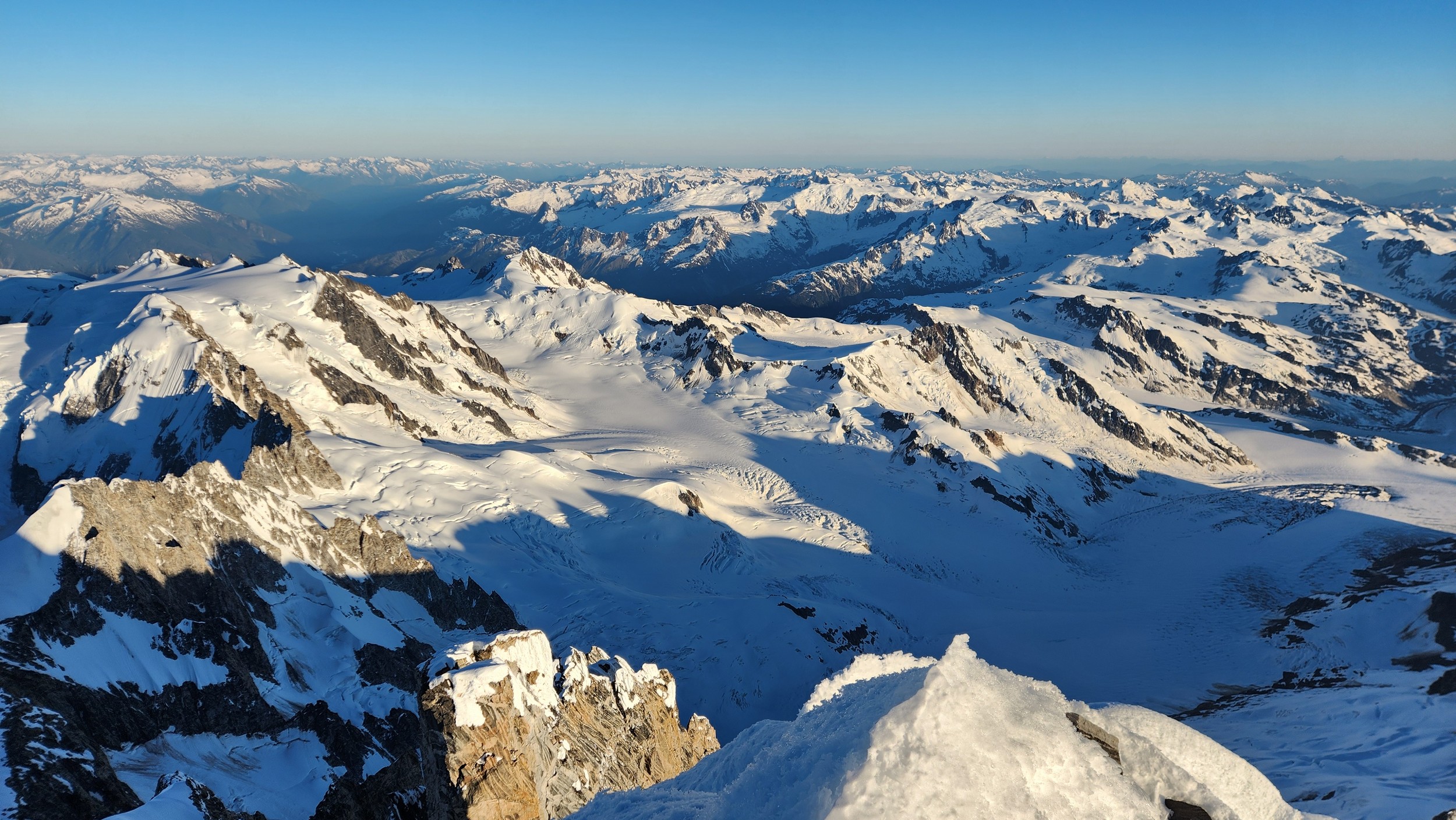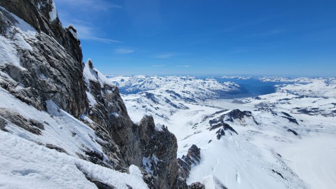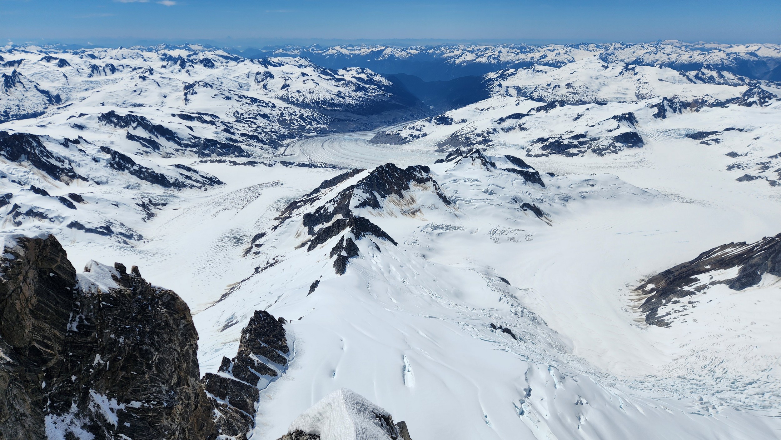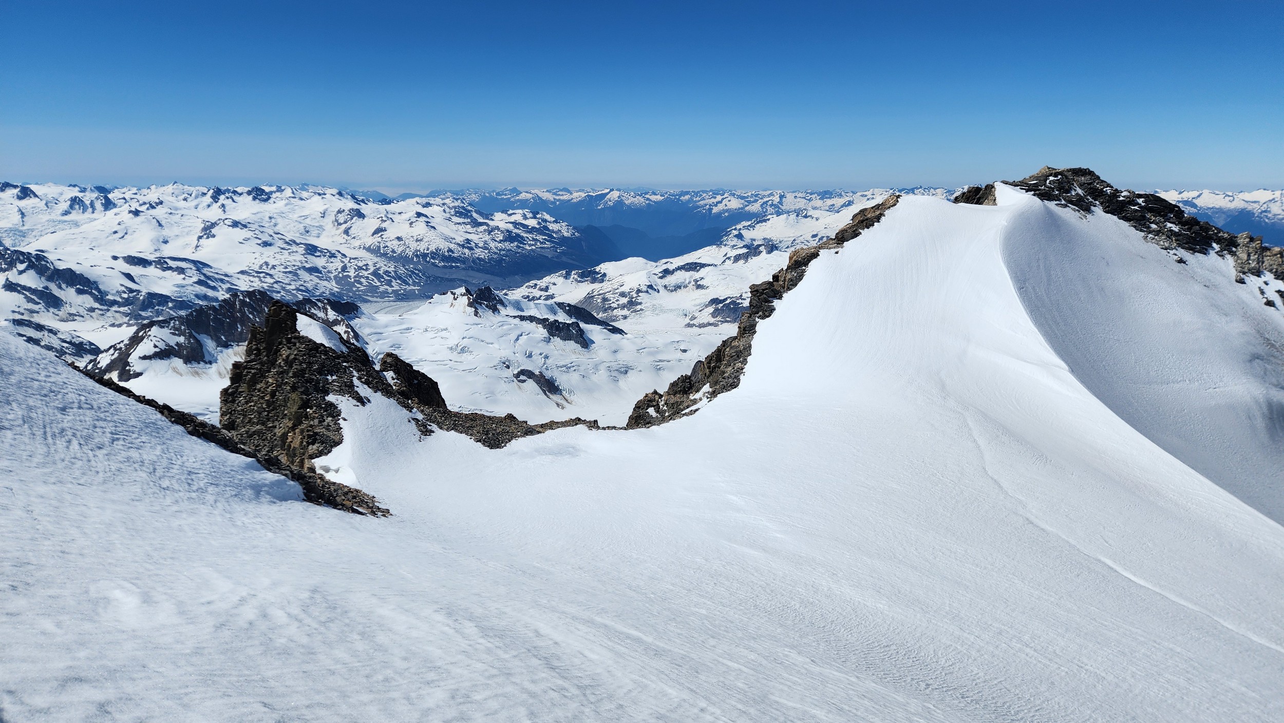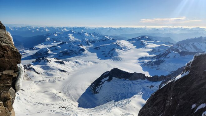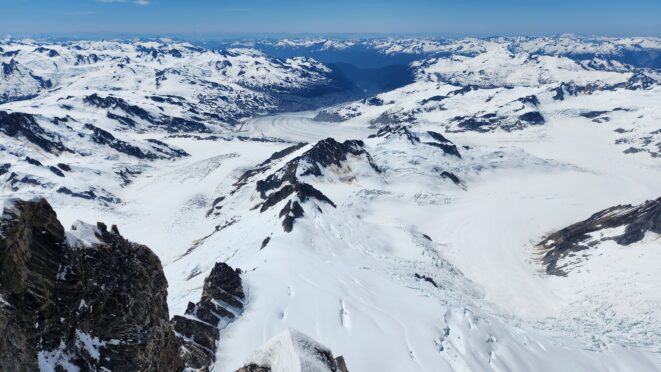 I had a range of emotions once we were on the summit. A combination of excitement, hippieness and relief. I had been trying to climb this mountain for many years, and had even driven up to the White Saddle air ranch in 2019 and camped out on their lawn for nearly a week in the rain without ever flying in due to the awful weather. Sarah and I knew we couldn't stay long as we were going to have a long blind descent as darkness was setting in, but we made the most of the 15 minutes we stayed. The views were awe inspiring, with dozens of peaks that looked like the north cascades on steroids. The one thing that stood out the most was the Tooth, a narrow and imposing spire along the spine of Mount Waddington that we were unable to appreciate from the west or at any point on route.