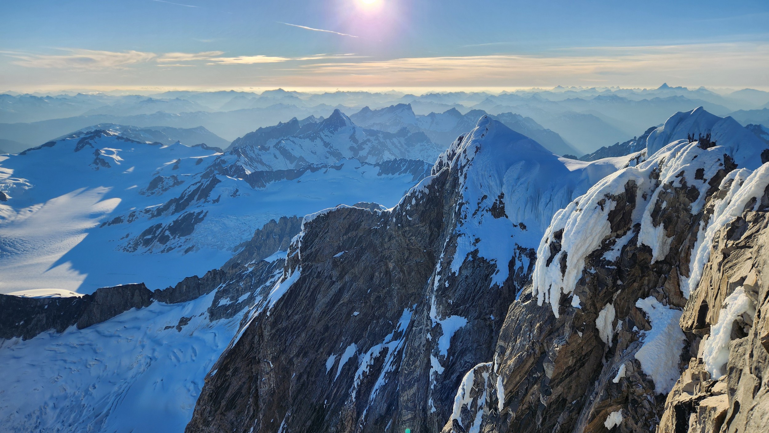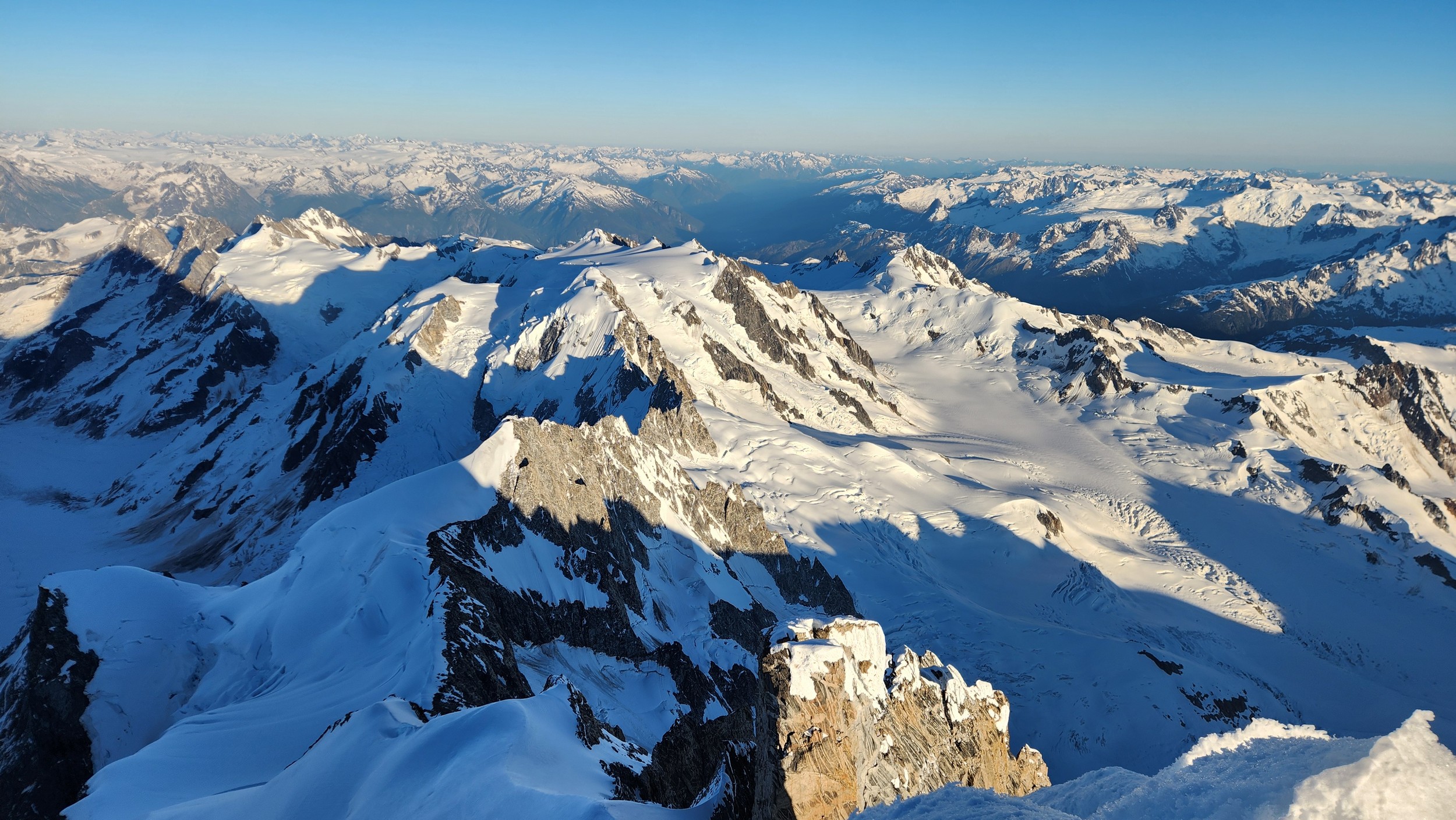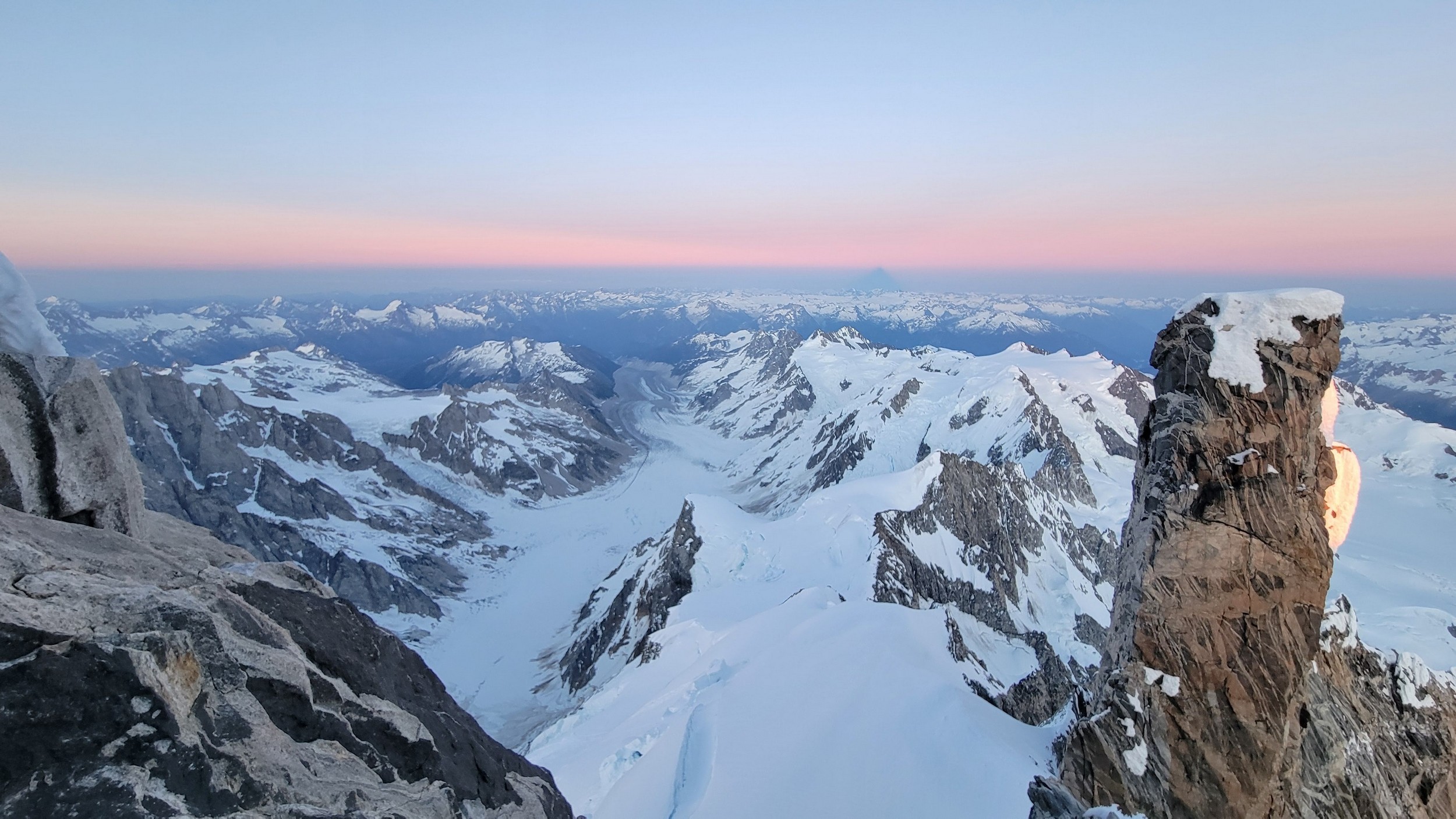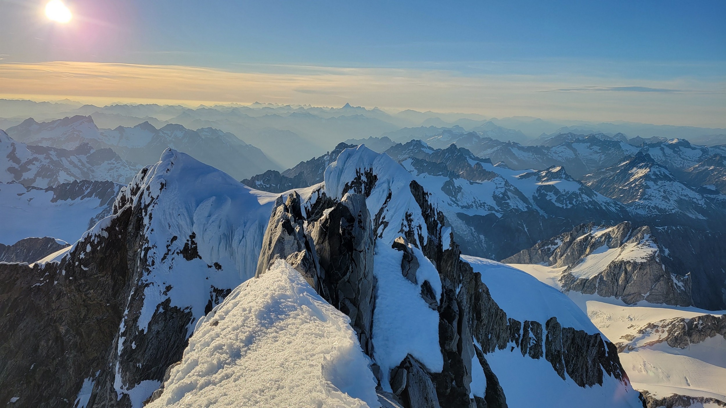 I had a range of emotions once we were on the summit. A combination of excitement, hippieness and relief. I had been trying to climb this mountain for many years, and had even driven up to the White Saddle air ranch in 2019 and camped out on their lawn for nearly a week in the rain without ever flying in due to the awful weather. Sarah and I knew we couldn't stay long as we were going to have a long blind descent as darkness was setting in, but we made the most of the 15 minutes we stayed. The views were awe inspiring, with dozens of peaks that looked like the north cascades on steroids. The one thing that stood out the most was the Tooth, a narrow and imposing spire along the spine of Mount Waddington that we were unable to appreciate from the west or at any point on route.