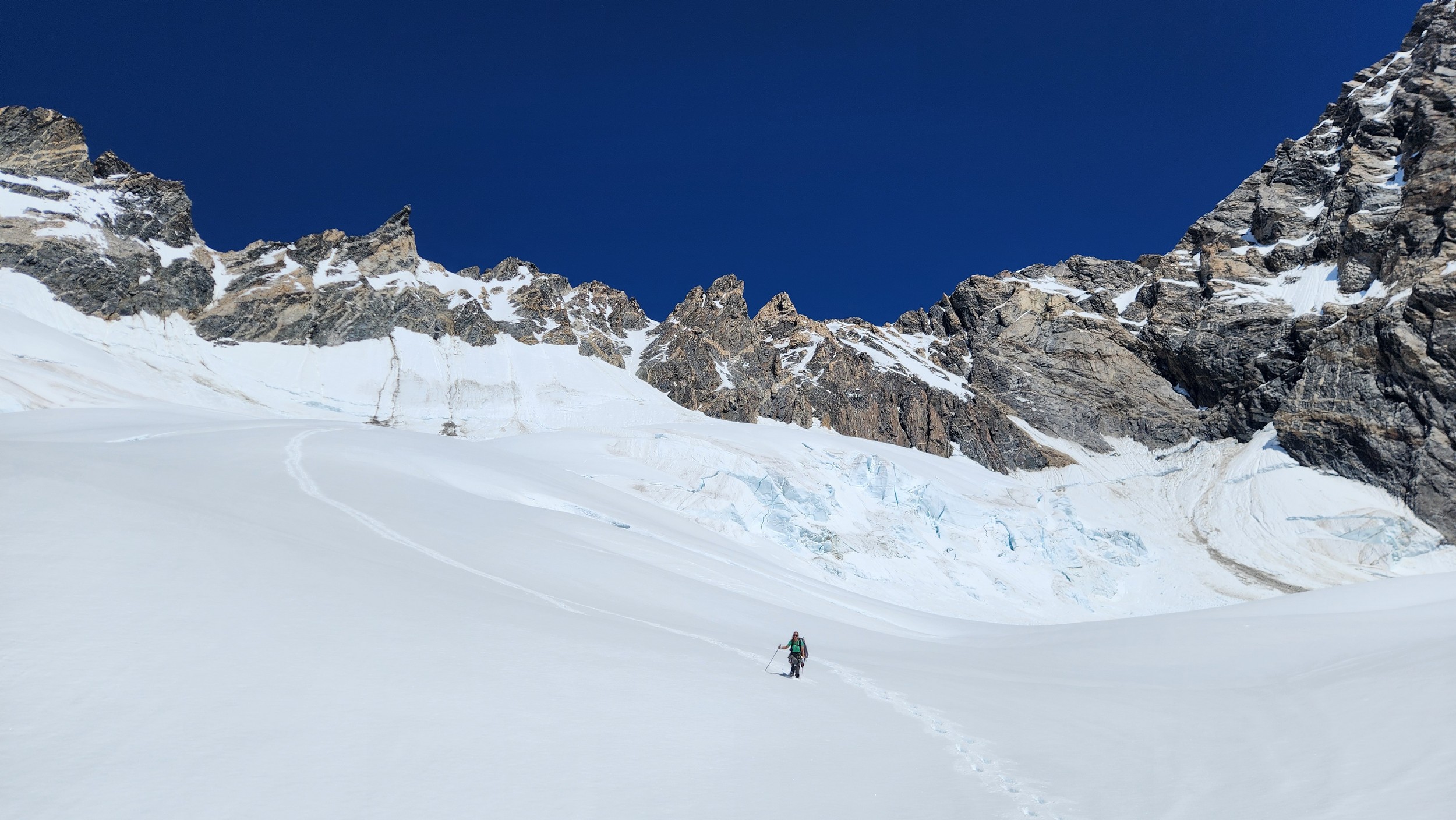 As we hiked up the lower Dais Glacier, we started crossing small crevasses right away. The flat bench on the glacier below the headwall separating the long expanse of low elevation valley glacier with the upper bench at the base of the steep faces of Waddington quickly turned into steeper snow covered slopes. The left side of the glacier offered as much more feasible approach to the upper bench from what we could see from the helicopter as we flew in. In hindsight, the far right side would have also worked as well, and may actually have been shorter. We started up and passed below the south face of Regal Dome, and continued northeast until we got to the base of the couloir dropping from the north from the small col immediately east of Councillor Peak. We took a good look up this couloir as we would utilize this on our descent, and it actually looked very straightforward which provided some relief knowing we would have an easy descent once we can get to that point.