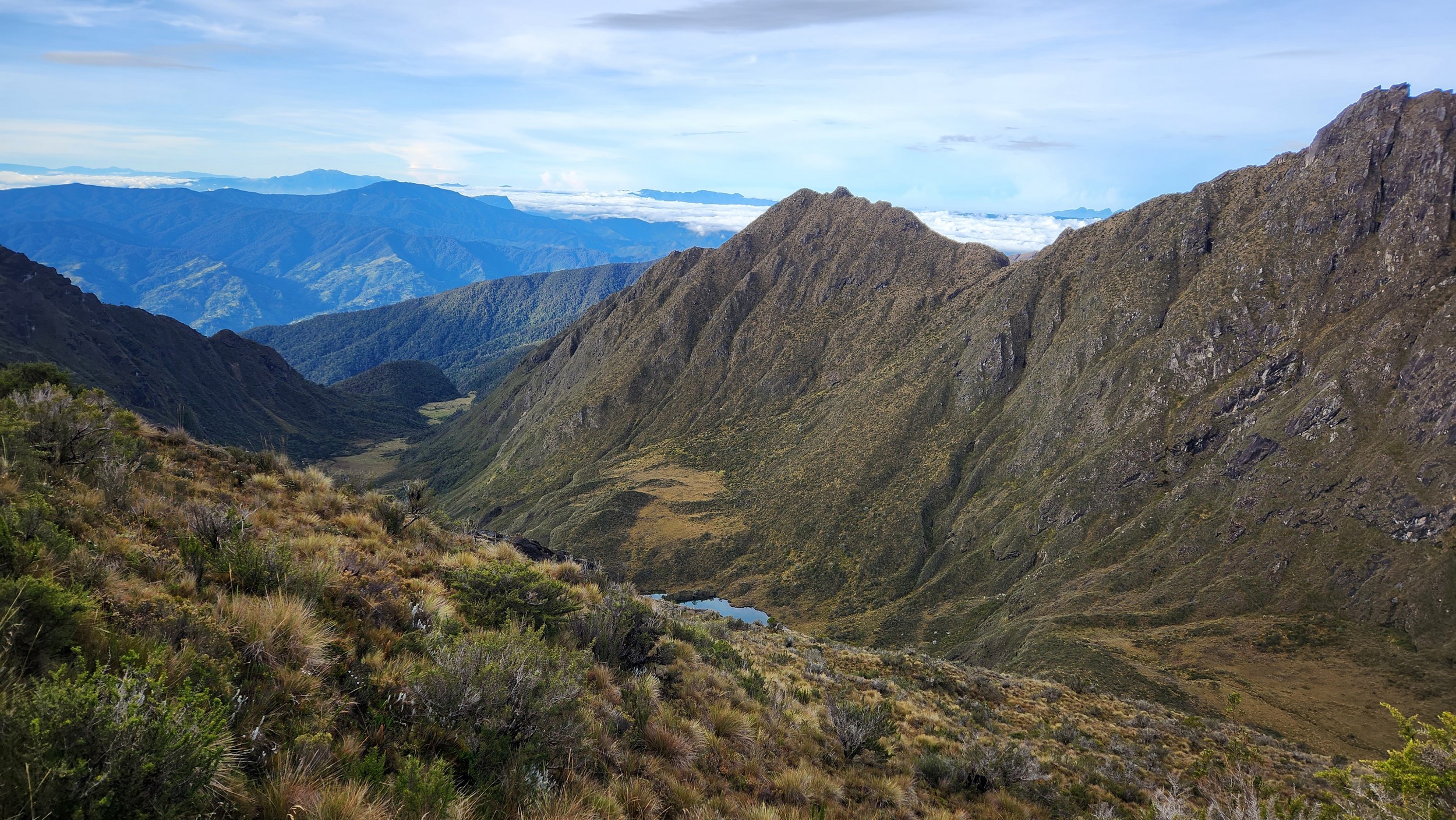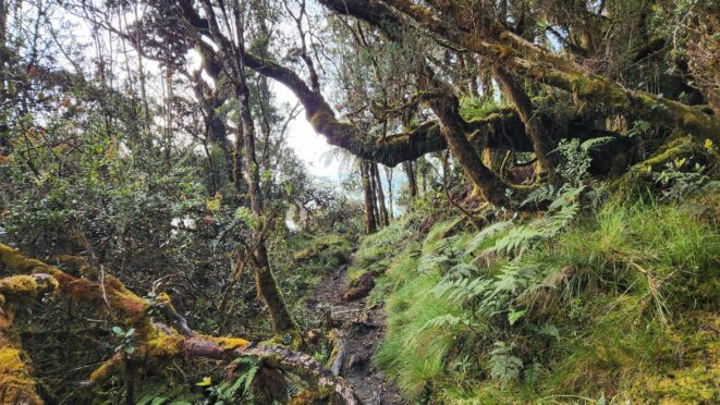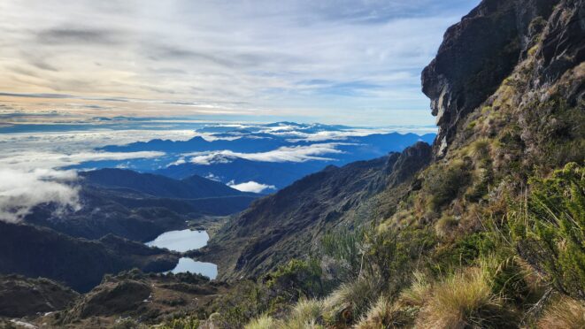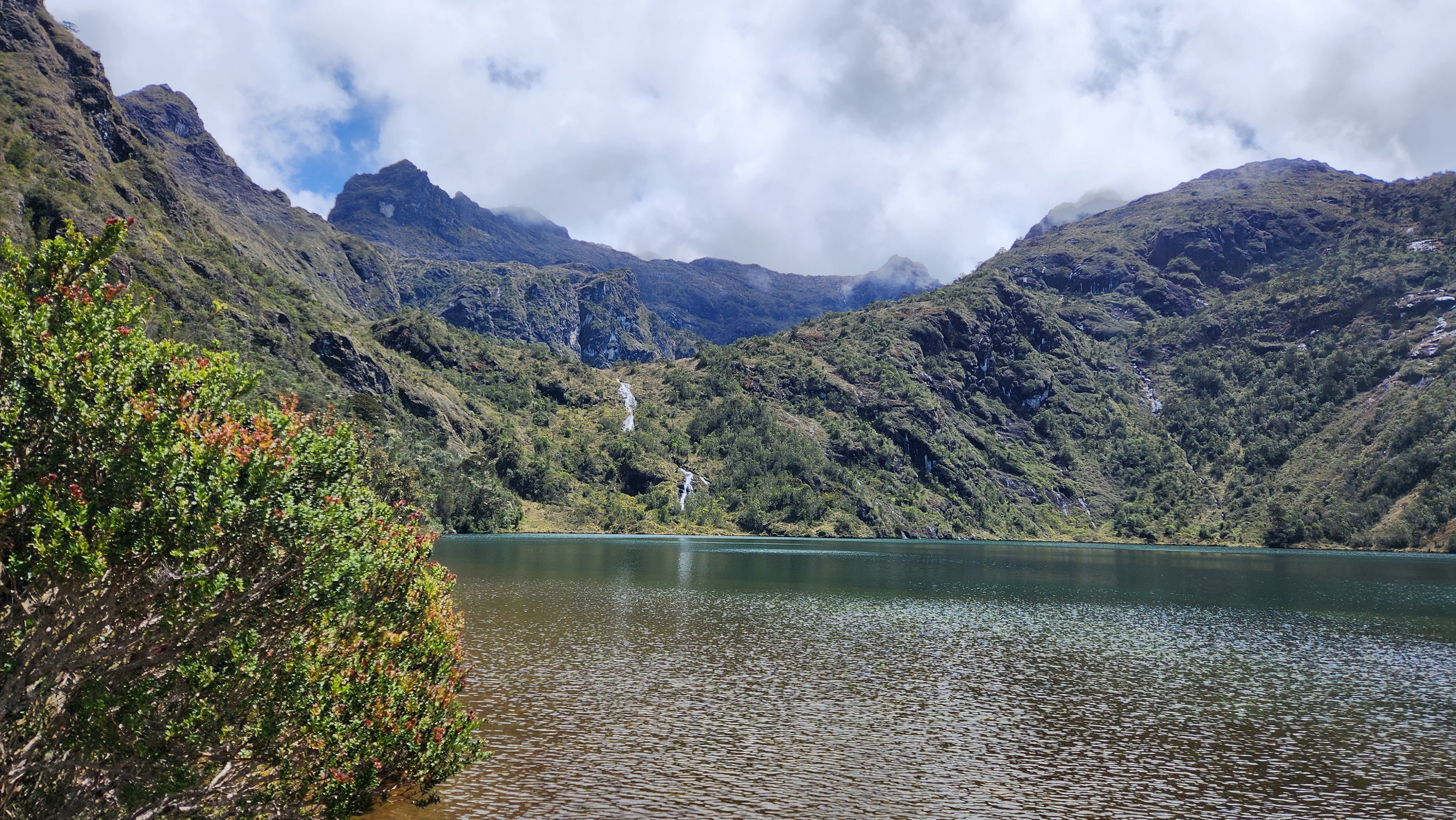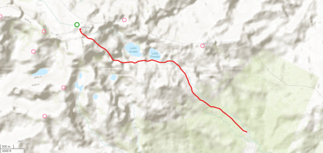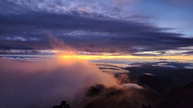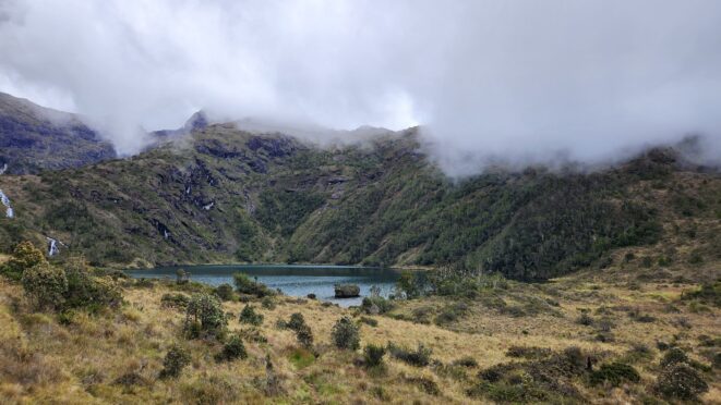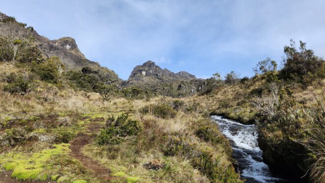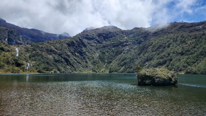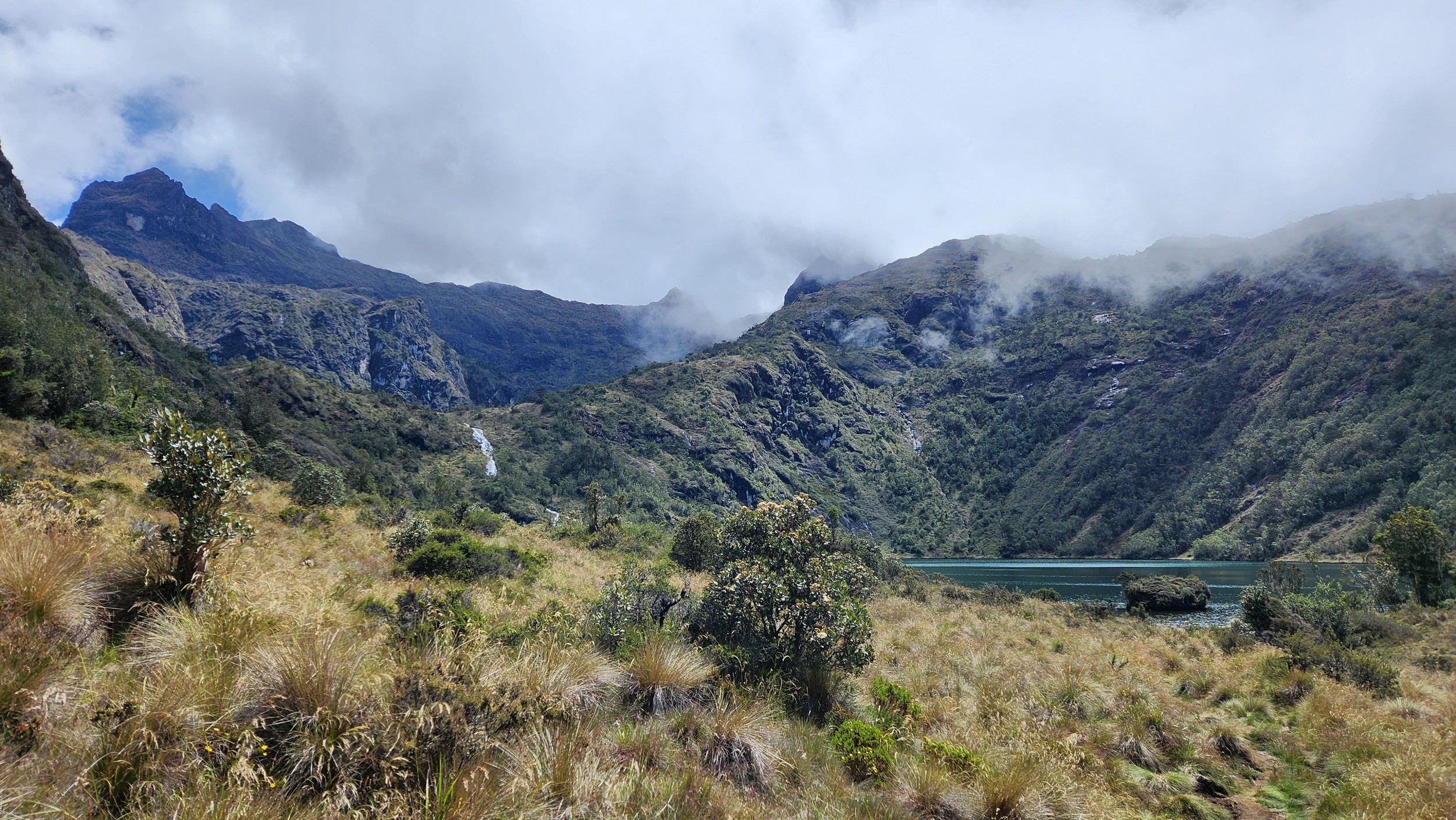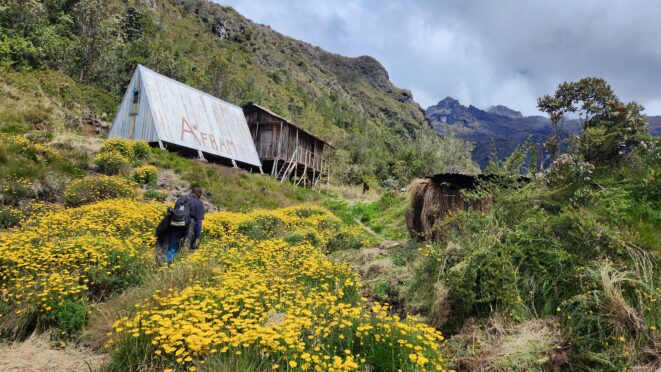 The next morning my local guide (required to have) met me at the lodge. He had simply just walked up from the village down the road and we started hiking up the gentle forested slopes along the edge of Bettys farmland. Starting elevation was at 9170 feet and the trail leading to the northwest was easy to follow and in good condition as we made our way towards the first of two lakes at 11,750 feet where a couple small huts offer a place to escape the rain for the night. It only took us a few hours to reach the hut, and the forested hike up to this point was not too exciting, but once we arrived at the lake it was a beautiful serene place to enjoy the early afternoon sun to nap before some clouds and rain showers rolled in. At that point we went back to the hut and made a quick dinner. It got dark early due to the very close proximity to the equator so we went to sleep early at 7pm with a 4am wake up.