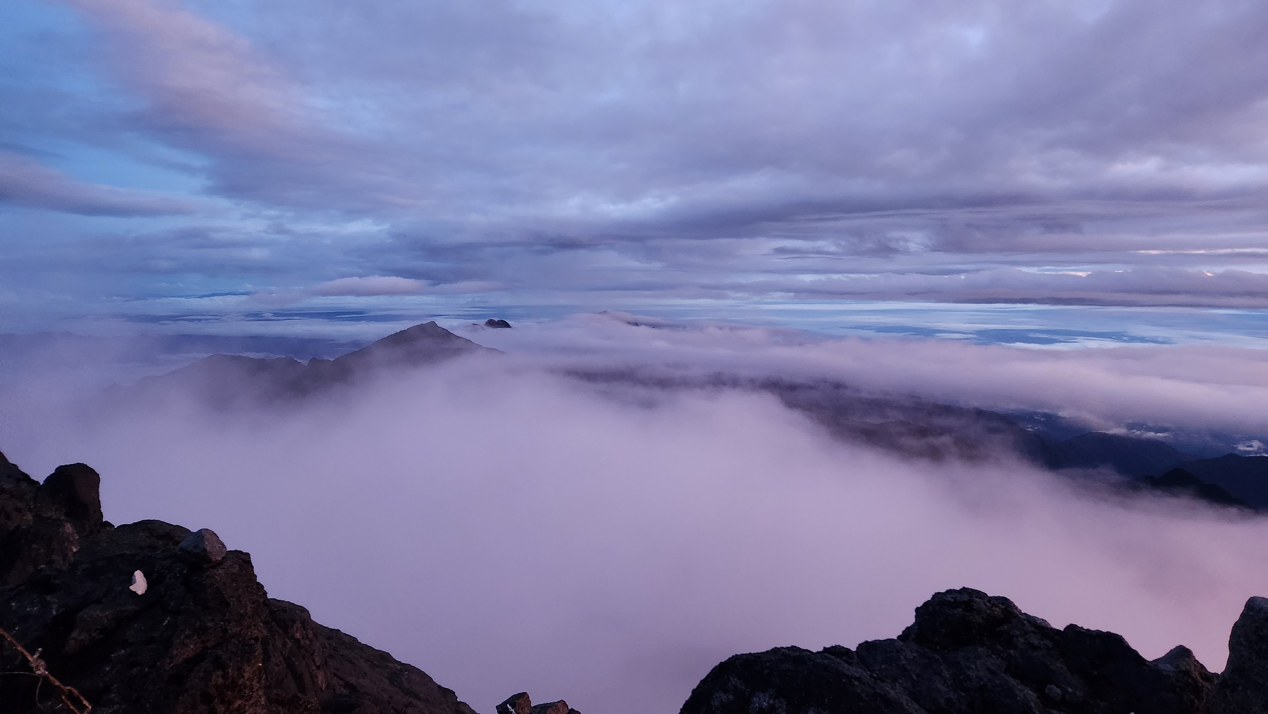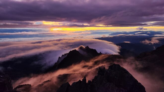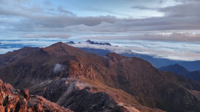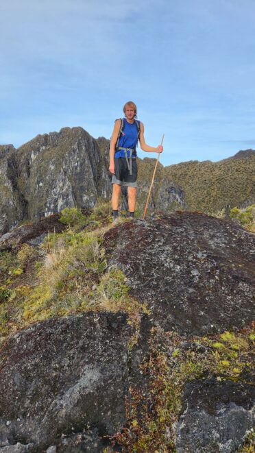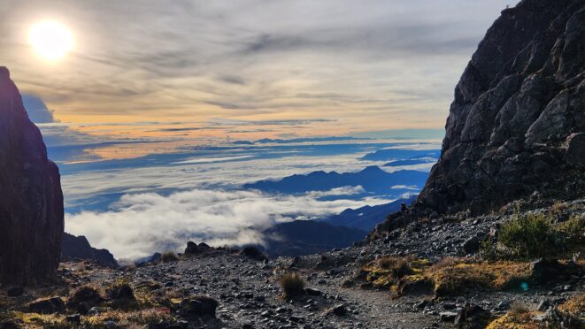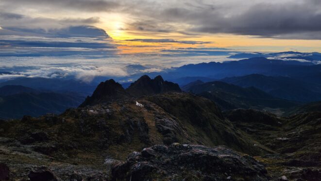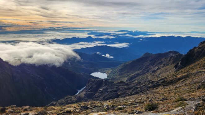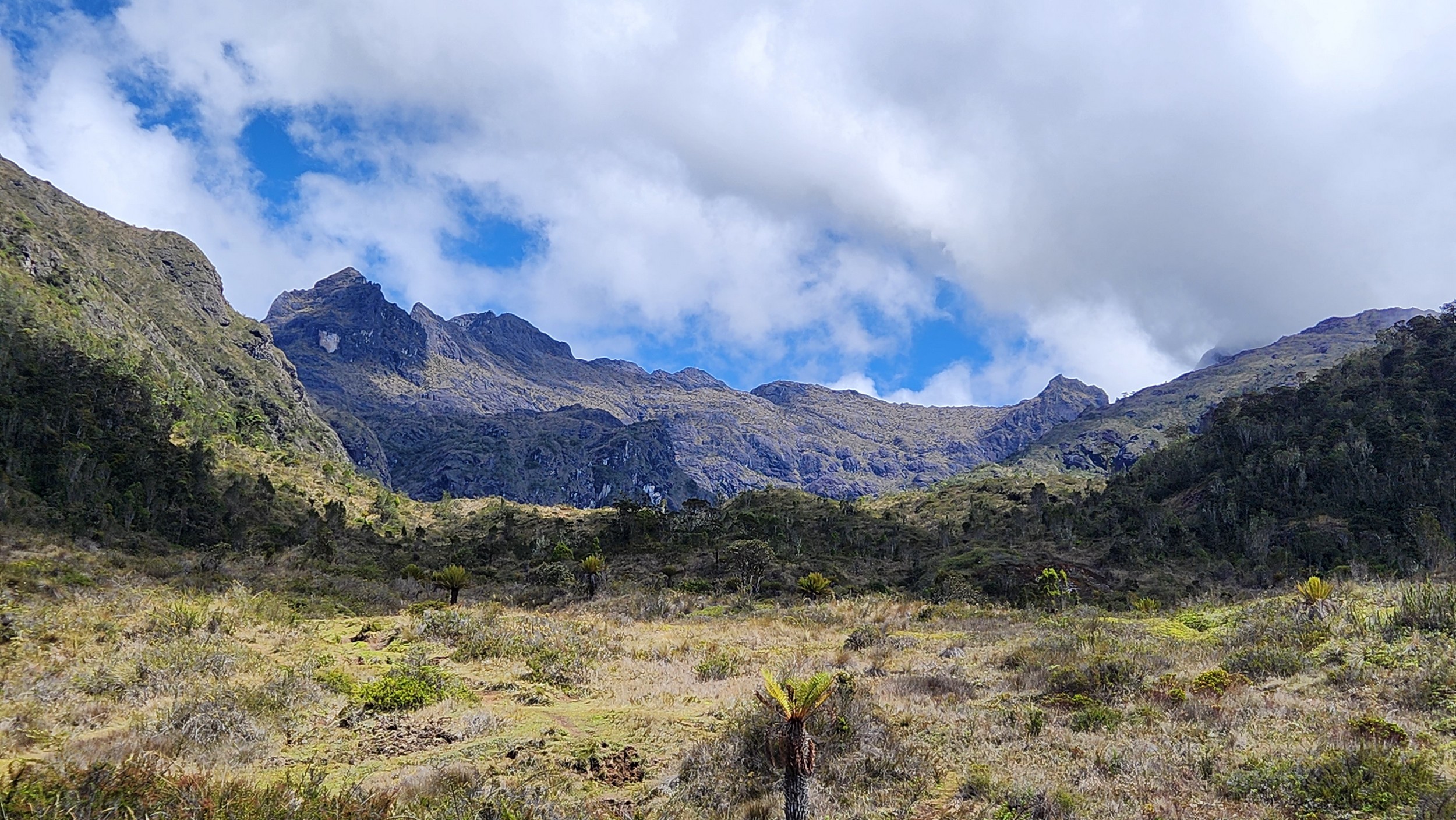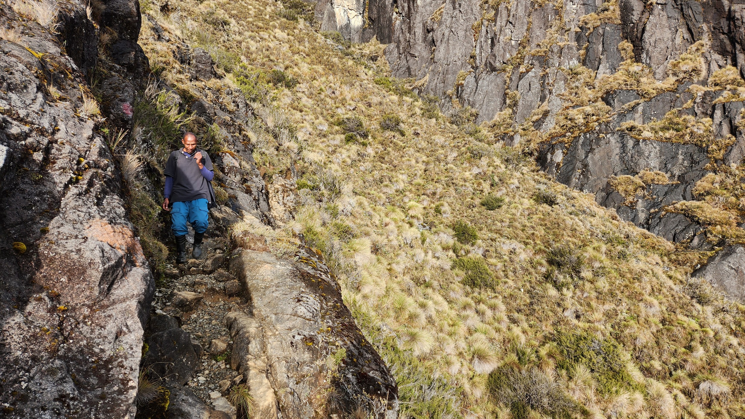 The next morning my local guide (required to have) met me at the lodge. He had simply just walked up from the village down the road and we started hiking up the gentle forested slopes along the edge of Bettys farmland. Starting elevation was at 9170 feet and the trail leading to the northwest was easy to follow and in good condition as we made our way towards the first of two lakes at 11,750 feet where a couple small huts offer a place to escape the rain for the night. It only took us a few hours to reach the hut, and the forested hike up to this point was not too exciting, but once we arrived at the lake it was a beautiful serene place to enjoy the early afternoon sun to nap before some clouds and rain showers rolled in. At that point we went back to the hut and made a quick dinner. It got dark early due to the very close proximity to the equator so we went to sleep early at 7pm with a 4am wake up.
