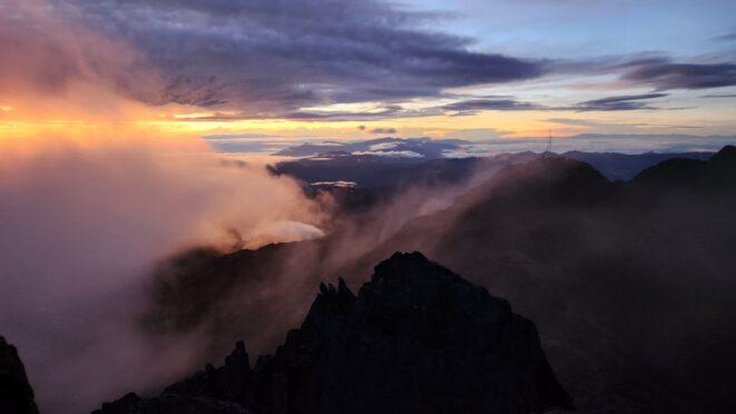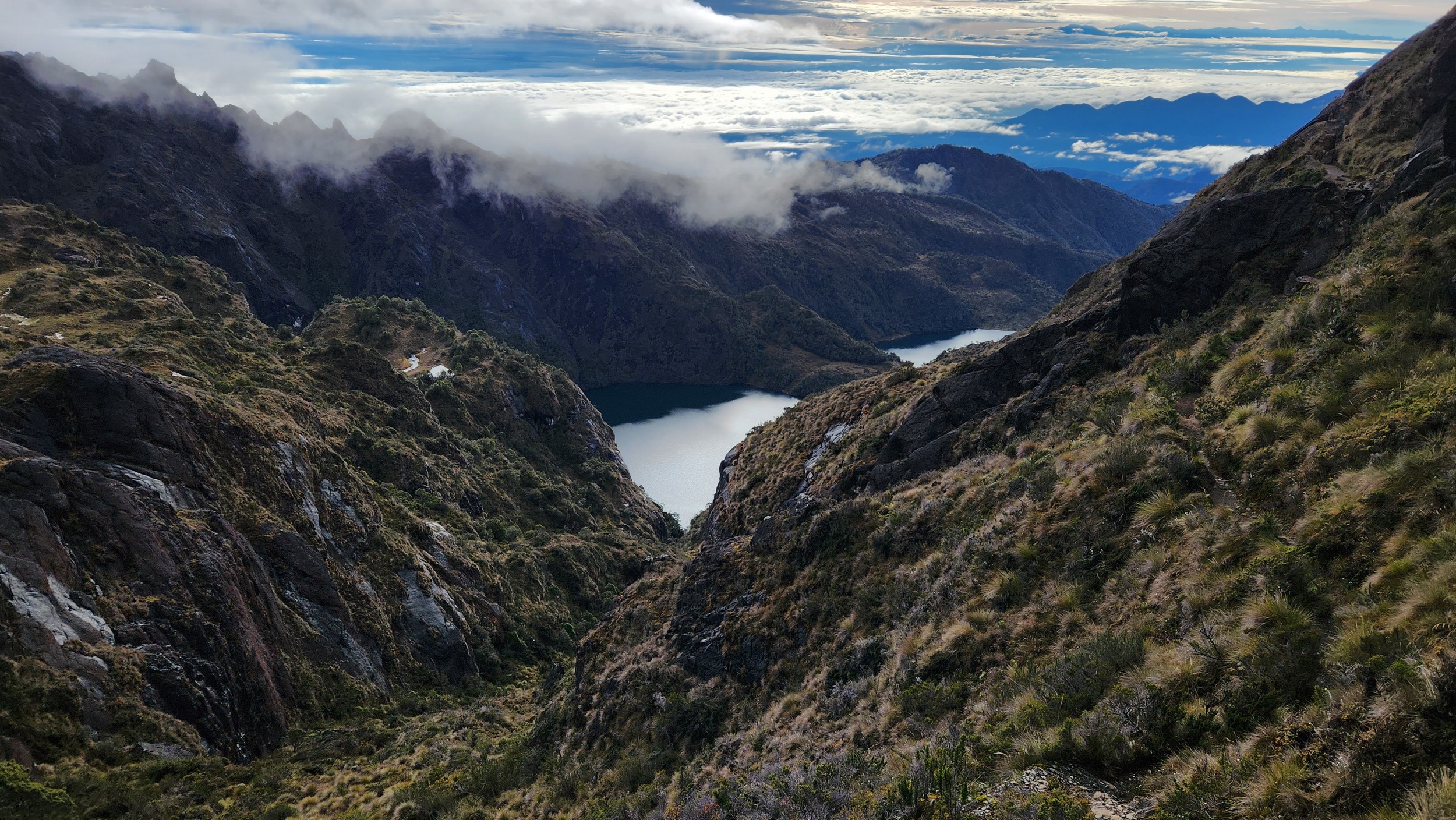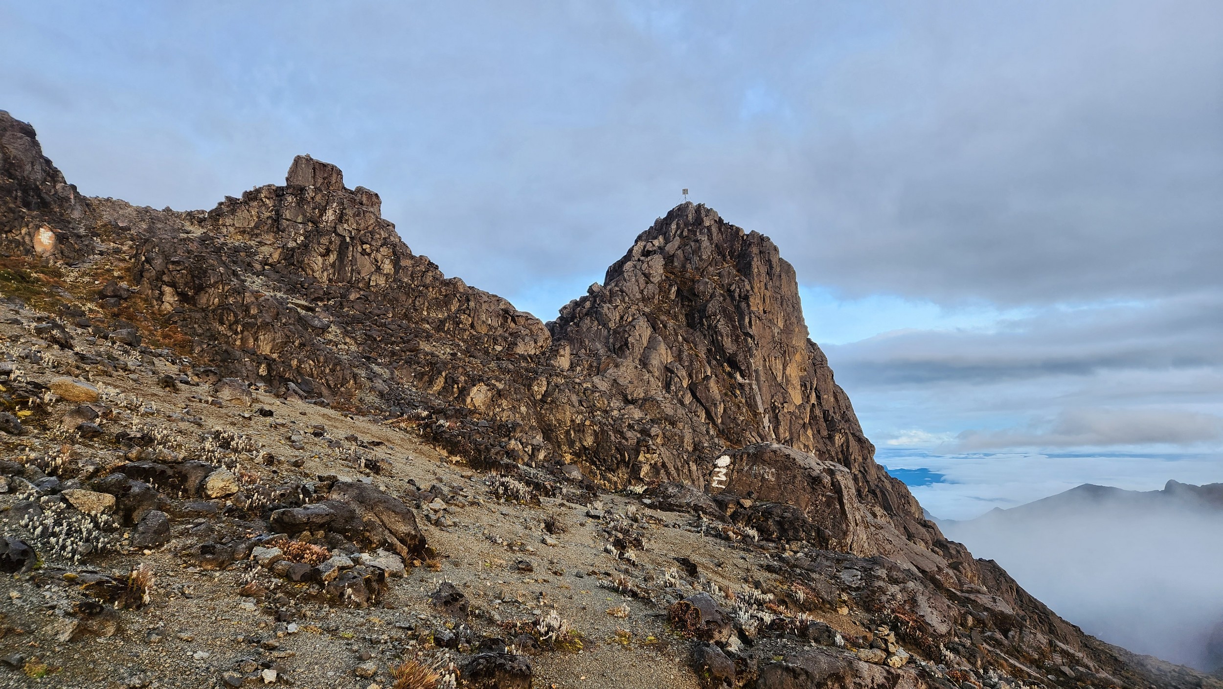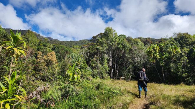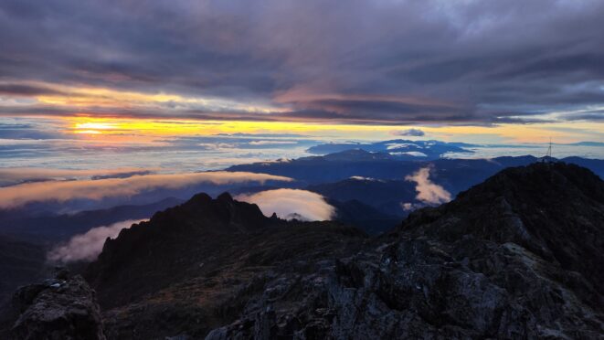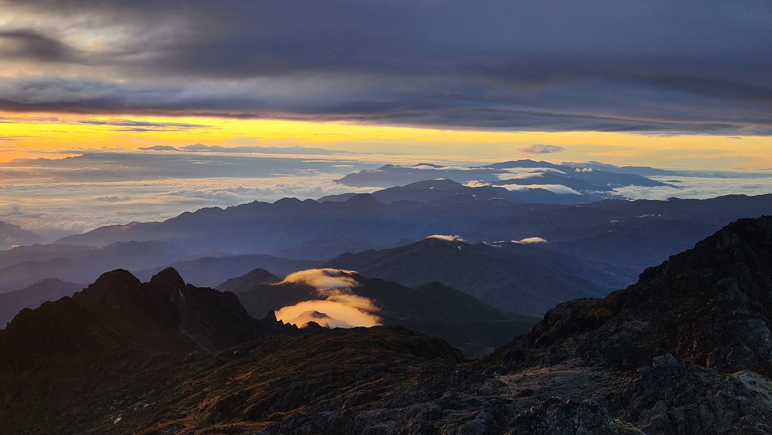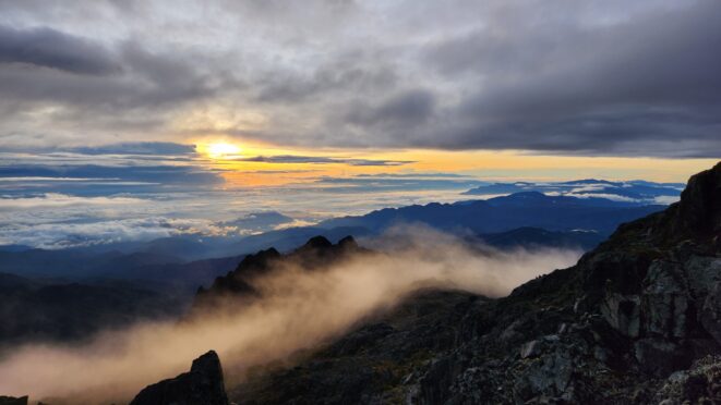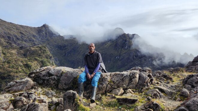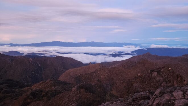 The next morning my local guide (required to have) met me at the lodge. He had simply just walked up from the village down the road and we started hiking up the gentle forested slopes along the edge of Bettys farmland. Starting elevation was at 9170 feet and the trail leading to the northwest was easy to follow and in good condition as we made our way towards the first of two lakes at 11,750 feet where a couple small huts offer a place to escape the rain for the night. It only took us a few hours to reach the hut, and the forested hike up to this point was not too exciting, but once we arrived at the lake it was a beautiful serene place to enjoy the early afternoon sun to nap before some clouds and rain showers rolled in. At that point we went back to the hut and made a quick dinner. It got dark early due to the very close proximity to the equator so we went to sleep early at 7pm with a 4am wake up.