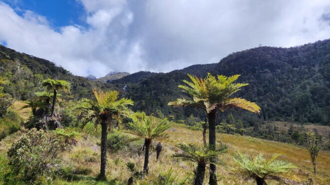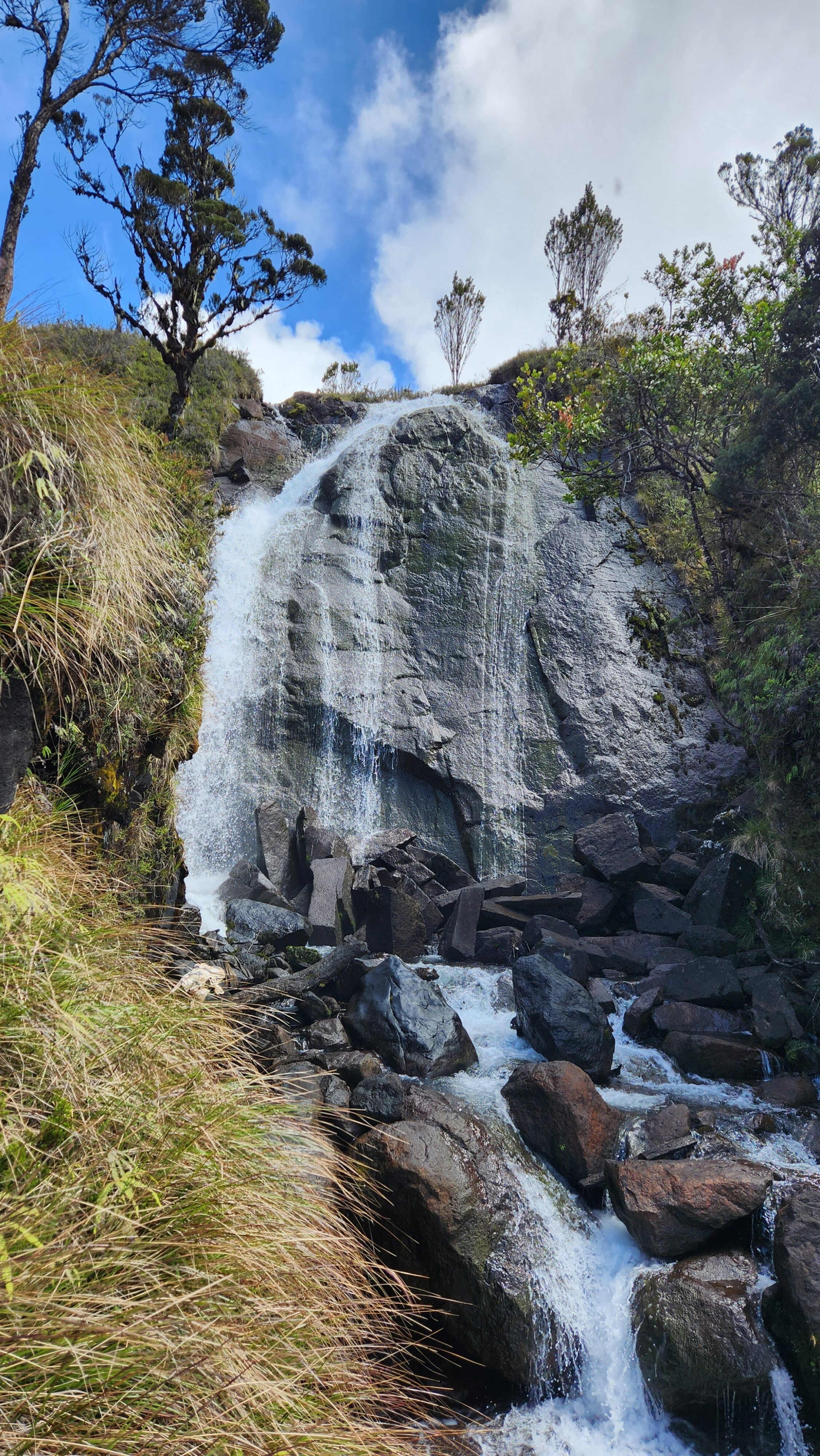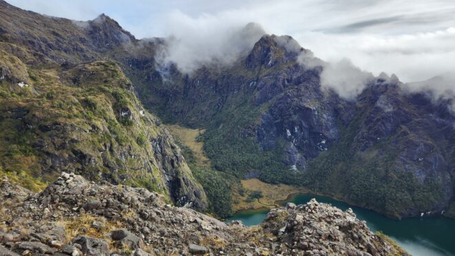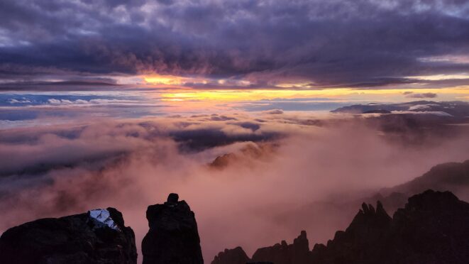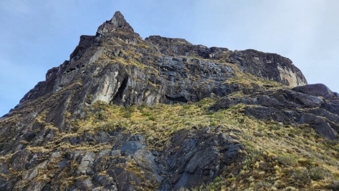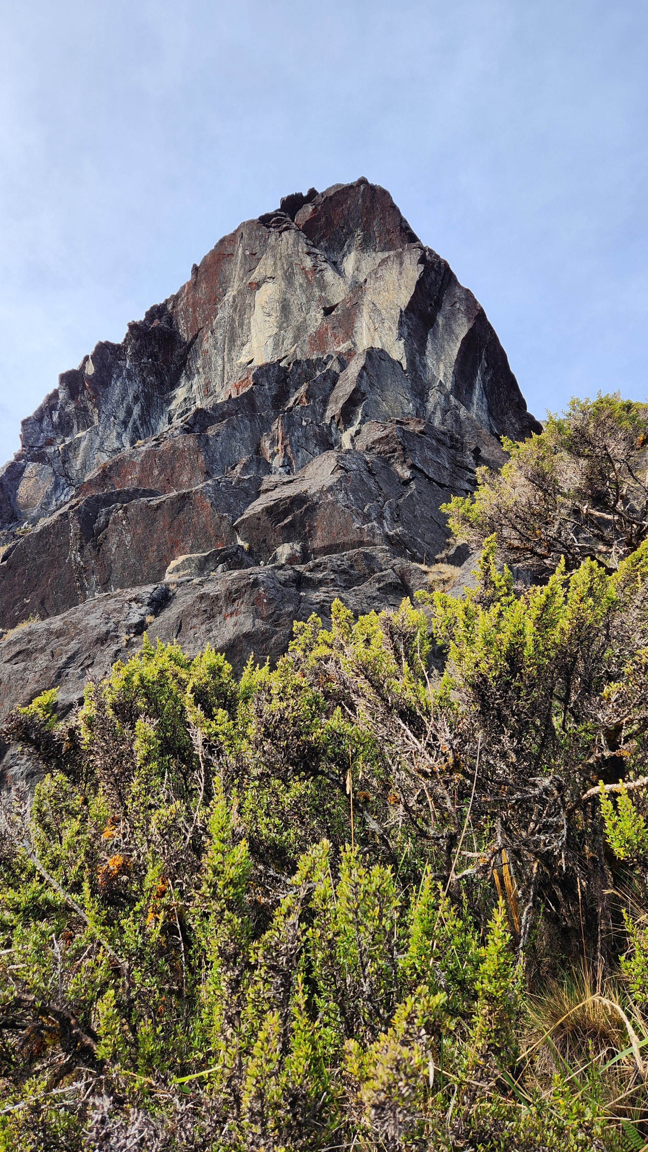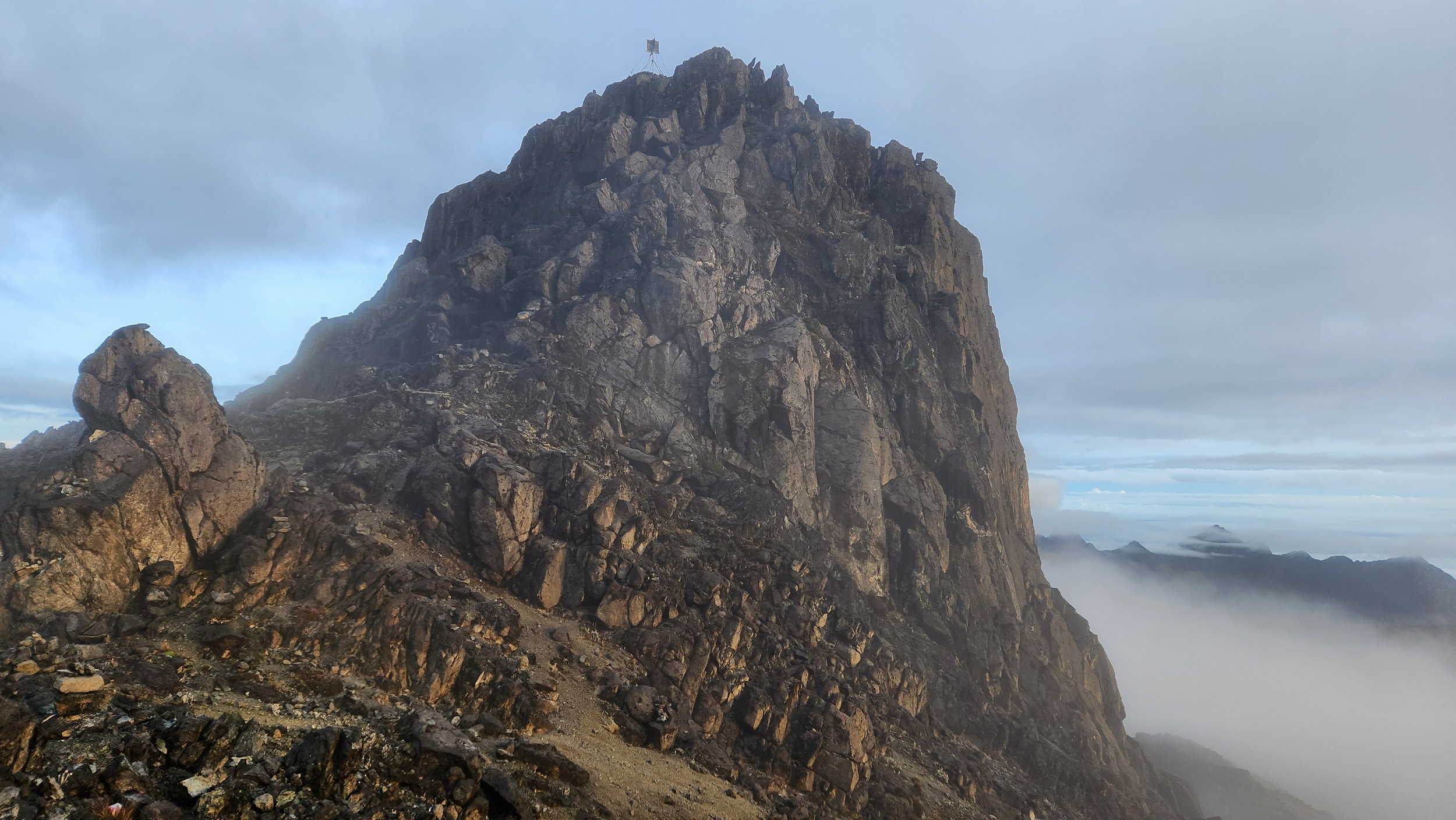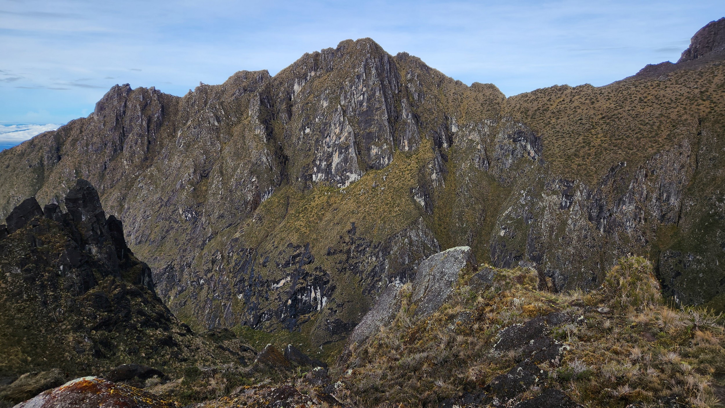 The next morning my local guide (required to have) met me at the lodge. He had simply just walked up from the village down the road and we started hiking up the gentle forested slopes along the edge of Bettys farmland. Starting elevation was at 9170 feet and the trail leading to the northwest was easy to follow and in good condition as we made our way towards the first of two lakes at 11,750 feet where a couple small huts offer a place to escape the rain for the night. It only took us a few hours to reach the hut, and the forested hike up to this point was not too exciting, but once we arrived at the lake it was a beautiful serene place to enjoy the early afternoon sun to nap before some clouds and rain showers rolled in. At that point we went back to the hut and made a quick dinner. It got dark early due to the very close proximity to the equator so we went to sleep early at 7pm with a 4am wake up.