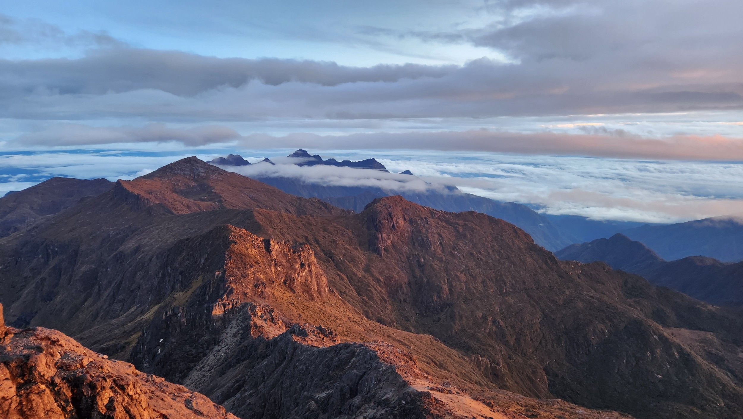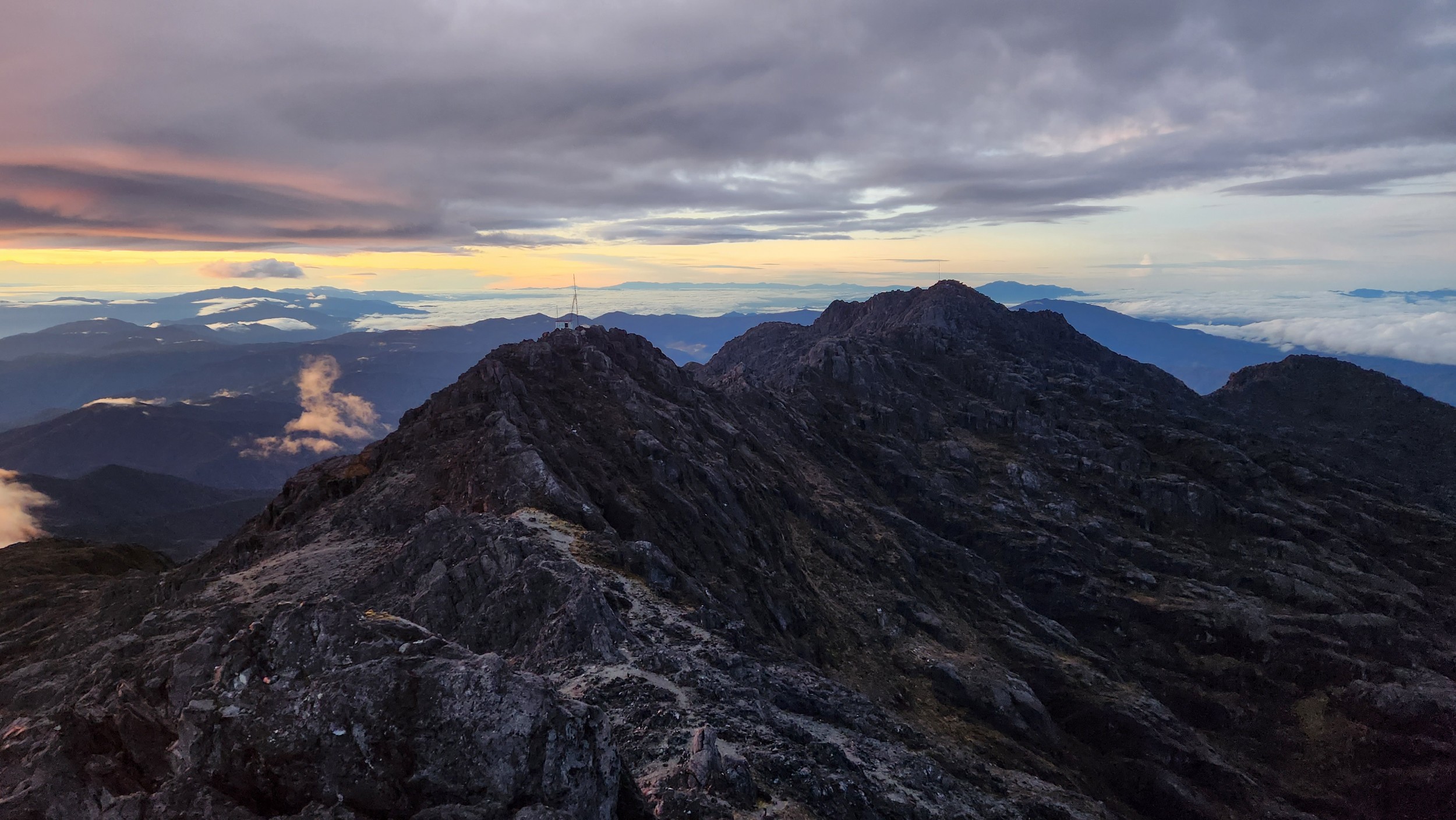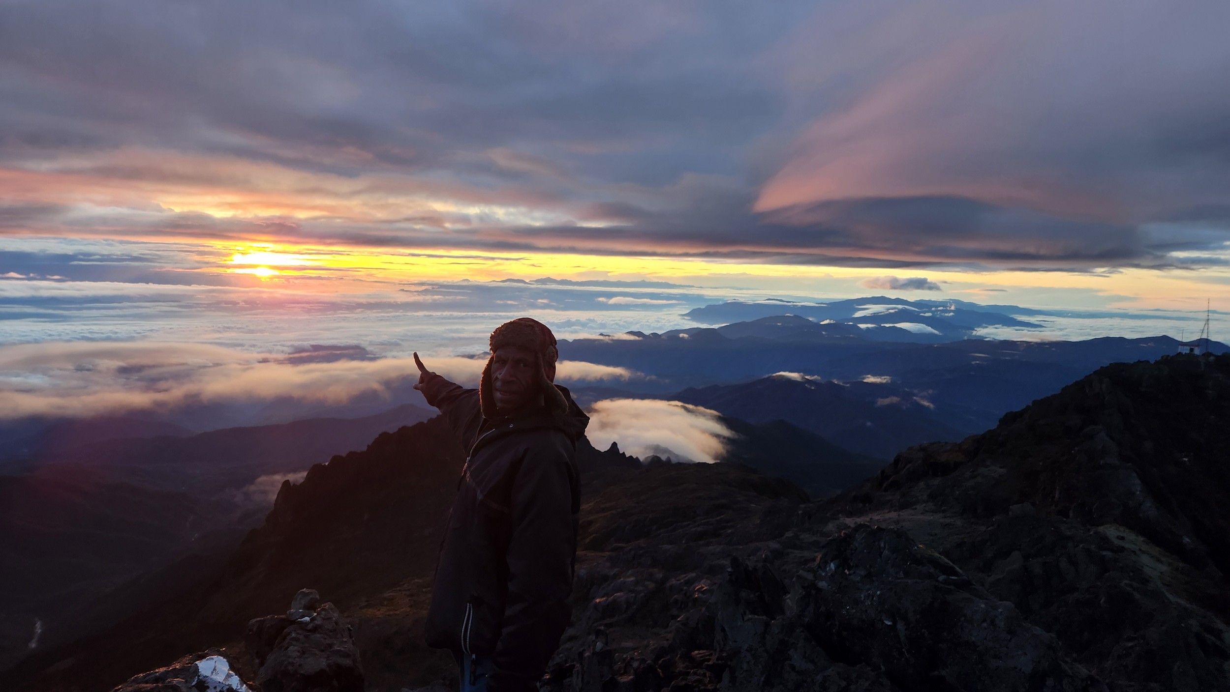 Early the following morning, we followed the trail as it initially ascended steeply up above the left of the lakes and onto the broad ridge above. The trail never actually went right next to the upper lake, but there was a great view of it (on the way down). Of course we were headed up in the dark. The route to the summit was very easy, following a nice trail all the way to the final summit block area. It was somewhat longer than I expected, but very low angle most of the way. Twilight started showing enough light to where we didn't need our headlights anymore just as we reached the final short scramble, which involved a short class 3 gully after looping around to the west side of the summit block (shady side in the wee morning hours). Map below shows the route, and the painting on the wall of Bettys lodge is also shown below! We reached the summit just before sunrise, and had a brilliant sunrise view from the top, similar to my experience on Puncak Jaya just to the west (which unfortunately the air was a bit too hazy to see that far away). It was chilly though and my hands got a bit cold taking photos, so after just 30 minutes we started down. The hike back to the hut, and then back to Bettys lodge was quick and scenic. The guide only asked for $50 and each night at the lodge was about $30 per night which included meals. Al in all an affordable endeavor, however the transport would have been double the price if I wasn't lucky as Betty just happened to be getting transport to Mt Hagen with the opposite itinerary as when I was coming in.