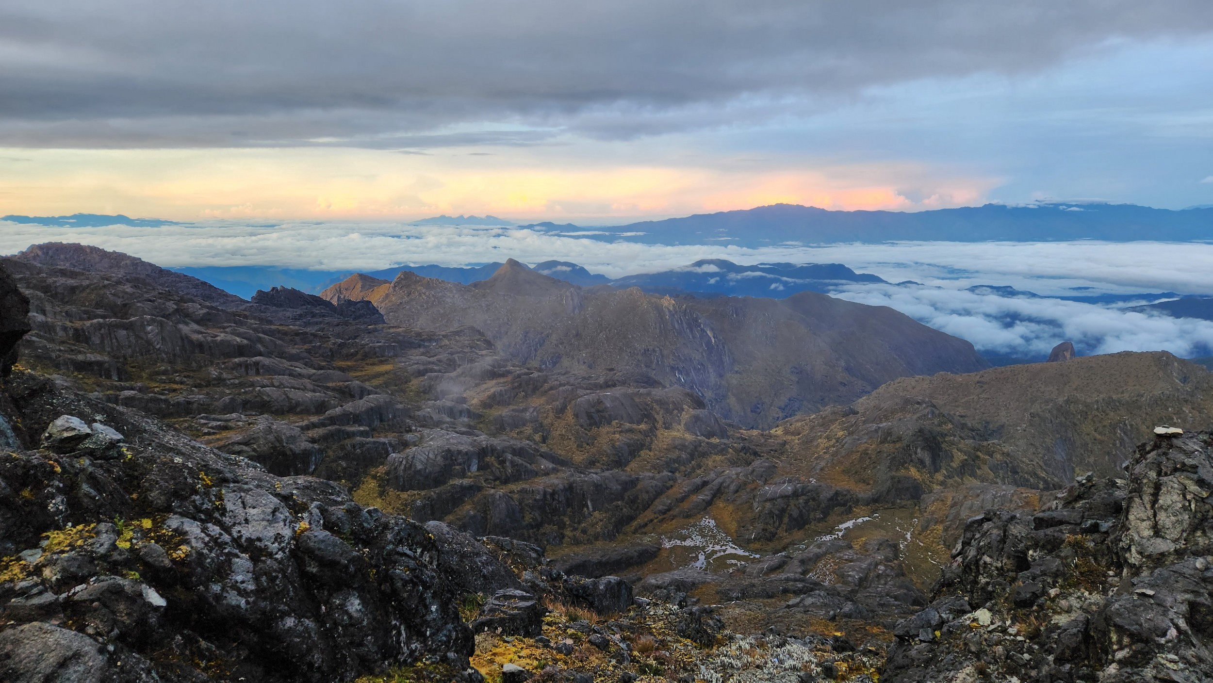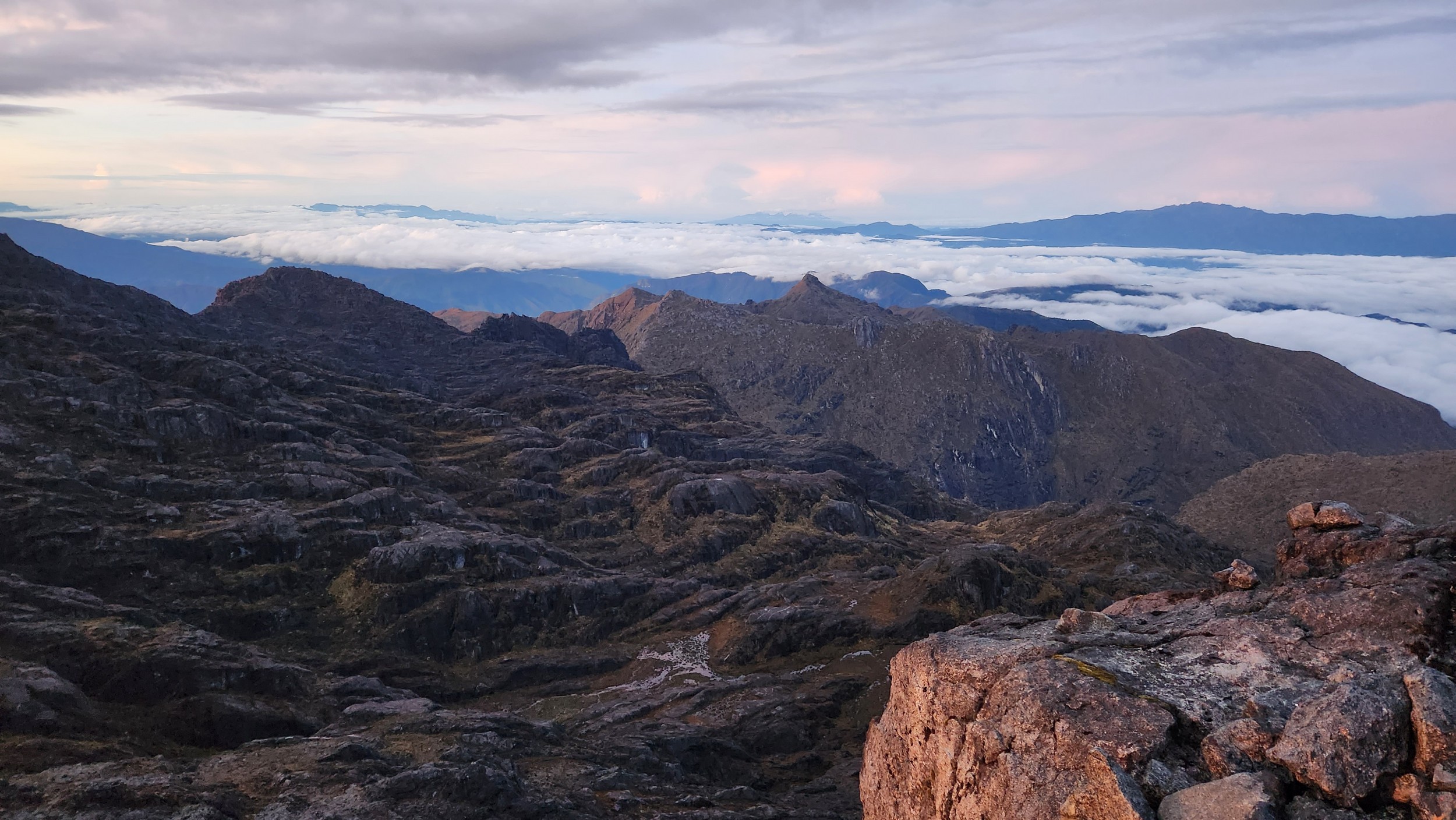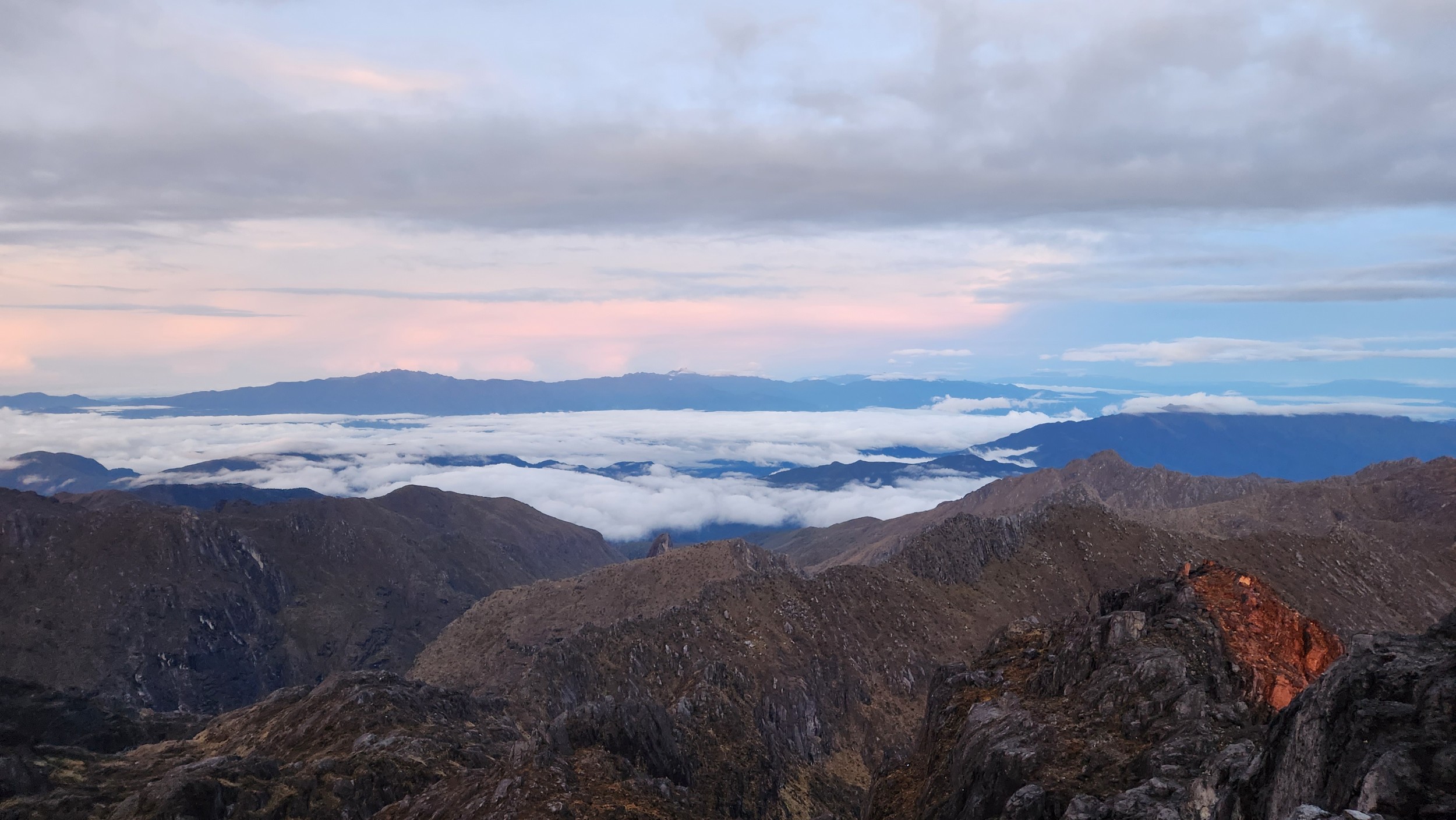 Early the following morning, we followed the trail as it initially ascended steeply up above the left of the lakes and onto the broad ridge above. The trail never actually went right next to the upper lake, but there was a great view of it (on the way down). Of course we were headed up in the dark. The route to the summit was very easy, following a nice trail all the way to the final summit block area. It was somewhat longer than I expected, but very low angle most of the way. Twilight started showing enough light to where we didn't need our headlights anymore just as we reached the final short scramble, which involved a short class 3 gully after looping around to the west side of the summit block (shady side in the wee morning hours). Map below shows the route, and the painting on the wall of Bettys lodge is also shown below! We reached the summit just before sunrise, and had a brilliant sunrise view from the top, similar to my experience on Puncak Jaya just to the west (which unfortunately the air was a bit too hazy to see that far away). It was chilly though and my hands got a bit cold taking photos, so after just 30 minutes we started down. The hike back to the hut, and then back to Bettys lodge was quick and scenic. The guide only asked for $50 and each night at the lodge was about $30 per night which included meals. Al in all an affordable endeavor, however the transport would have been double the price if I wasn't lucky as Betty just happened to be getting transport to Mt Hagen with the opposite itinerary as when I was coming in.