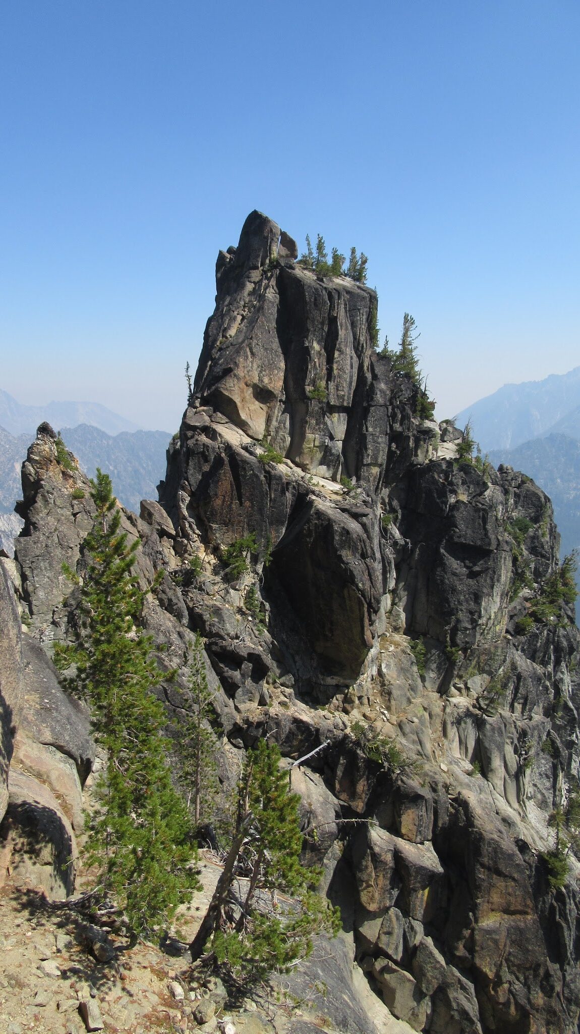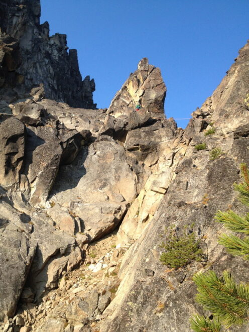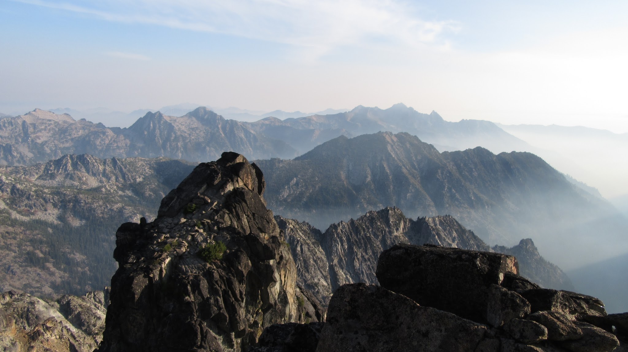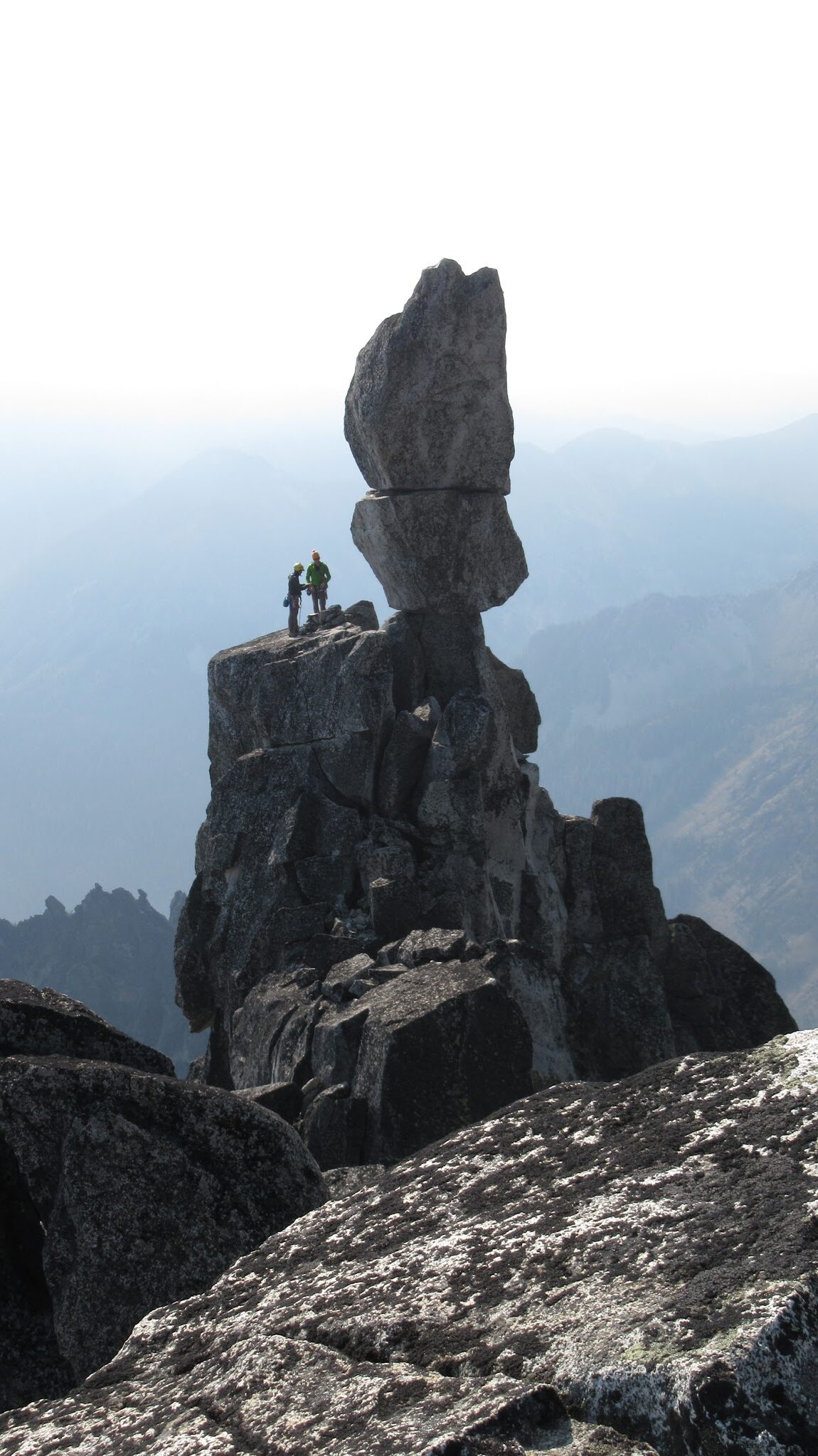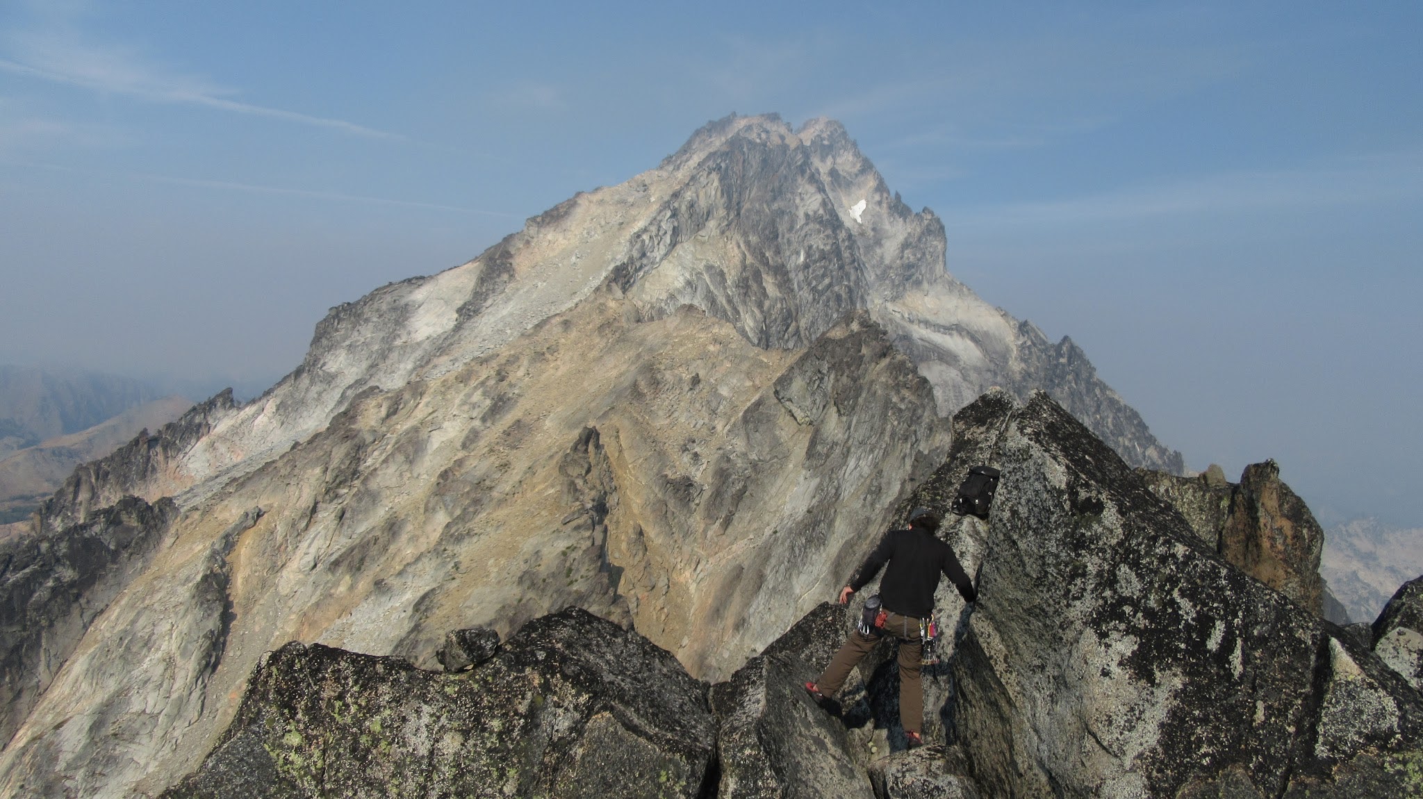 The sun rose right on us the next morning and there was amazingly much less smoke. We could actually see the Teanaway to our south...something we couldn't see at all the day before. We quickly got going again by 7am and I led an easy scramble pitch to the base of the final steep climb to the summit, which consisted of two 5.8 pitches and a long scramble pitch. Jacob led both the 5.8 pitches which he described as scary due to all the loose blocks, and he did an excellent job leading them since he chose to avoid touching them. Since I have been on so much loose rock, I didn't think it was too bad. Following those 2 pitches I grabbed onto most of the blocks he avoided on lead. The hand crack at the base of the diving board tower was spectacular though. After passing to the left of said tower, I went on another full rope length of easy 4th class terrain to a point just below the summit, where I saw a couple guys who had just rappelled down and were heading towards the balanced rock.