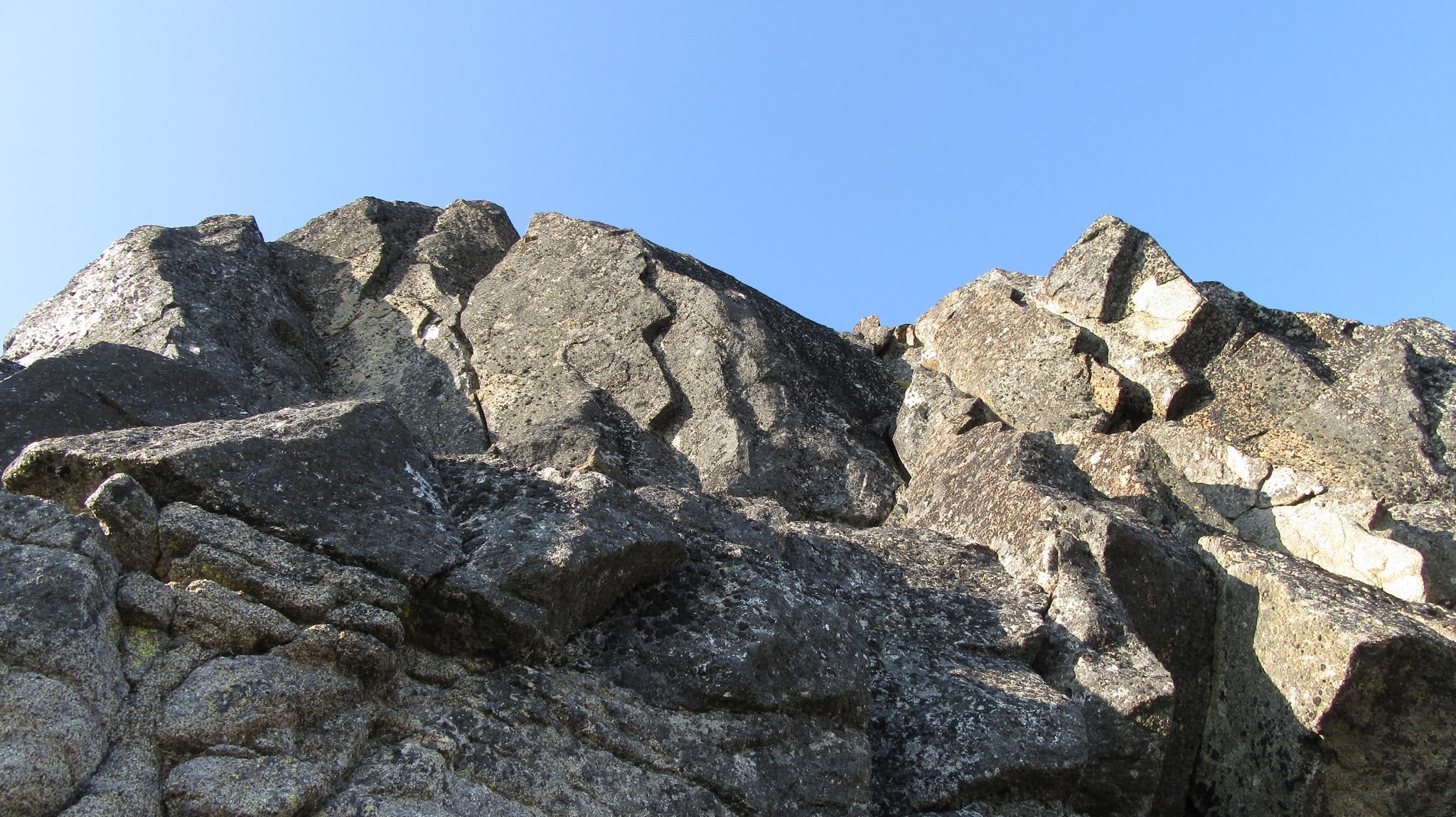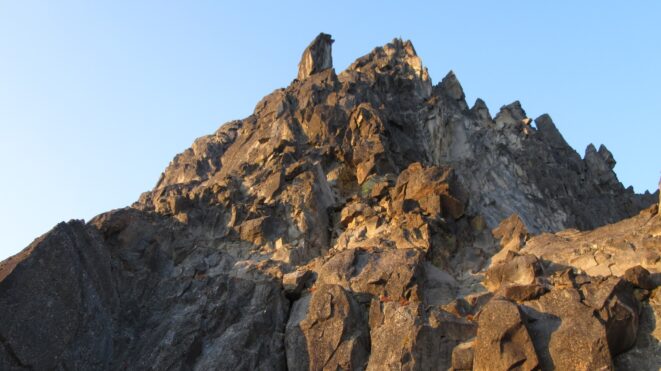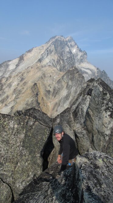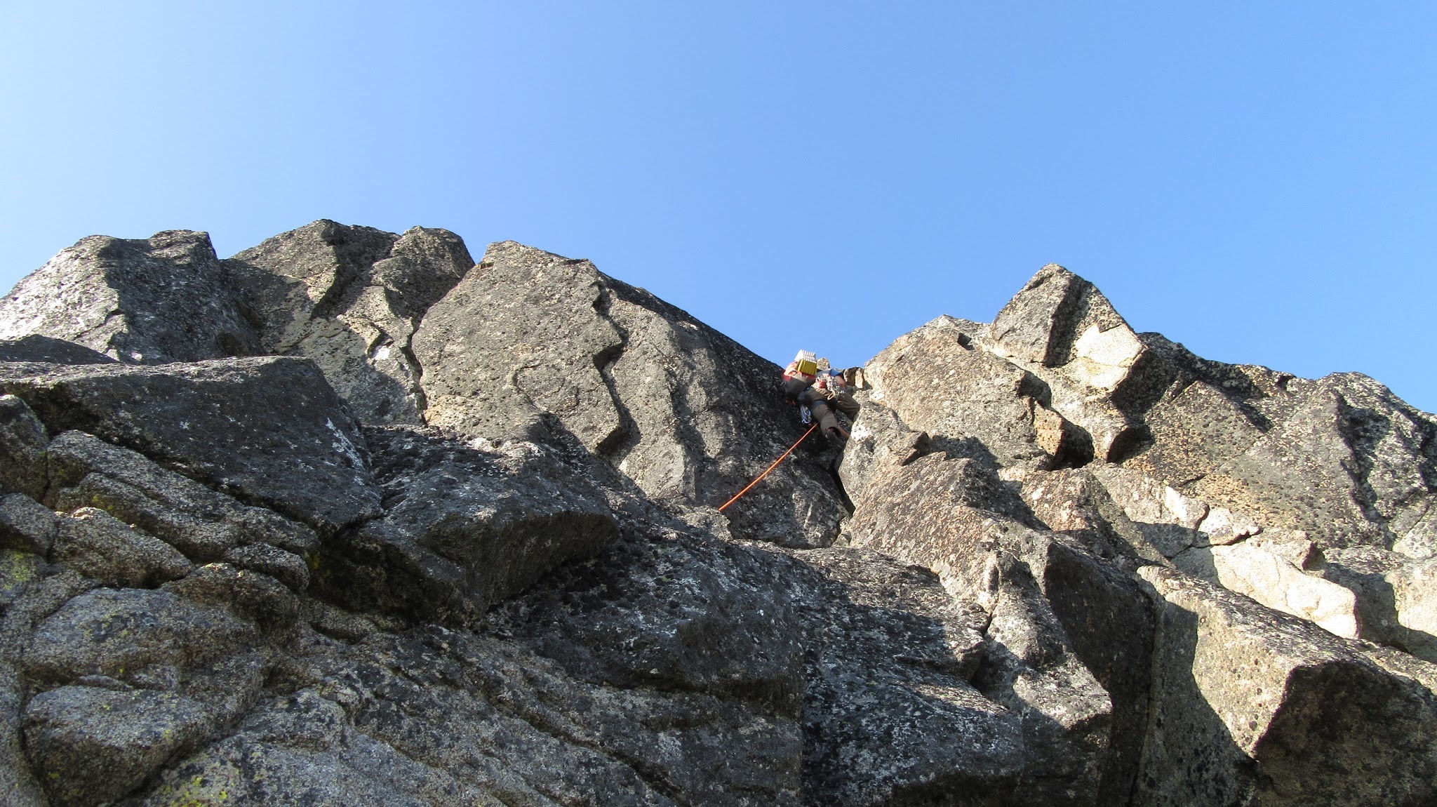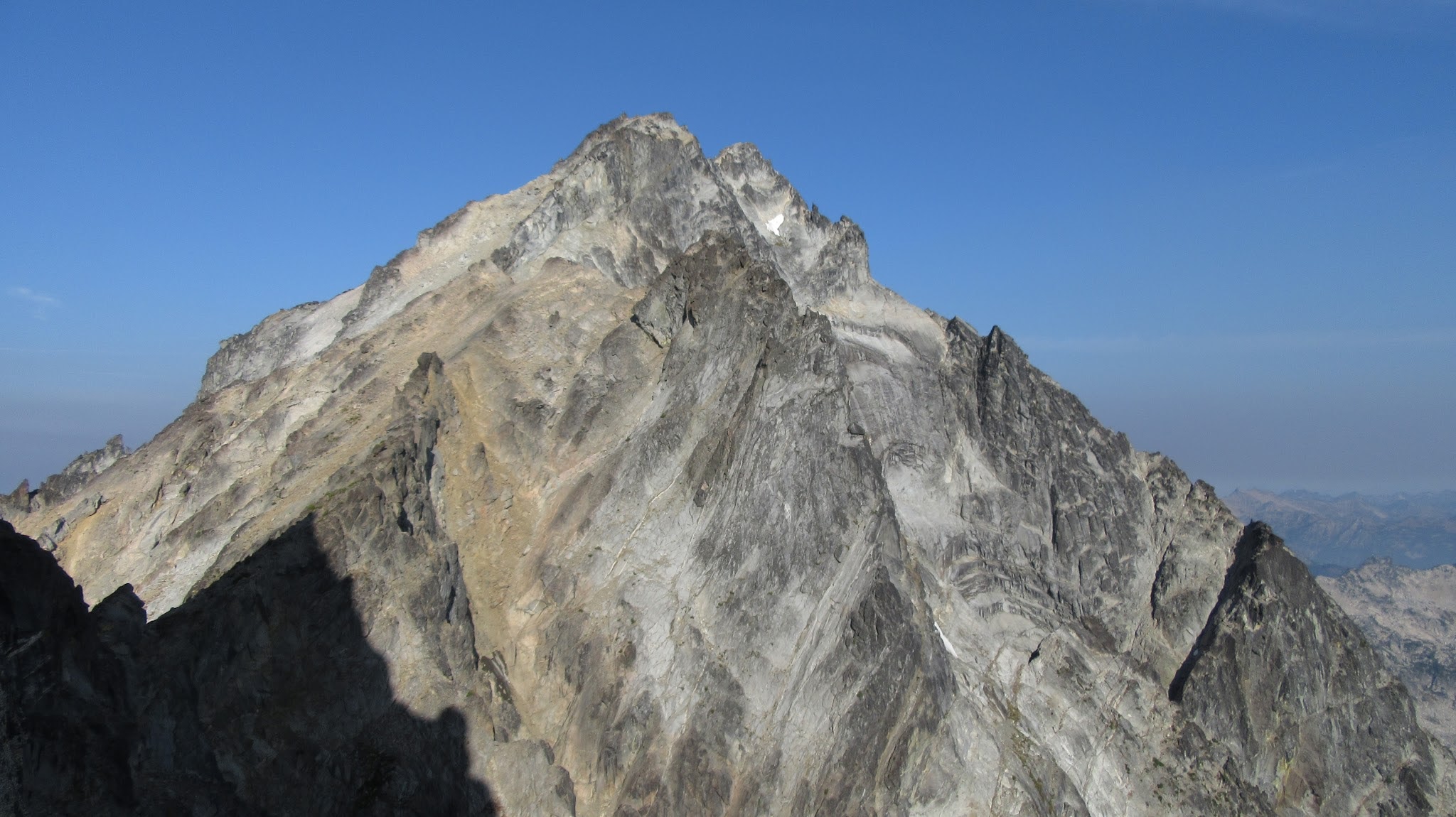 The sun rose right on us the next morning and there was amazingly much less smoke. We could actually see the Teanaway to our south...something we couldn't see at all the day before. We quickly got going again by 7am and I led an easy scramble pitch to the base of the final steep climb to the summit, which consisted of two 5.8 pitches and a long scramble pitch. Jacob led both the 5.8 pitches which he described as scary due to all the loose blocks, and he did an excellent job leading them since he chose to avoid touching them. Since I have been on so much loose rock, I didn't think it was too bad. Following those 2 pitches I grabbed onto most of the blocks he avoided on lead. The hand crack at the base of the diving board tower was spectacular though. After passing to the left of said tower, I went on another full rope length of easy 4th class terrain to a point just below the summit, where I saw a couple guys who had just rappelled down and were heading towards the balanced rock.