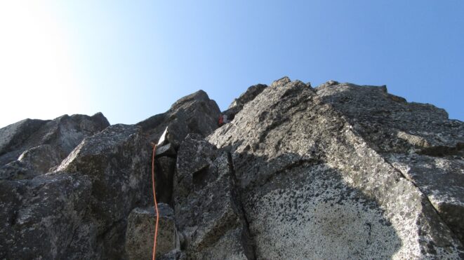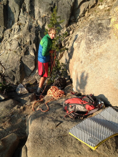 Since the gully leading up to the prominent notch in the ridge was completely melted out, we decided to reach the ridge earlier and climb the full route. After some scrambling, and one long 5.7 pitch I led, we reached a huge Class 2 ledge just below the crest on the east side, and walked a few rope lengths. Jacob then led a dirty 5.8 pitch up a chimney where we saw an old ice axe deep in a large crack. I then led another 5.8 pitch up some nice cracks, some of which had some loose blocks. After another scramble rope length, we continued up a deep gully and reached the crest of the ridge once again. We decided to bypass well below the tower just before the big notch and descended 60 feet or so before climbing up again to a large ledge shortly before the notch that we ended up bivying on. I excavated a nice flat, sandy spot on the ledge and threw out my sleeping bad for the night, and other than breathing issues from the smoke, I slept well.