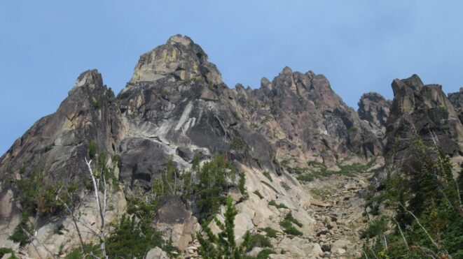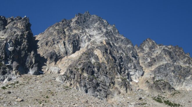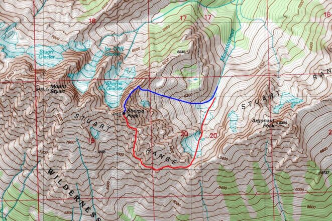 At 5am we started up the trail and made the quick walk to the base of the final hill leading to Stuart Lake and then followed the boot path up Mountaineers Creek. We followed a cairned path through talus on the slope west of the creek a couple hundred feet above the trees, then dropped back down and continued heading south aiming towards the Argonaut/Sherpa Saddle. At 5,800 we started ascending steeply up talus towards the north ridge. We found some water around 7,000 feet and filled up since it would be our last chance for a while.