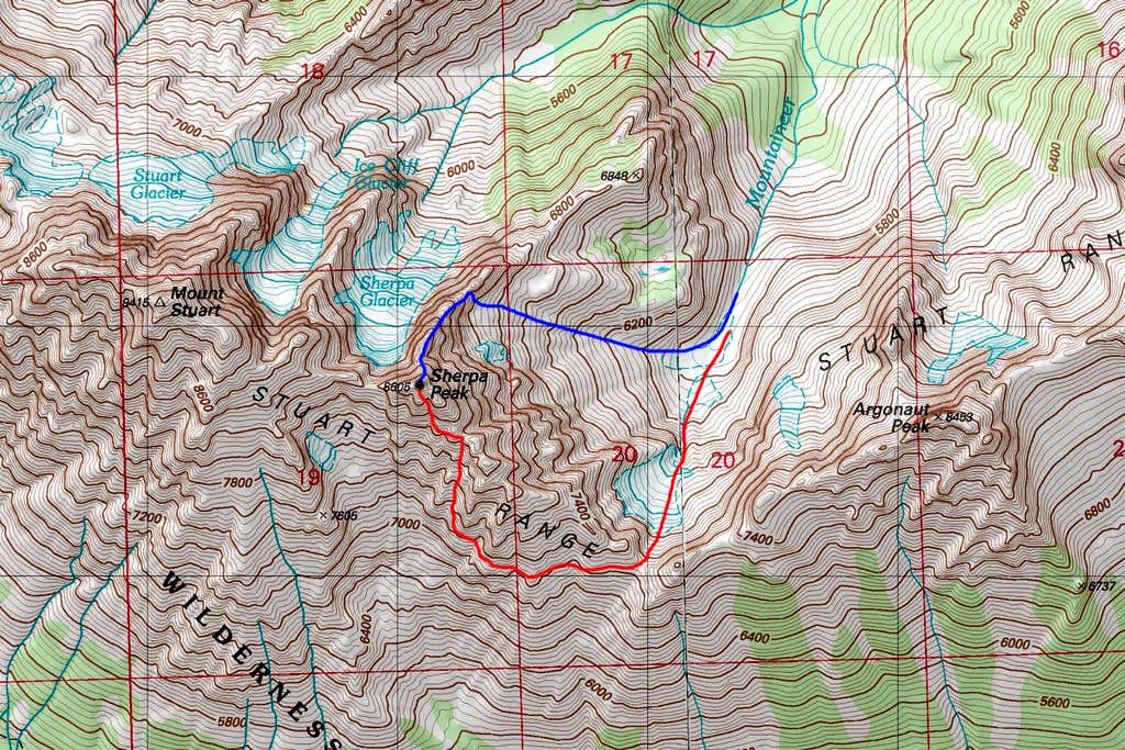 Instead we descended 800 feet down to the south from this same notch and continued working skiers left crossing below a series of large ribs. Once we reached the 7,000 foot level, we traversed horizontally, and reached the very large, broad gully marking the last gully before the Sherpa/Argonaut saddle. A short 100 foot ascent brought us to the saddle where Jacob was happy the descent was much easier than what previous descriptions had mentioned. It was mostly class 2, and the first 500 feet below the summit sustained class 3 with a couple short raps. What I thought the worst part of the descent was yet to come. Dropping the 1,000 feet off the Sherpa/Argonaut saddle sucked. Lots of loose rocks barely held in by dirt and sand. One bucket sized rock even came tumbling down and almost hit me had I not dove out of the way just in time. Once we managed to get back to treeline, after much boulder hopping, the rest of the hike out was uneventful. Burritos at South's in Leavenworth afterwards was excellent.