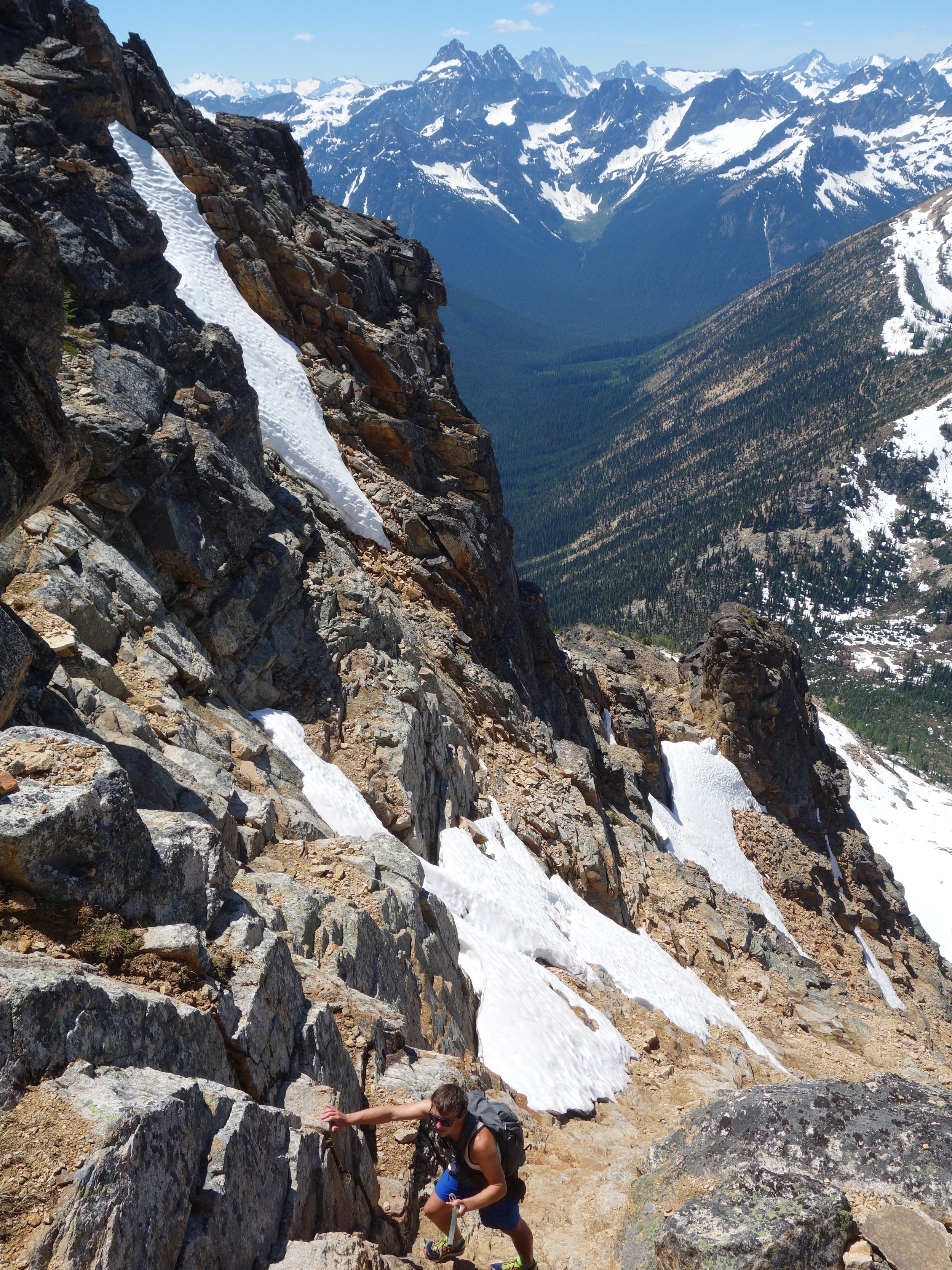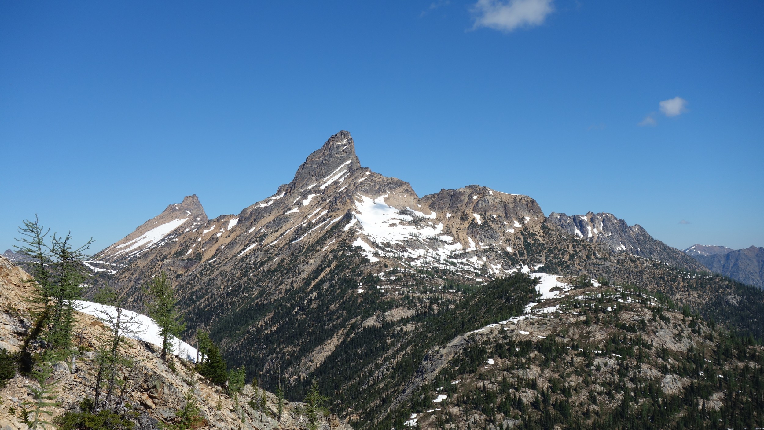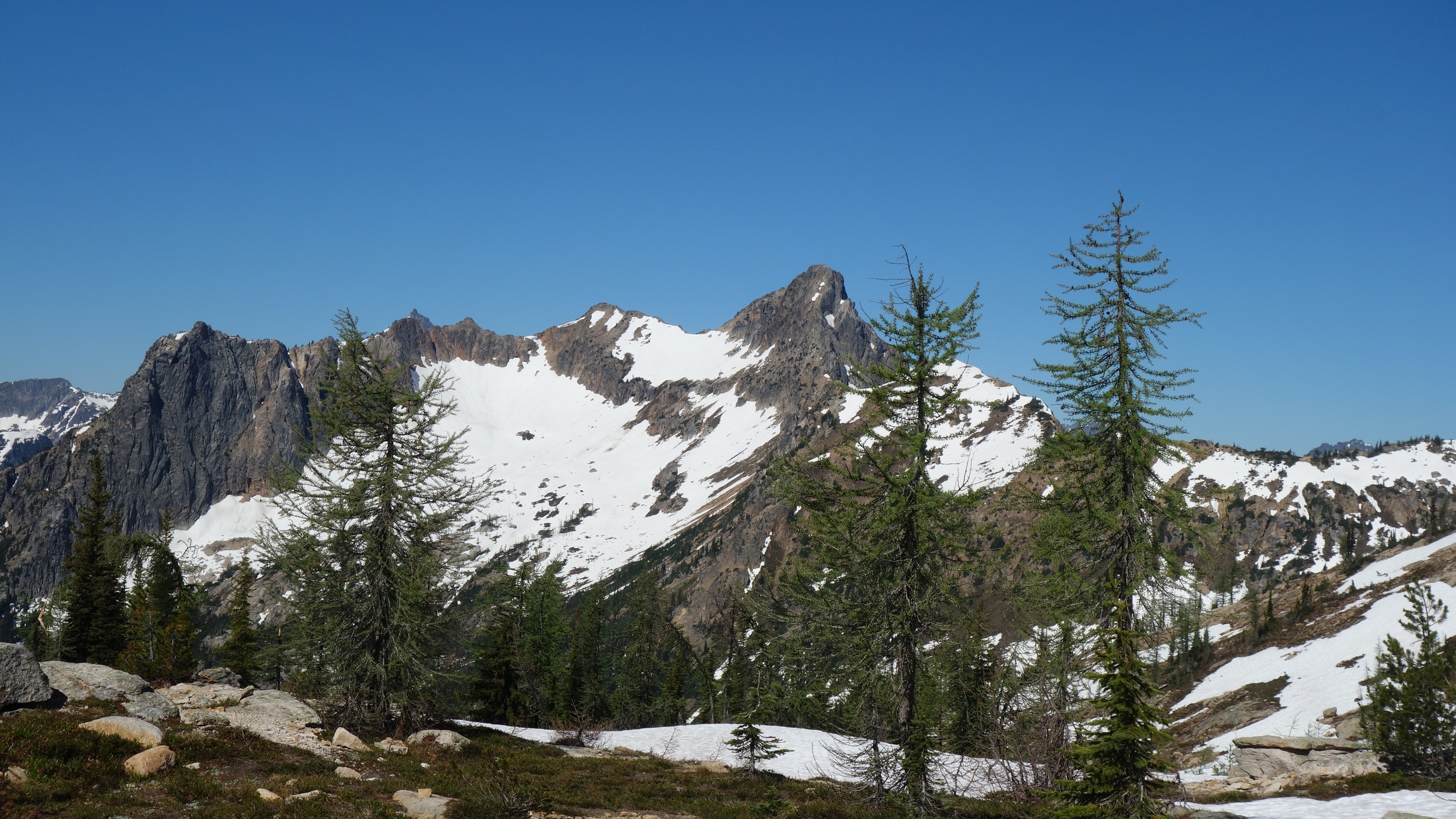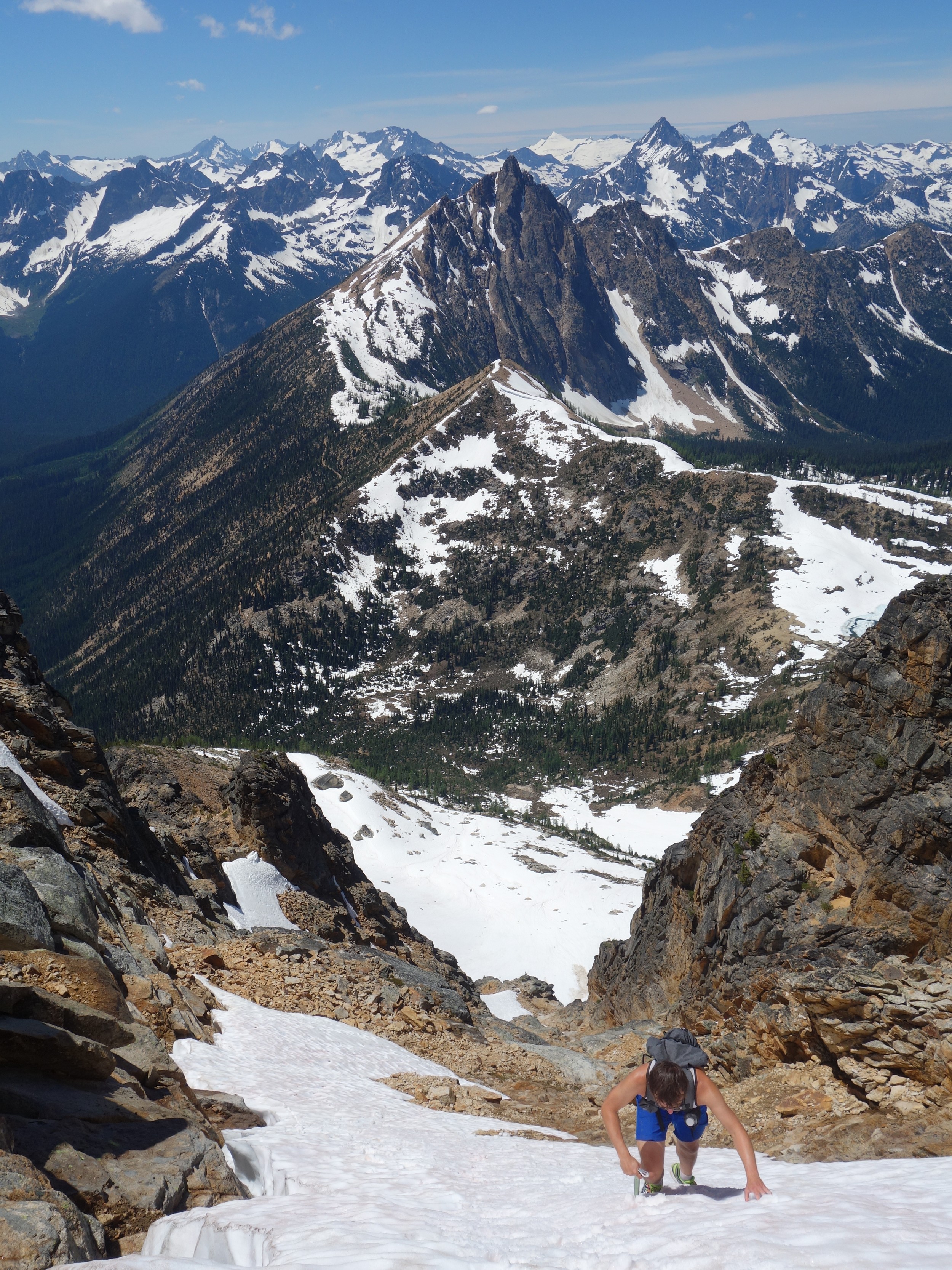 With Sunday being great, we started from Rainy Pass at about 8am and hiked the PCT to Cutthroat Pass, with the final 500 feet up to the pass still covered in snow. We were able to boot straight up to the pass without issue on the firm snow. Unfortunately I forgot my sunglasses, so I was hoping we wouldn't have too much snow, otherwise it was going to be a painful day for my eyes.