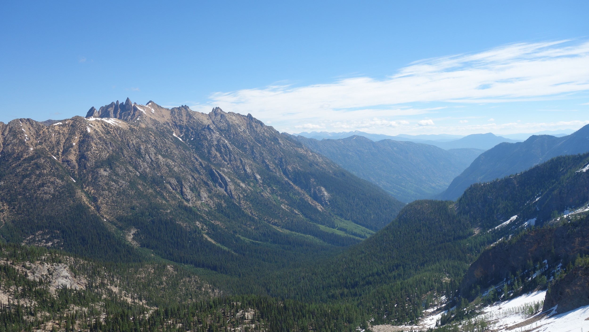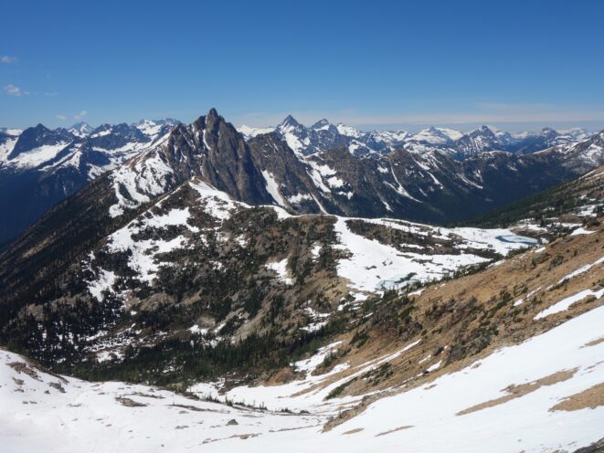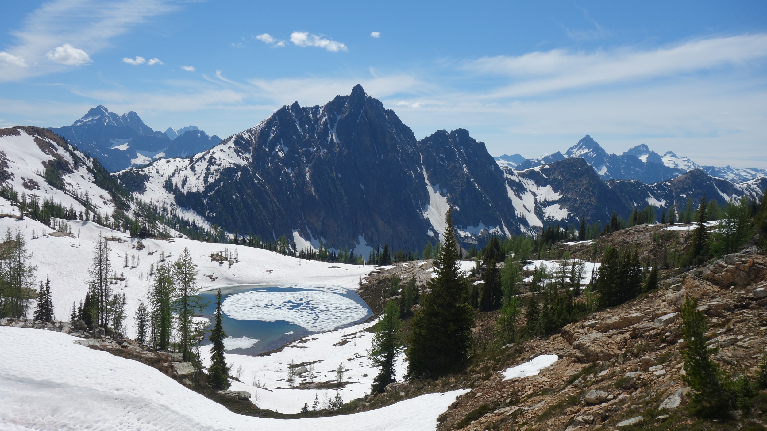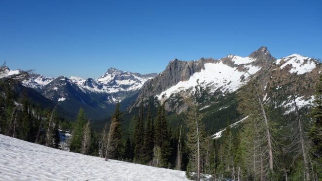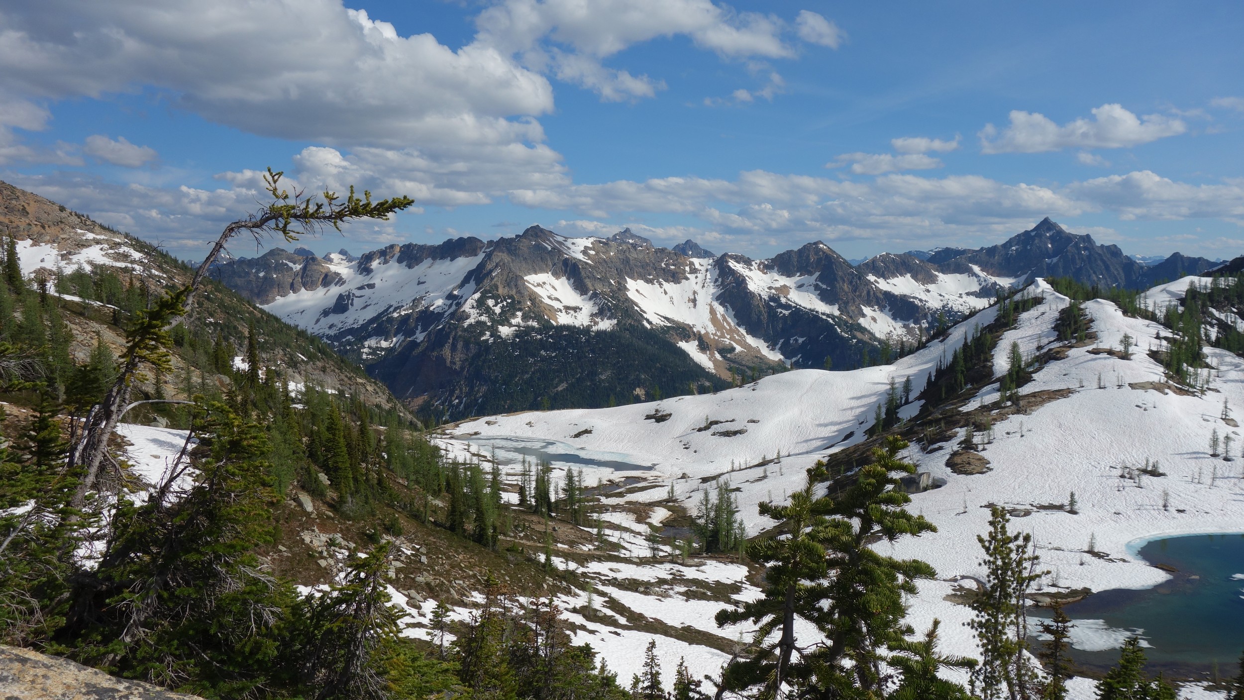 With Sunday being great, we started from Rainy Pass at about 8am and hiked the PCT to Cutthroat Pass, with the final 500 feet up to the pass still covered in snow. We were able to boot straight up to the pass without issue on the firm snow. Unfortunately I forgot my sunglasses, so I was hoping we wouldn't have too much snow, otherwise it was going to be a painful day for my eyes.