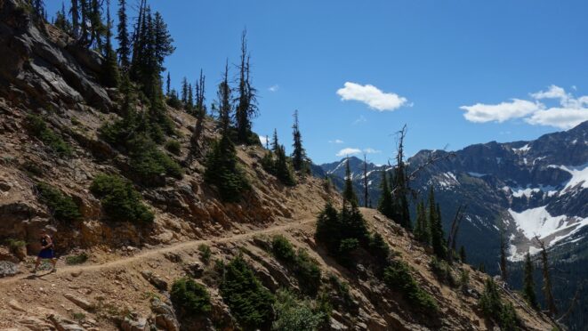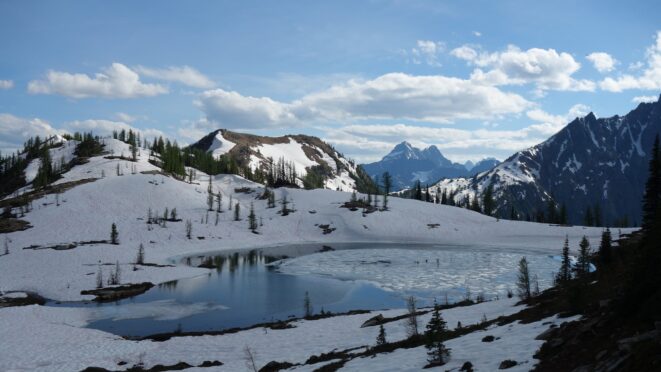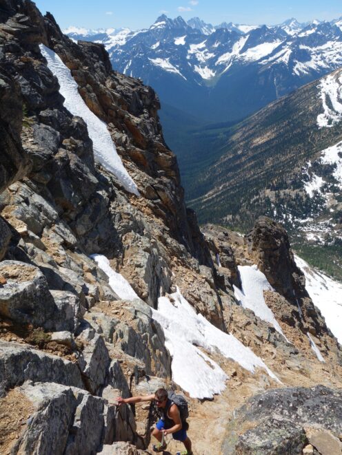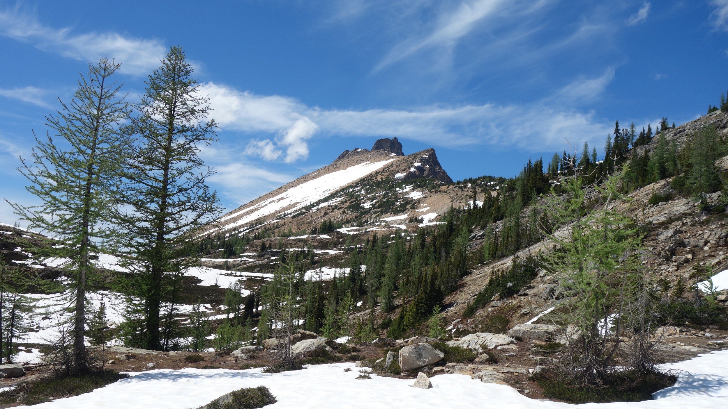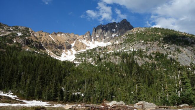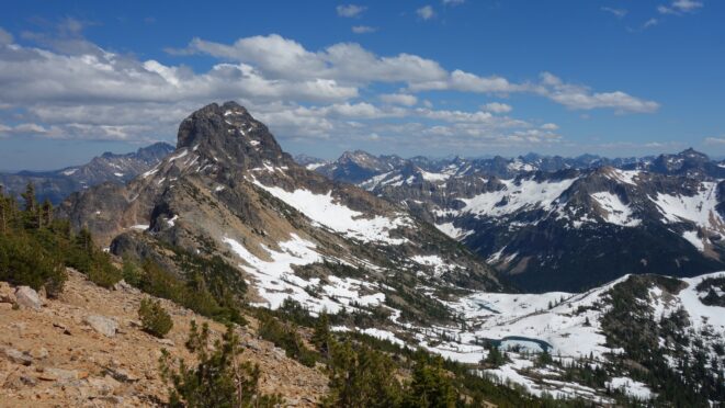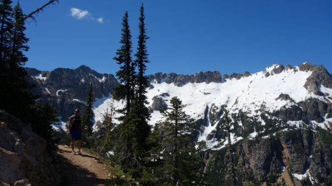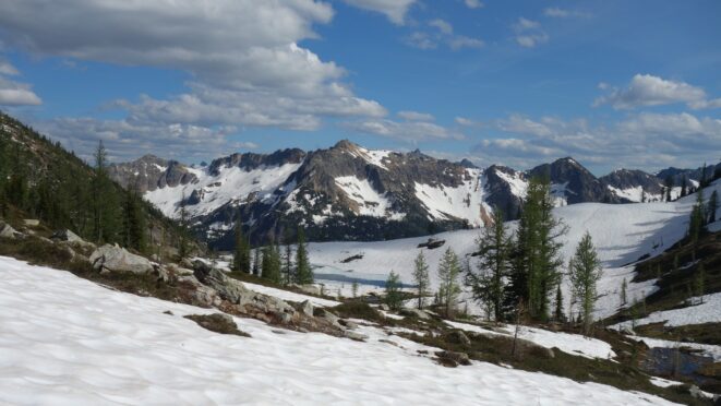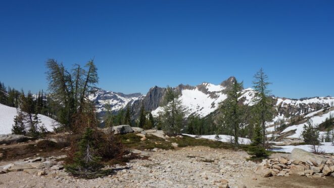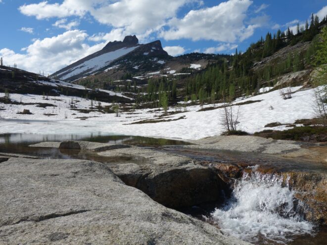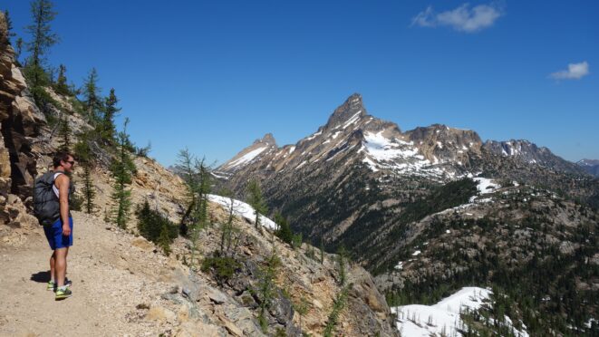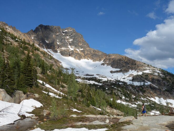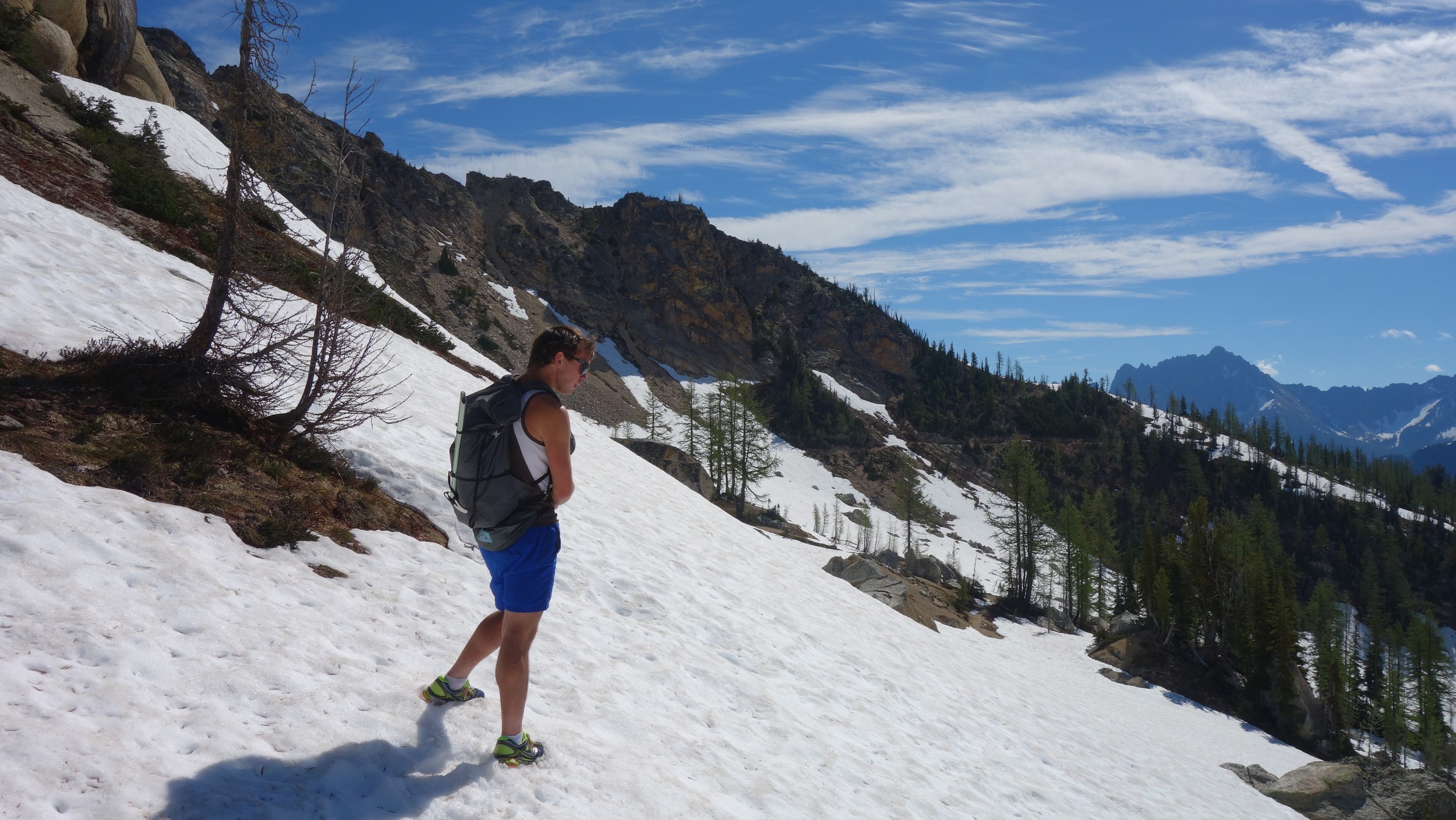 Once we arrived at the pass, we saw the trail as it crossed over and traversed northward. There was a decent amount of snow on these east facing aspects, and with the sun glaring down it was very bright. I had Josh kick steps on these traverses where the trail was still snow covered, so i could shield my eyes and only look right at the ground where I was stepping. Thankfully, when we reached the switchbacks above Granite Pass, we could see the remainder of the trail that traverses on the SW slopes of Tower Mountain, and the route all the way to Snow Lakes was snow free. So we ran down to Granite Pass, and made quick work hiking to the Snow Lakes trail junction.