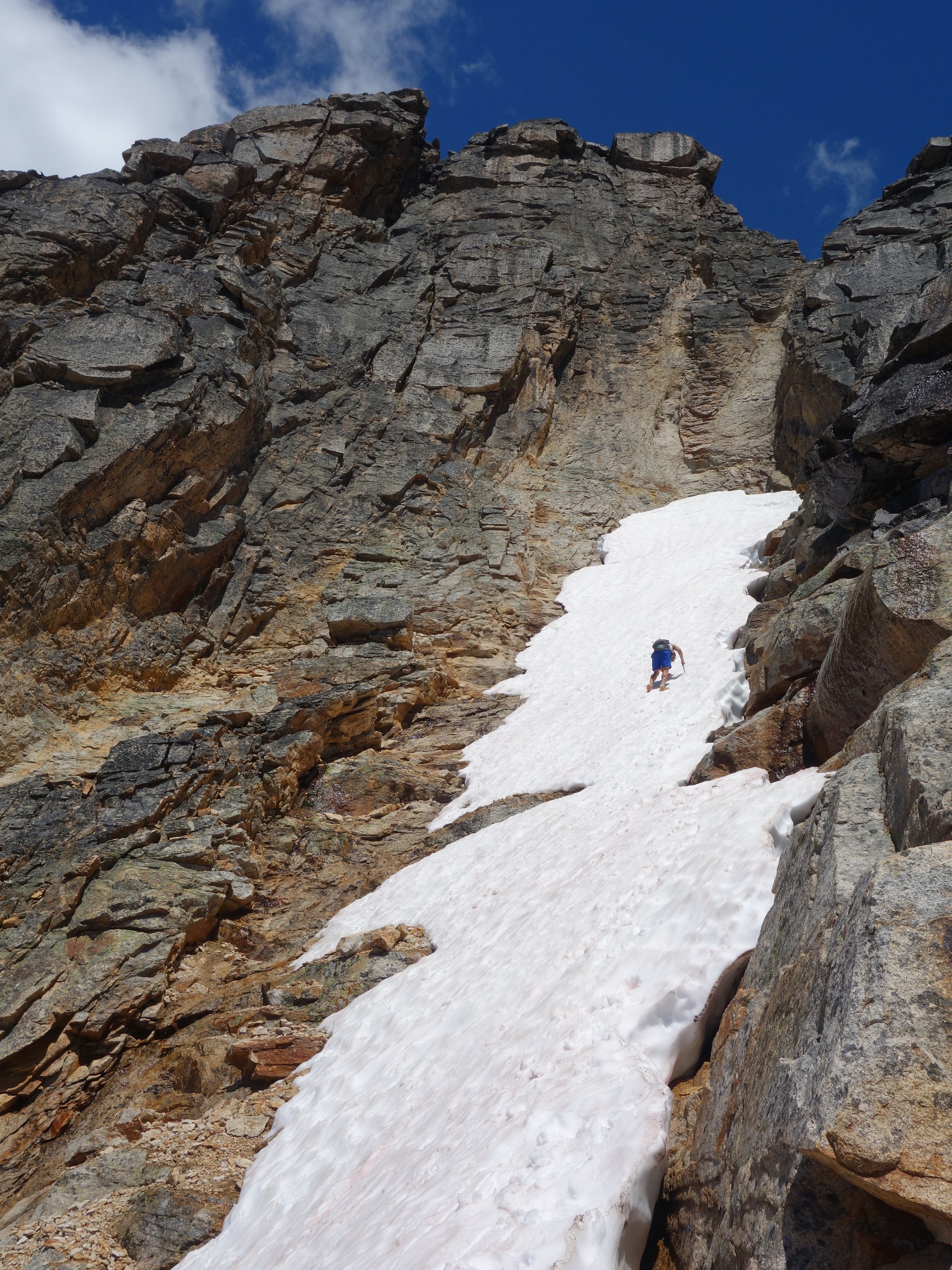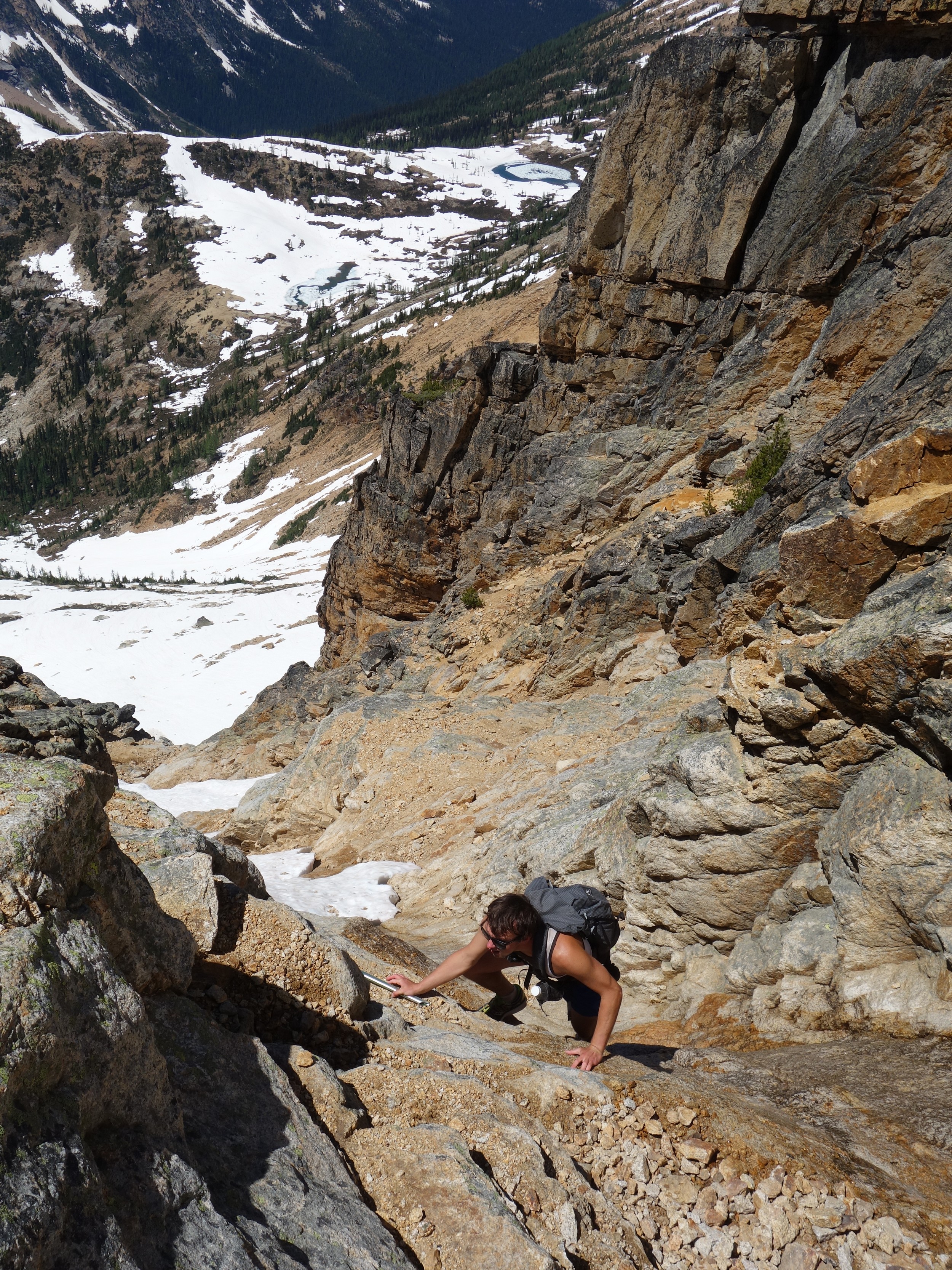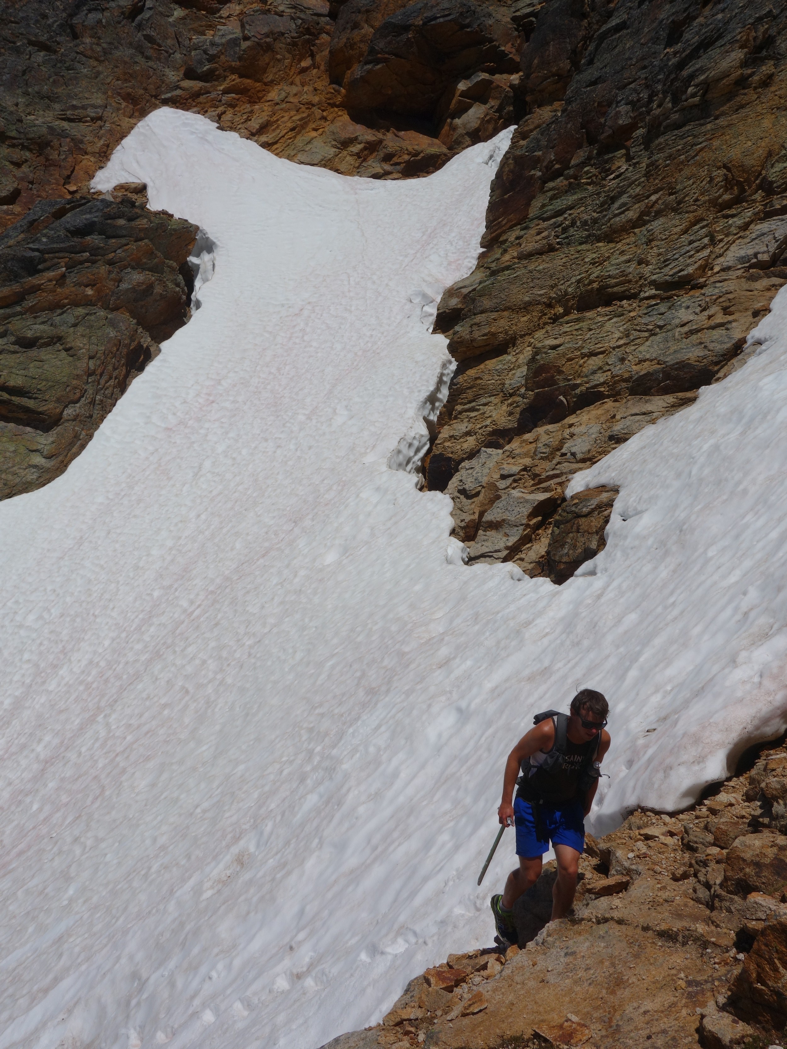 The short trail up to Snow Lakes was mostly dry, with just a few small patches of snow covering it. The lakes themselves are roughly 50% melted off. After a quick break at the lower lake, we began traversing over to the obvious gully on the SW side of Tower. There was a considerable amount of snow covering the talus on the lower 800 feet of the route below the ledge, which was nice for ease of ascent, but again, bad for my eyes.