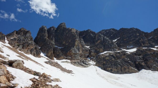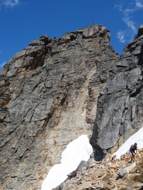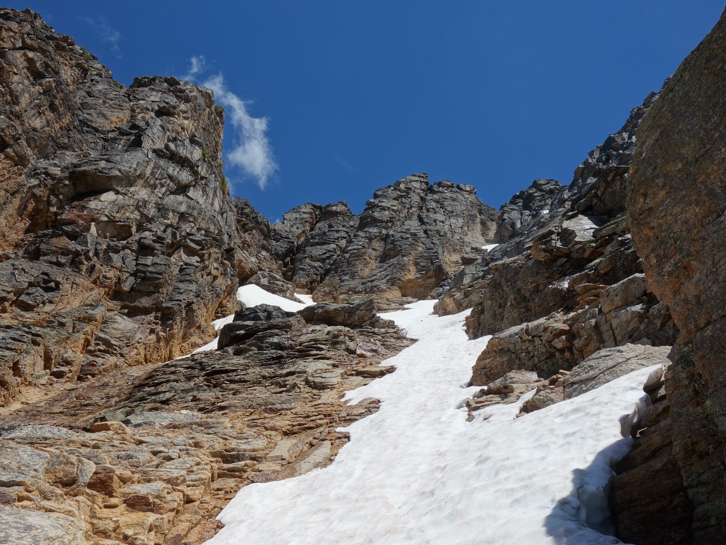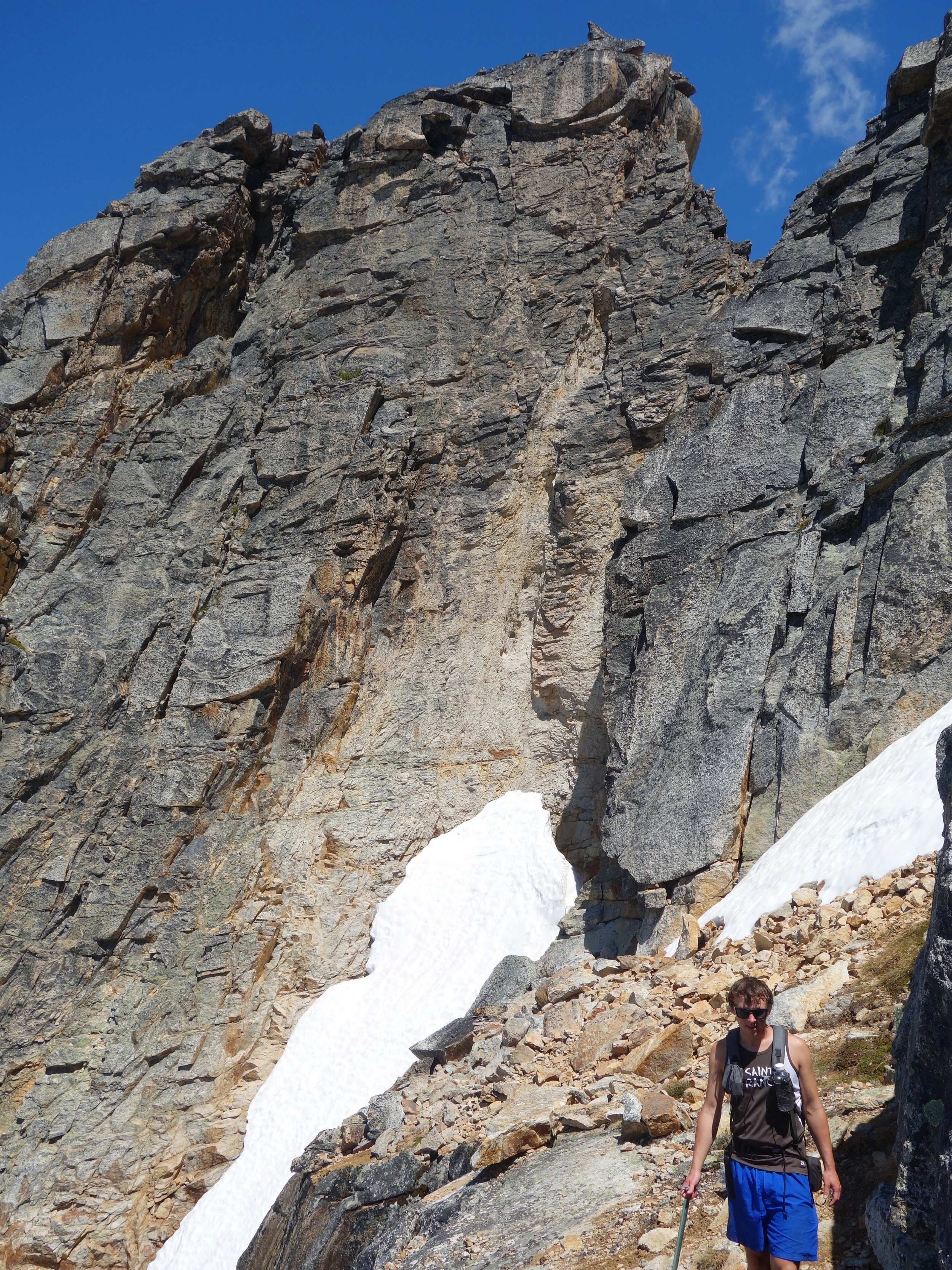 The short trail up to Snow Lakes was mostly dry, with just a few small patches of snow covering it. The lakes themselves are roughly 50% melted off. After a quick break at the lower lake, we began traversing over to the obvious gully on the SW side of Tower. There was a considerable amount of snow covering the talus on the lower 800 feet of the route below the ledge, which was nice for ease of ascent, but again, bad for my eyes.