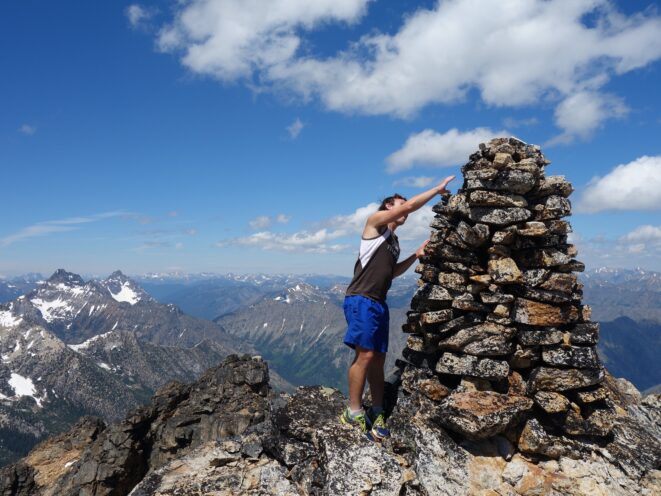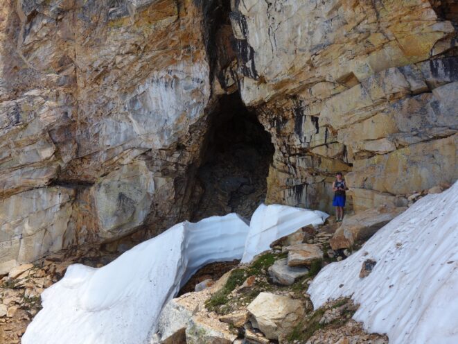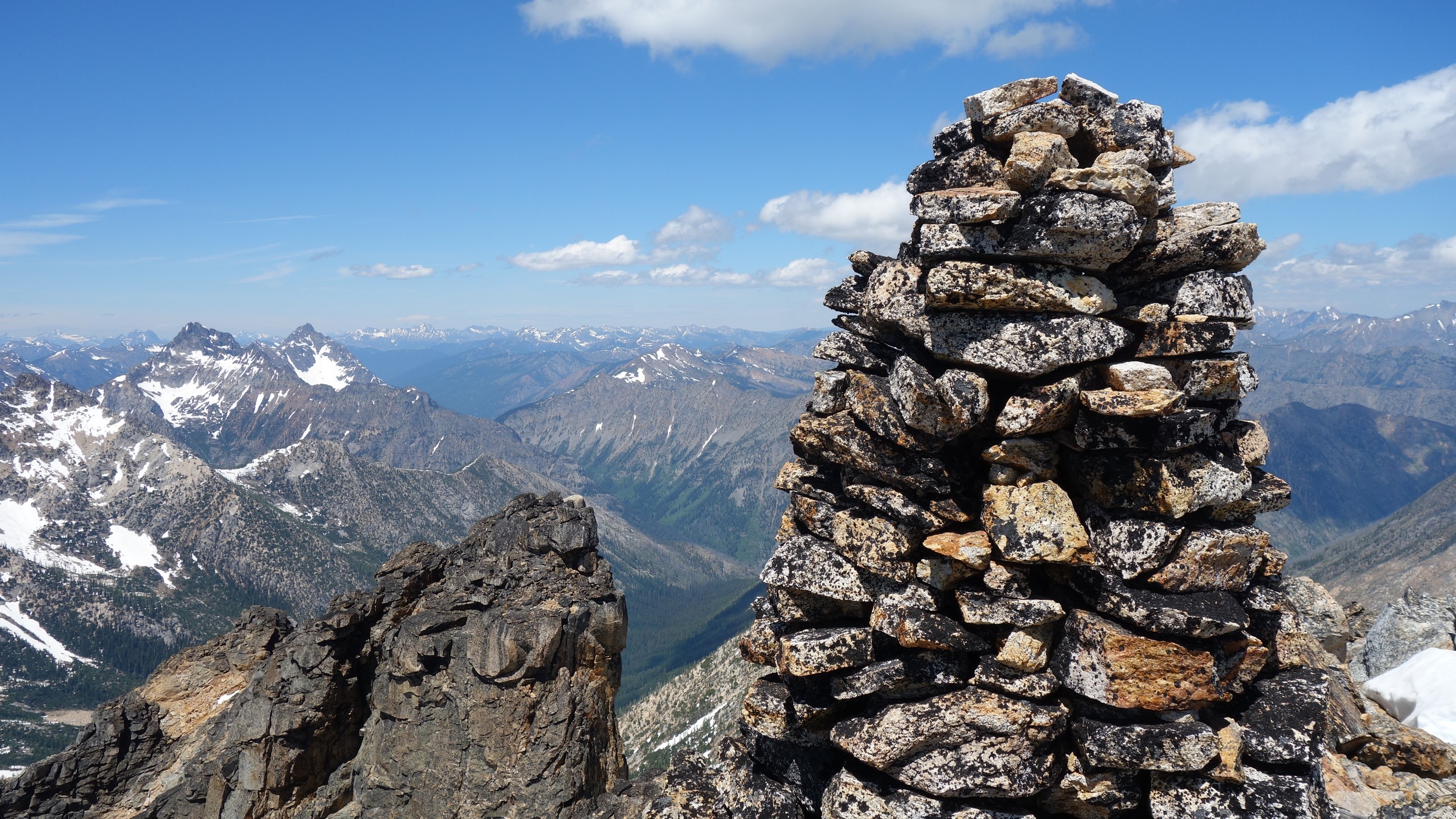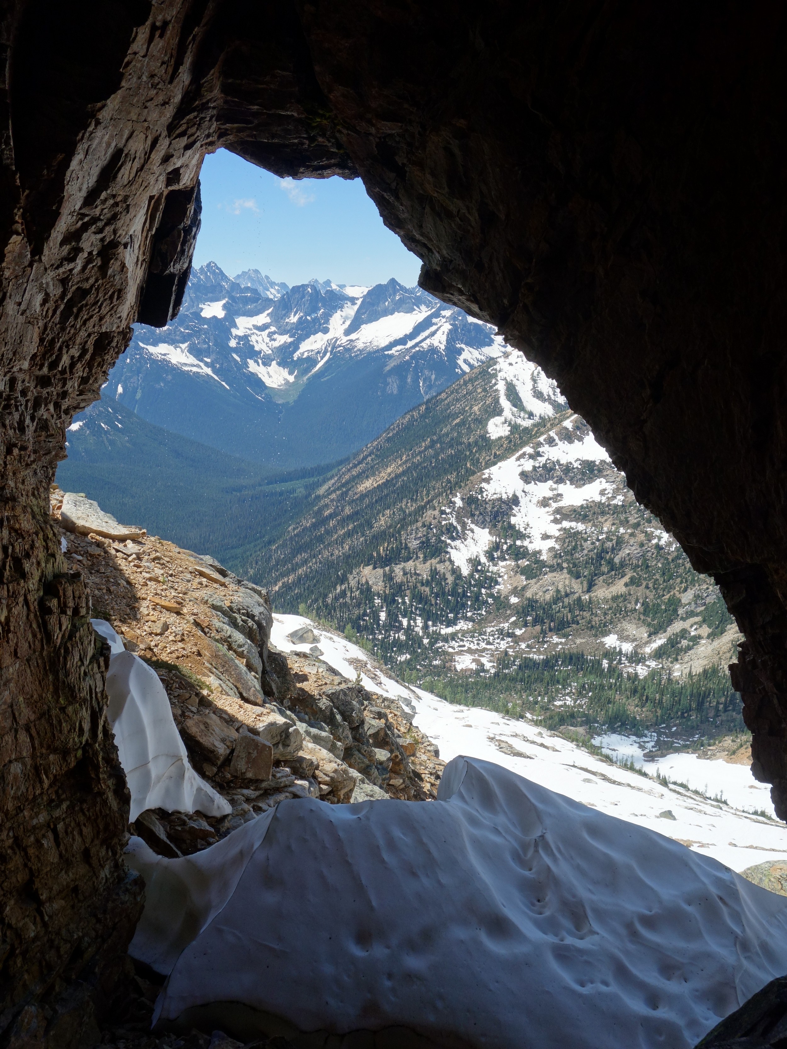 We reached the ledge without incident and scrambled up to the infamous large cave. This was really, really cool, and went into the cliffs a good 15-20 meters or so. We navigated around a small snow patch covering the ledge here, and emerged at the base of the long gully. Ascending this gully wasn't too bad, despite the remaining snow cover (some of which was nearly 45 degrees) and wet slabs. The crux was climbing some Class 4 slabby section with water flowing over it, but we were not on the easiest line here. As we approached the white "V" at the top of the gully, after weaving back and forth trying to stay on rock (since we were only in trail runners), we encountered the steepest snow. 100 feet of 45 degree snow which was luckily soft enough to kick steps in dumped us off at the second rightward ledge traverse. From here it was a simple traverse right to the ridgecrest, then a short Class 2+ scramble to the summit, where I was greeted by a monster cairn.