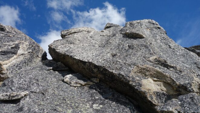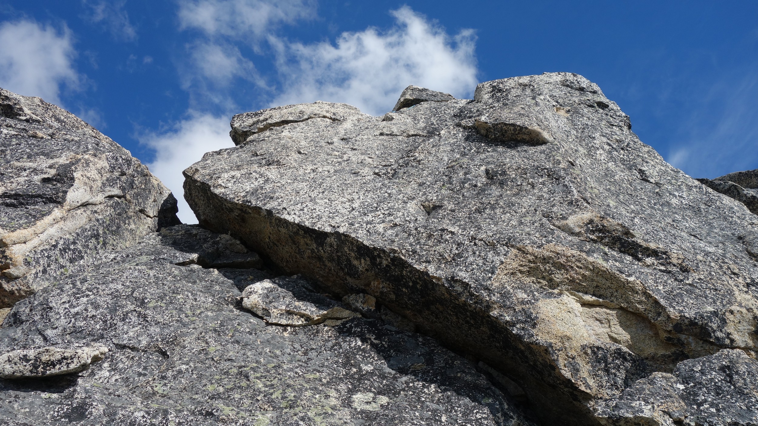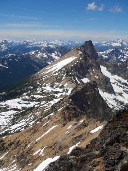 After that close call (one of the few I have ever had), I made it back safely to the snow below and plunge stepped back down and quickly made it to the lower lake, then began an ascending traverse to the low saddle between Golden Horn and Tower. I found small trails occasionally, and made the mostly snow free slog up the scree to the summit pyramid. I crossed over to the NW side and followed the cairns to the final 20 foot scramble. At first it was easy class 3, but I believe there was one easy 5th class move to make the rightward move into the horizontal foot crack, which I shimmied right in using the summit for hand holds. The large rap sling was still in good condition, but being solo had no use for. I didn't stay long, and carefully made the downclimb, traversing back left with my feet in the crack, then having to bend down and undercling the horizontal crack with my right hand in order to drop my left foot down.