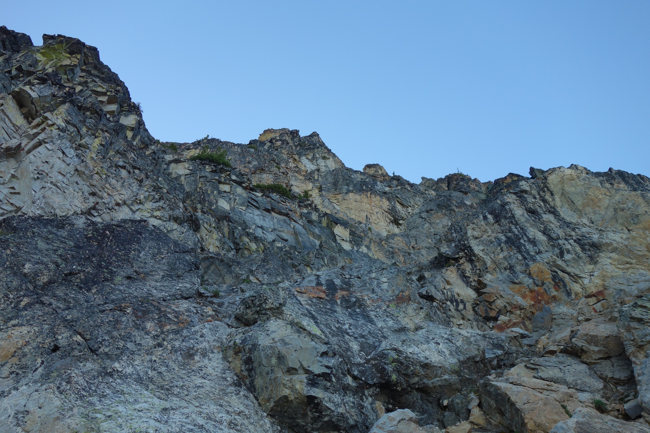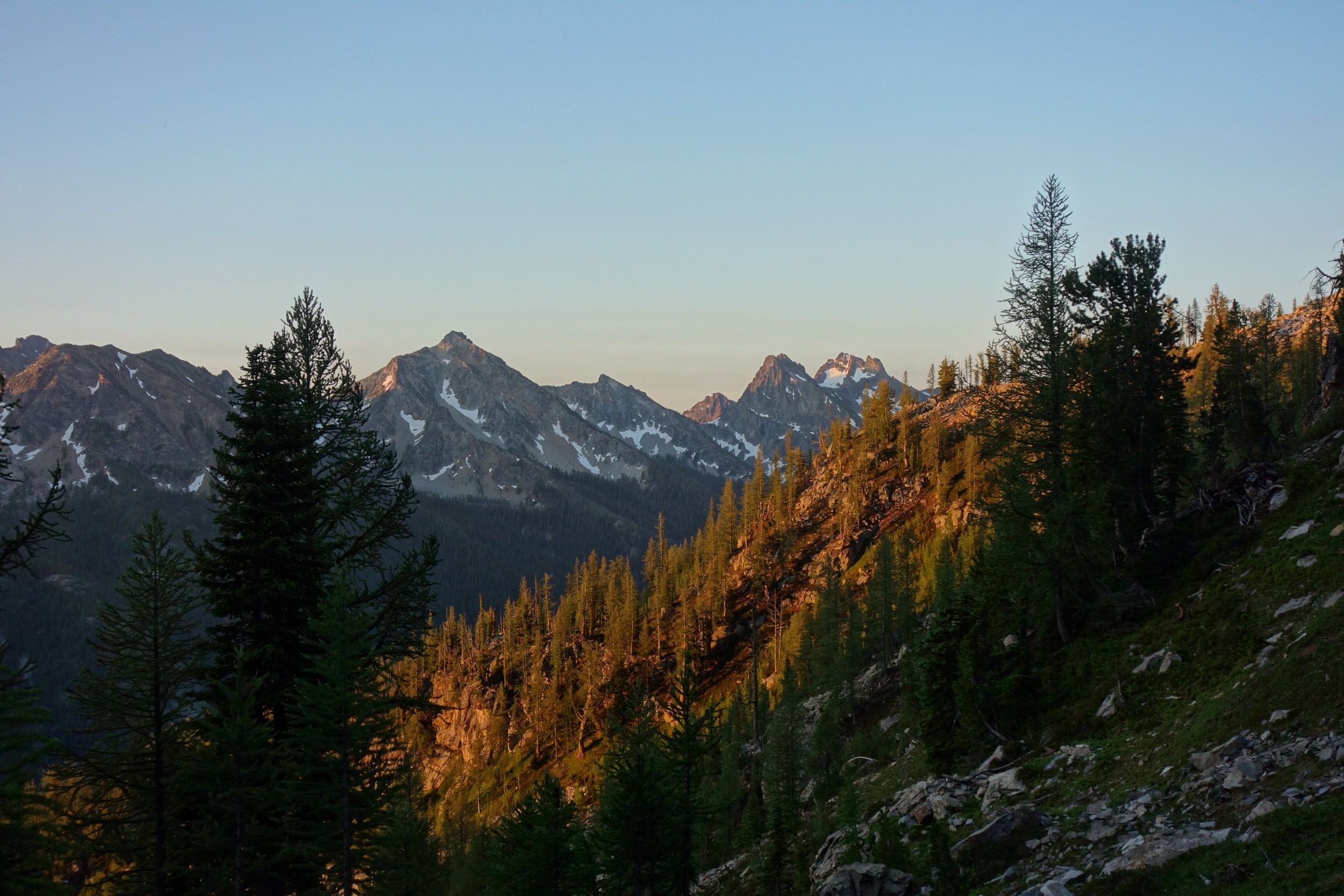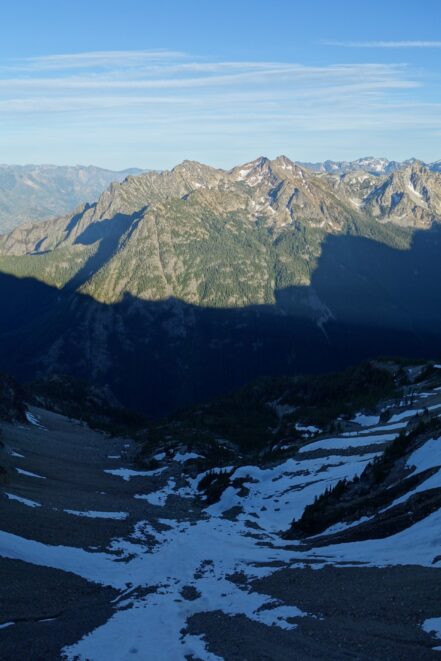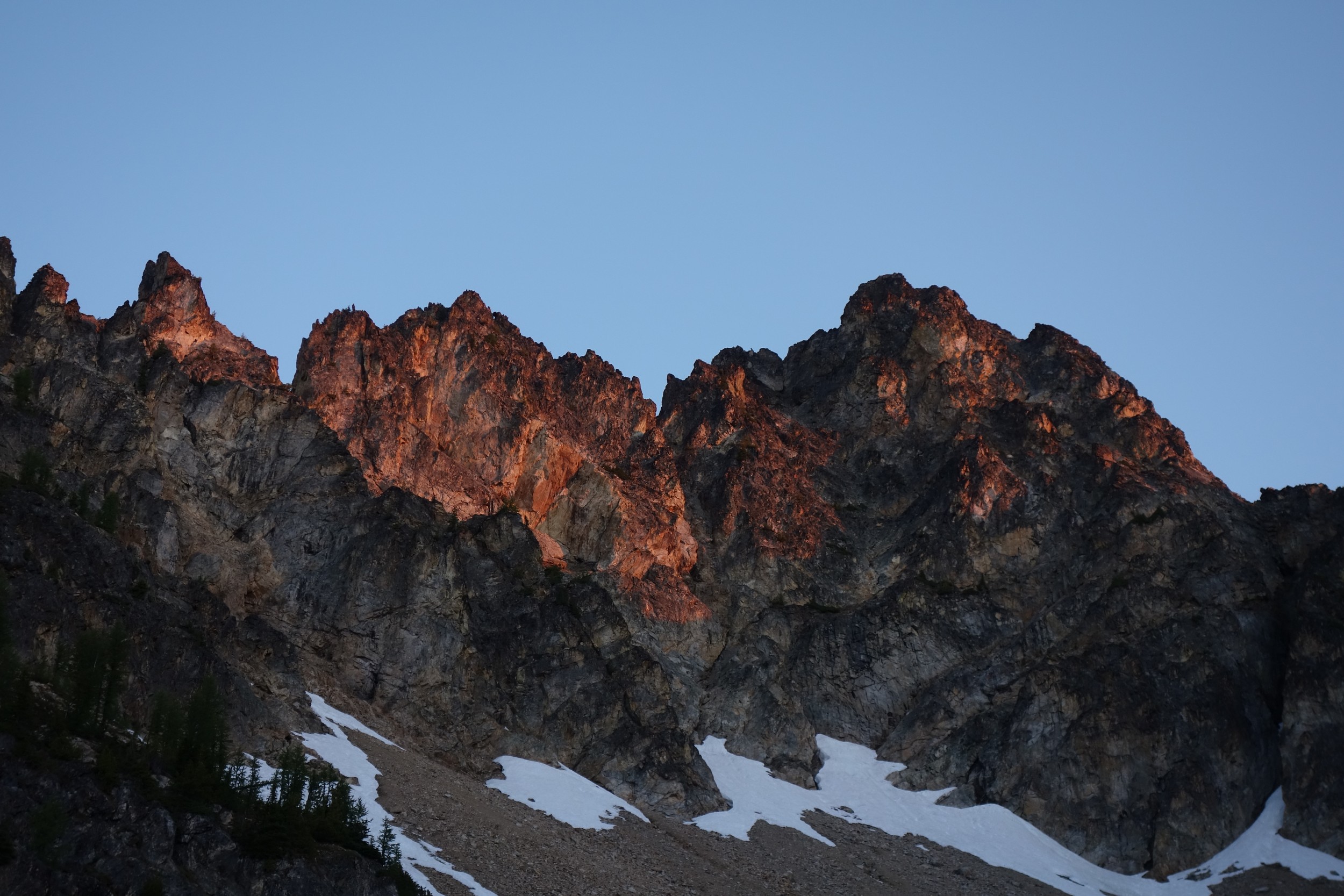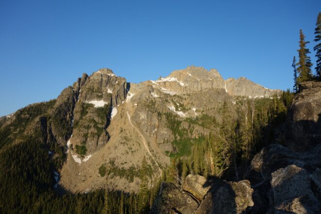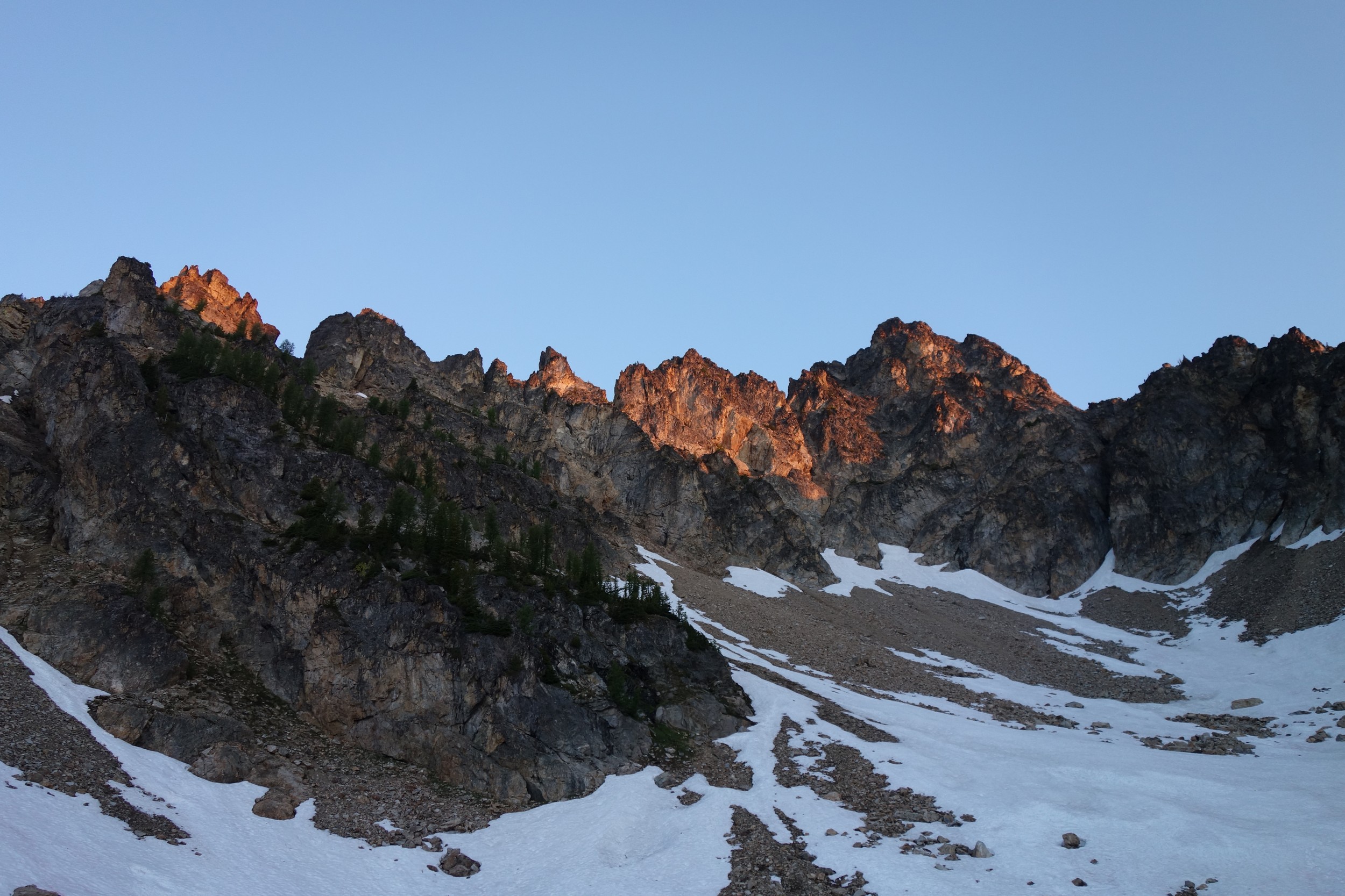 This is a continuation of my report for Mount Logan. After returning back to Stehekin, eating a very good burger and making my way back to the Company creek TH, I bivied by the trailhead and started hiking up the trail around 5am. It was an initially steep hike up to 2800 feet on good trail, then it flattened out and remained easy, occasionally with a little brush overgrowing it until the log crossing. Views of the sun hitting the east face of Bonanza were stunning, and unexpected! I ran into a trail crew working on clearing out the trail and saw their tools scattered around. After a brief chat, I crossed the bridge and continued for a few minutes to the small creek draining the valley below the west face of Tupshin Peak. Just a few more minutes up the trail I began schwacking straight up the west facing slopes on White Goat Mountain. I utilized many veggie belays and scrambled small rock cliffs, avoiding most of any brushy areas. I actually went straight through the steepest section in the 4200-4600 range.