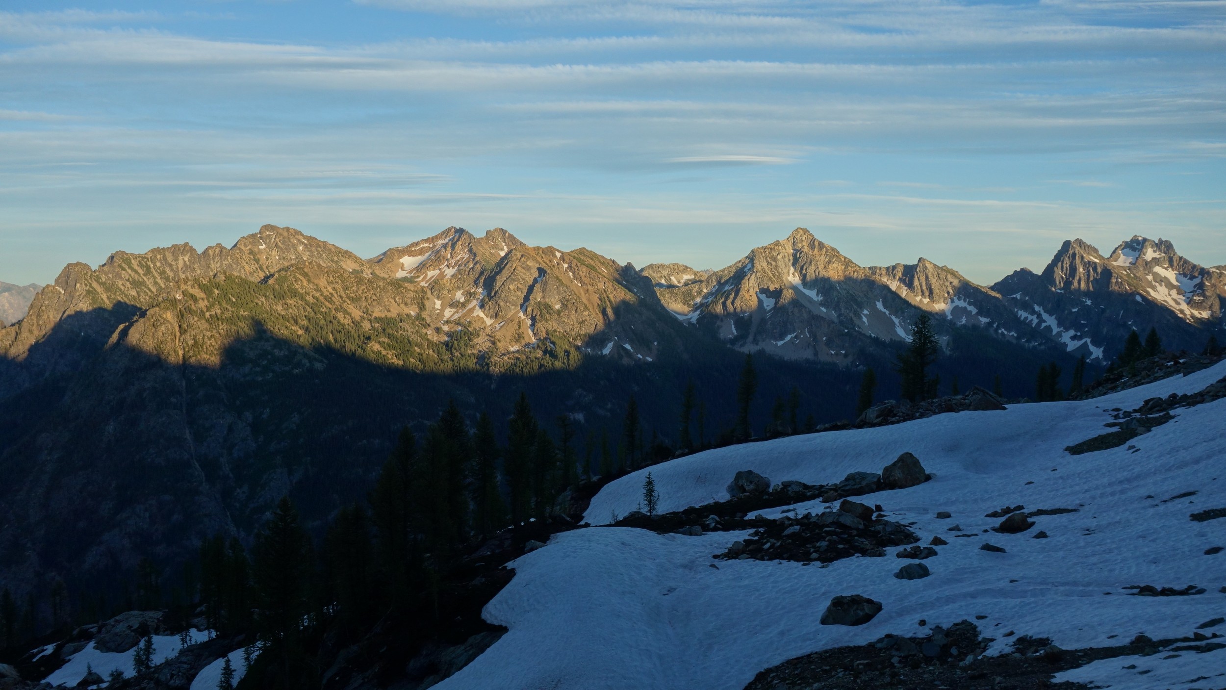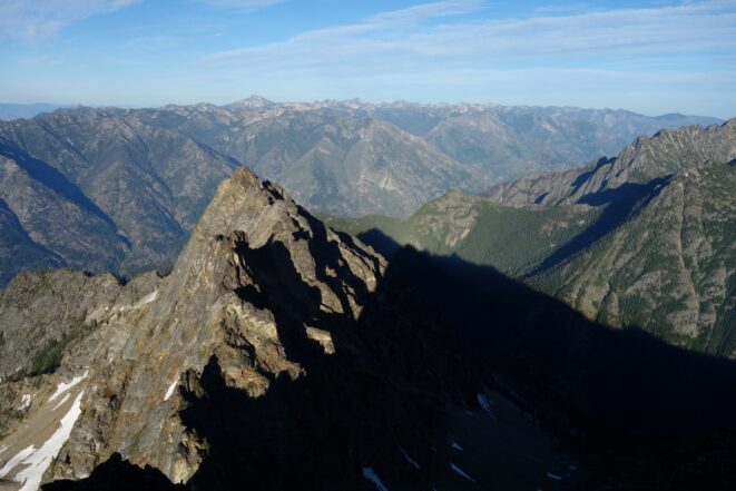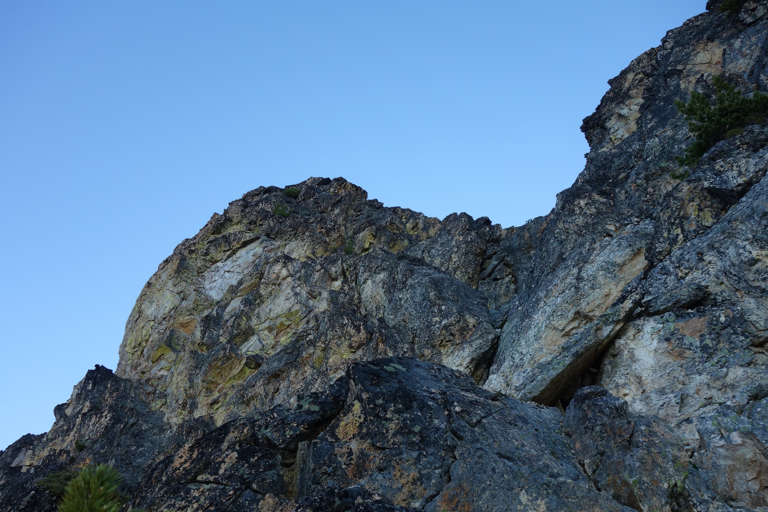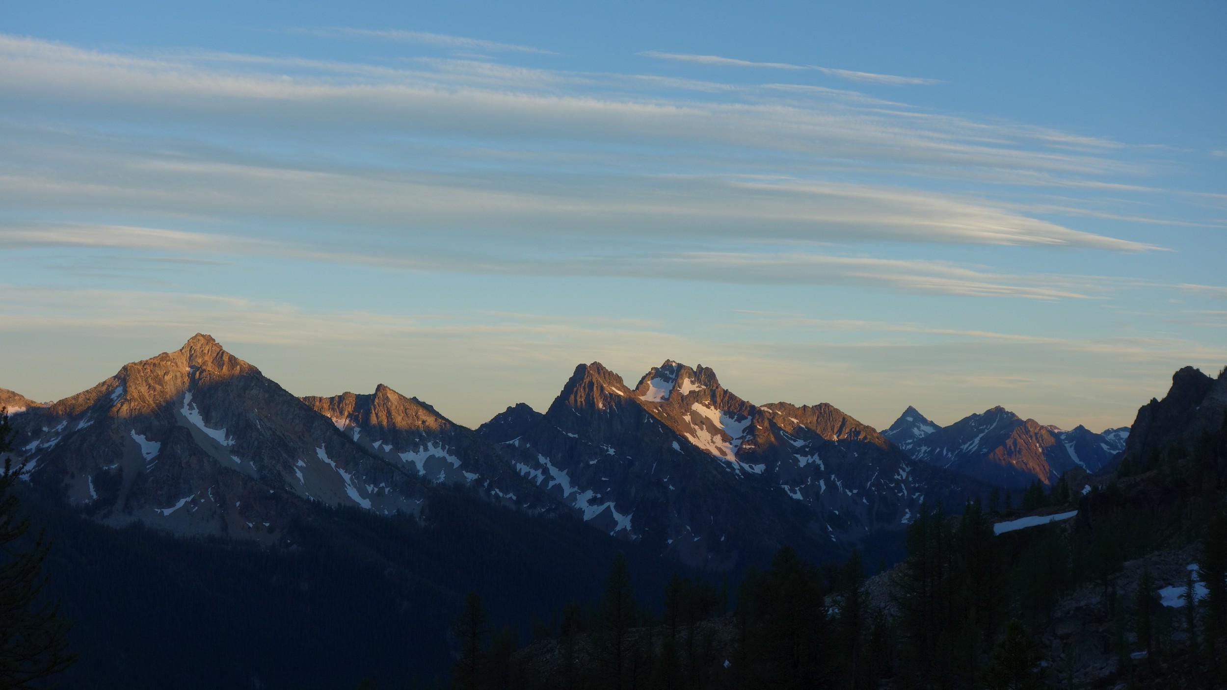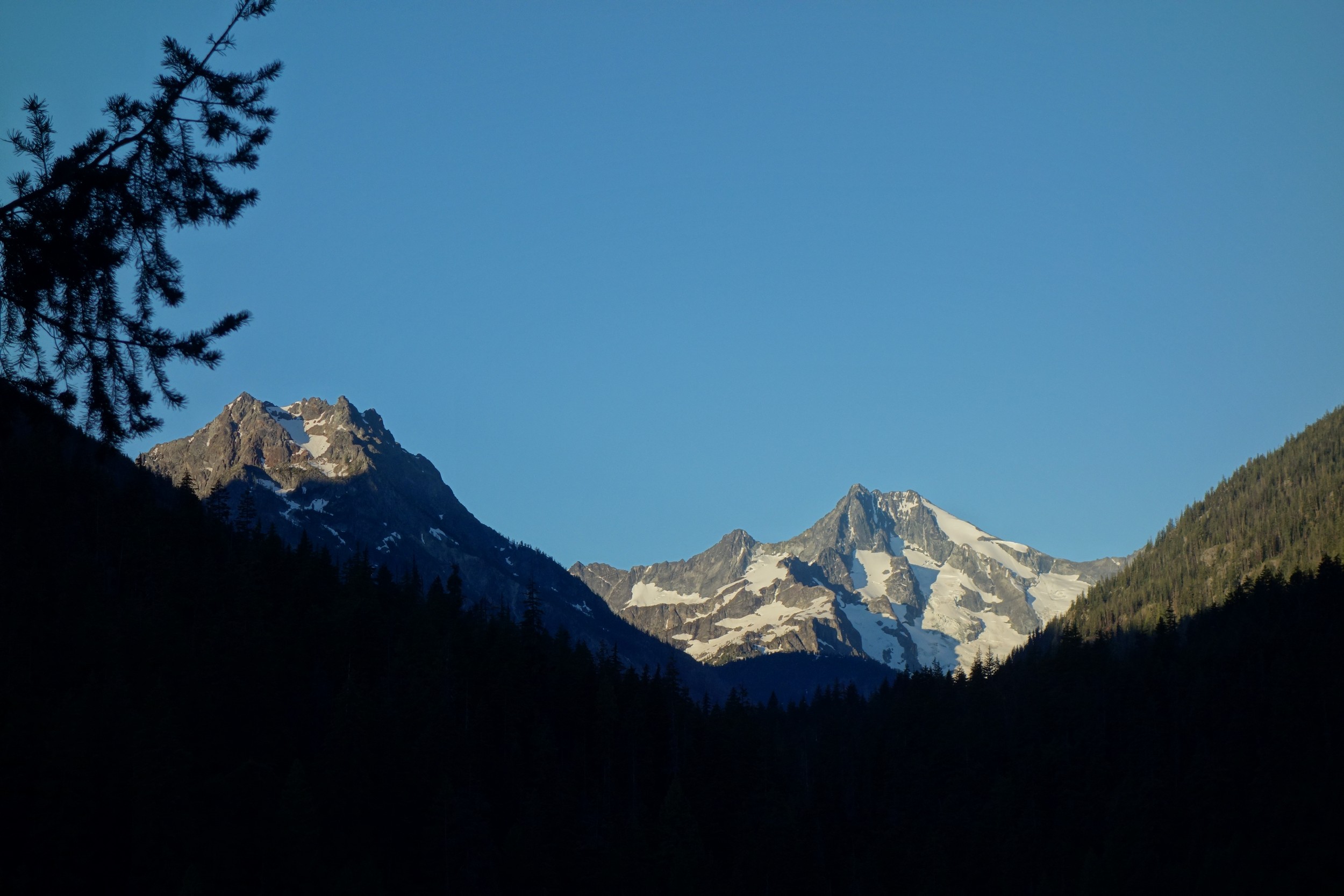 This is a continuation of my report for Mount Logan. After returning back to Stehekin, eating a very good burger and making my way back to the Company creek TH, I bivied by the trailhead and started hiking up the trail around 5am. It was an initially steep hike up to 2800 feet on good trail, then it flattened out and remained easy, occasionally with a little brush overgrowing it until the log crossing. Views of the sun hitting the east face of Bonanza were stunning, and unexpected! I ran into a trail crew working on clearing out the trail and saw their tools scattered around. After a brief chat, I crossed the bridge and continued for a few minutes to the small creek draining the valley below the west face of Tupshin Peak. Just a few more minutes up the trail I began schwacking straight up the west facing slopes on White Goat Mountain. I utilized many veggie belays and scrambled small rock cliffs, avoiding most of any brushy areas. I actually went straight through the steepest section in the 4200-4600 range.
