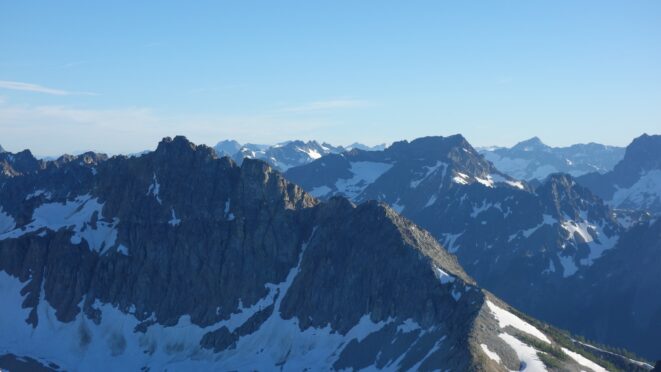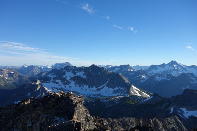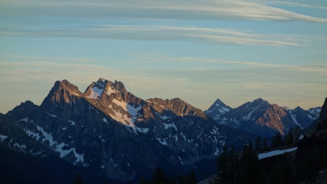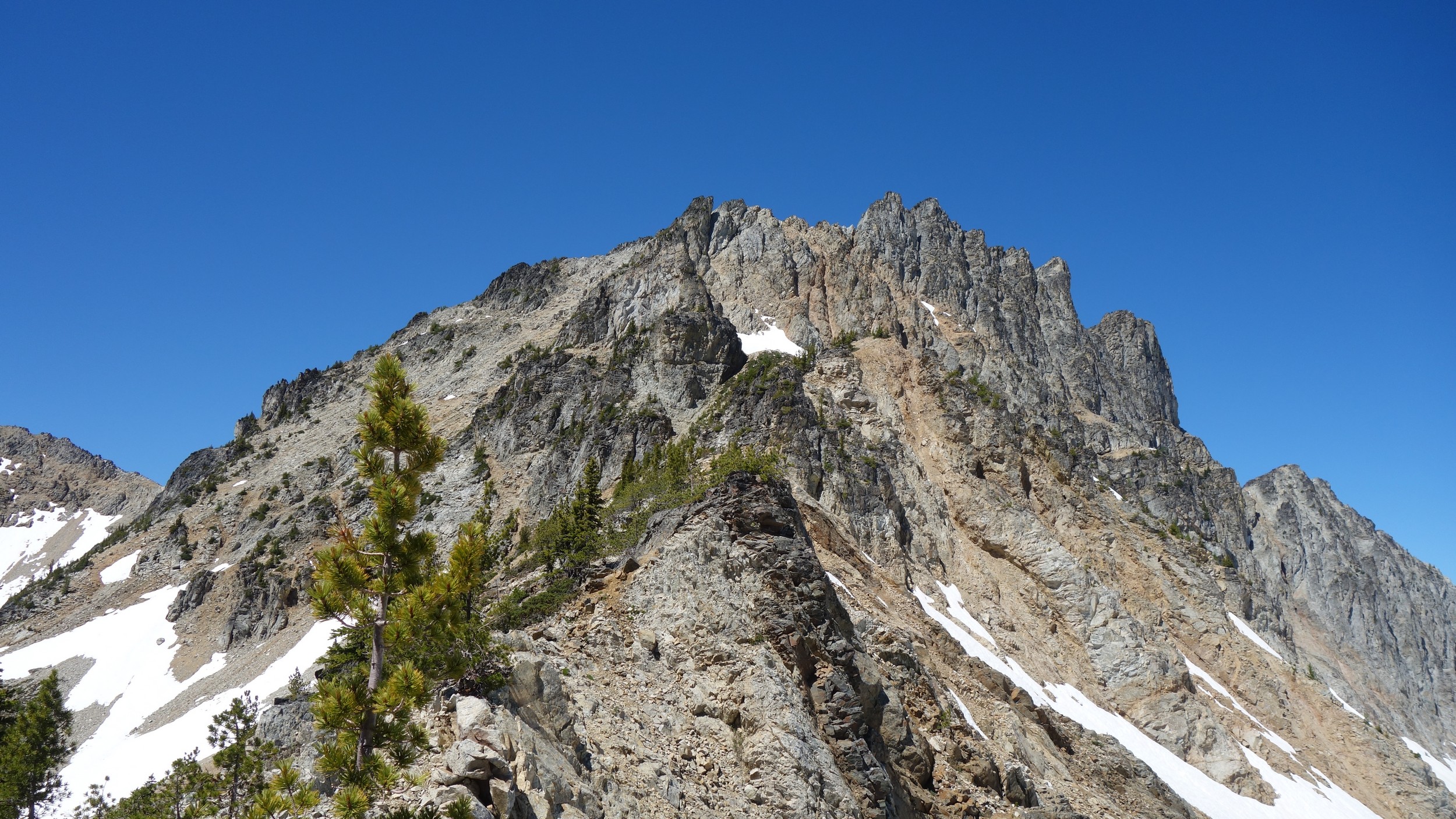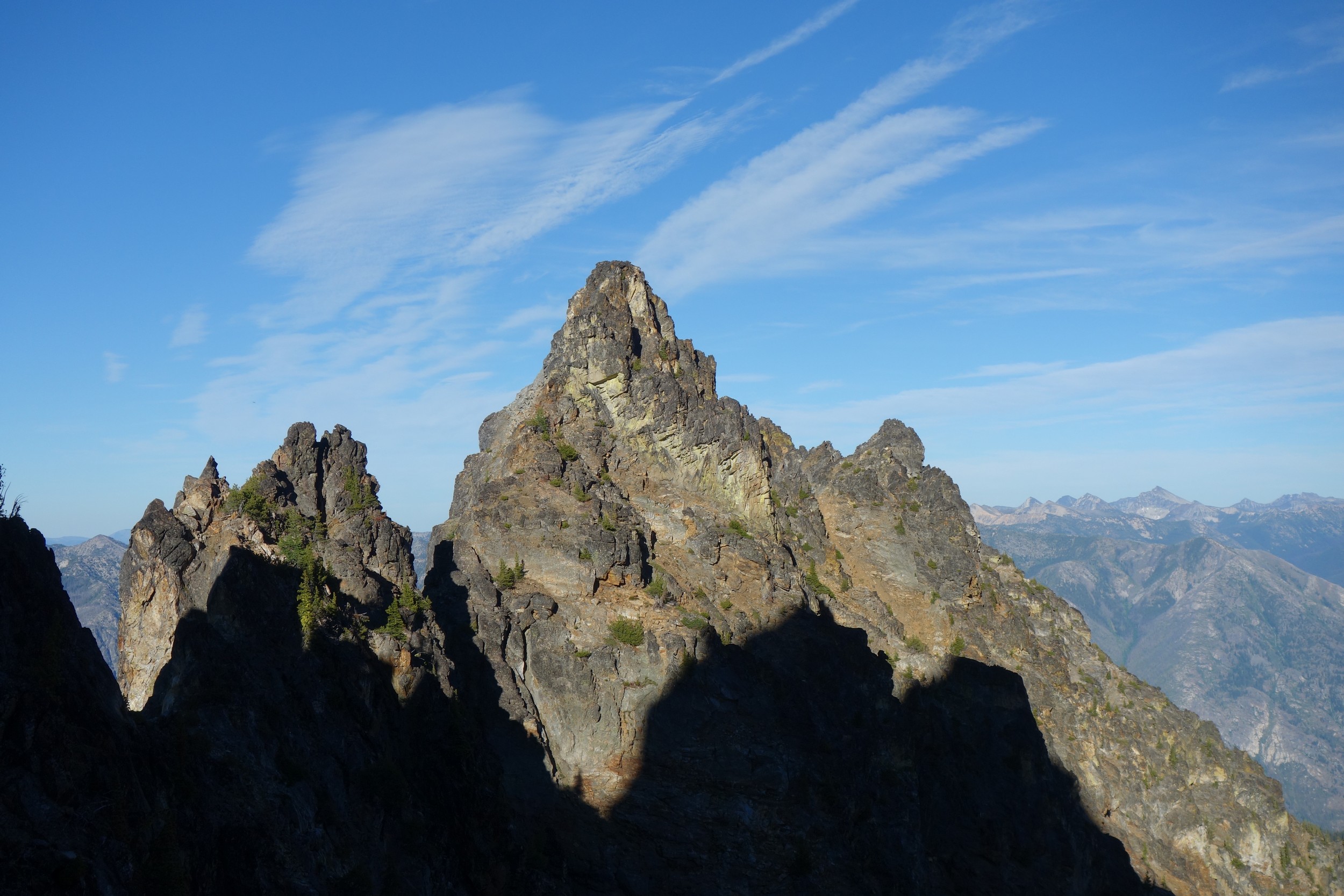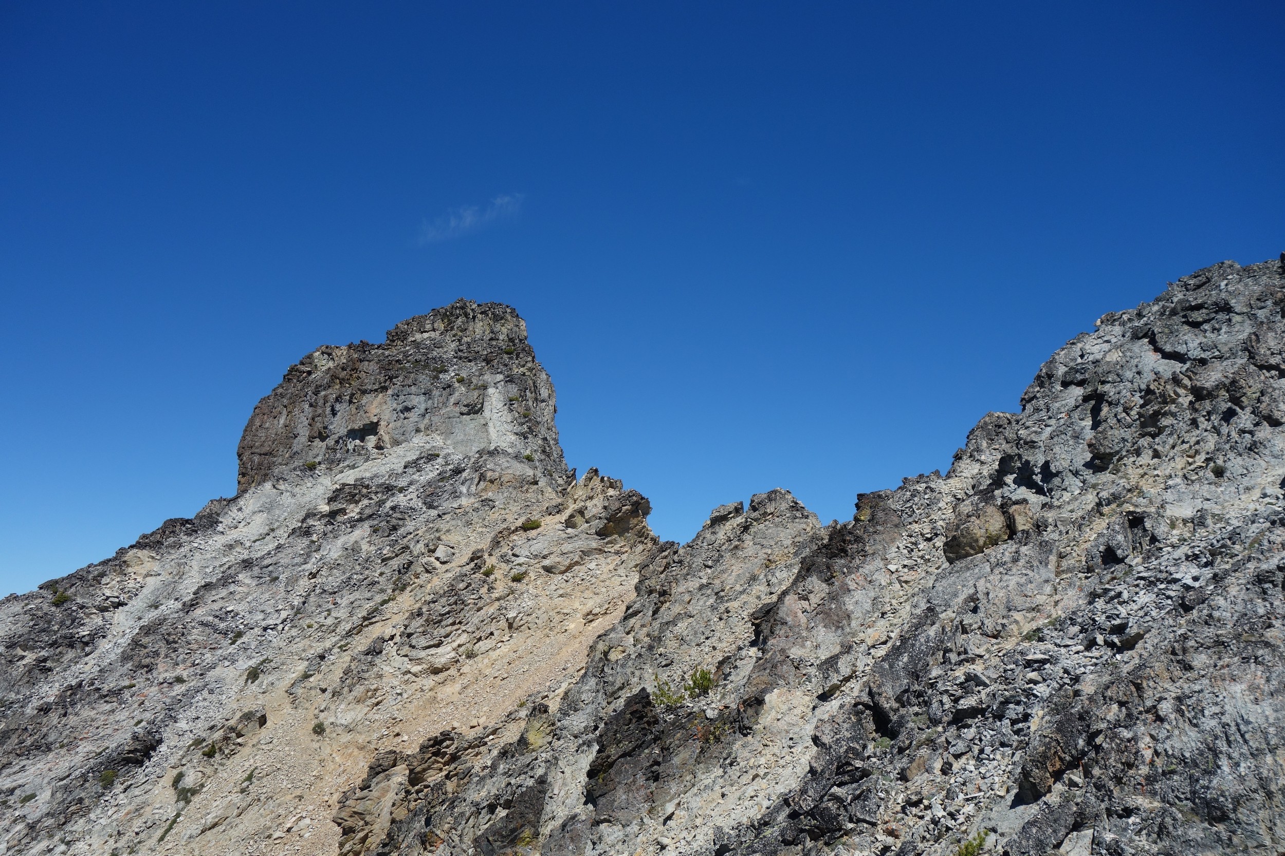 This is a continuation of my report for Mount Logan. After returning back to Stehekin, eating a very good burger and making my way back to the Company creek TH, I bivied by the trailhead and started hiking up the trail around 5am. It was an initially steep hike up to 2800 feet on good trail, then it flattened out and remained easy, occasionally with a little brush overgrowing it until the log crossing. Views of the sun hitting the east face of Bonanza were stunning, and unexpected! I ran into a trail crew working on clearing out the trail and saw their tools scattered around. After a brief chat, I crossed the bridge and continued for a few minutes to the small creek draining the valley below the west face of Tupshin Peak. Just a few more minutes up the trail I began schwacking straight up the west facing slopes on White Goat Mountain. I utilized many veggie belays and scrambled small rock cliffs, avoiding most of any brushy areas. I actually went straight through the steepest section in the 4200-4600 range.