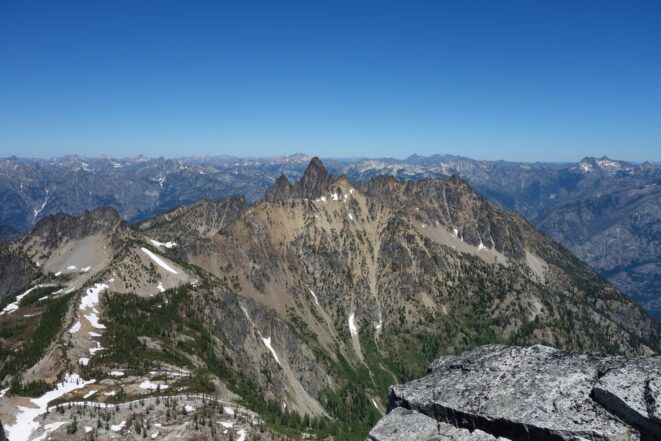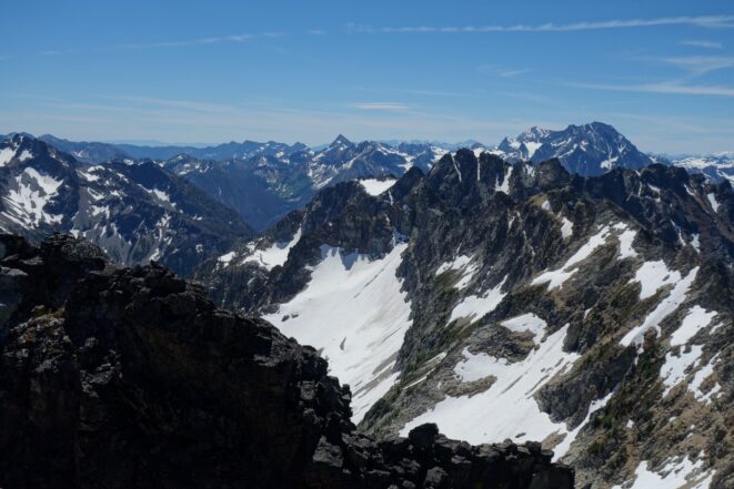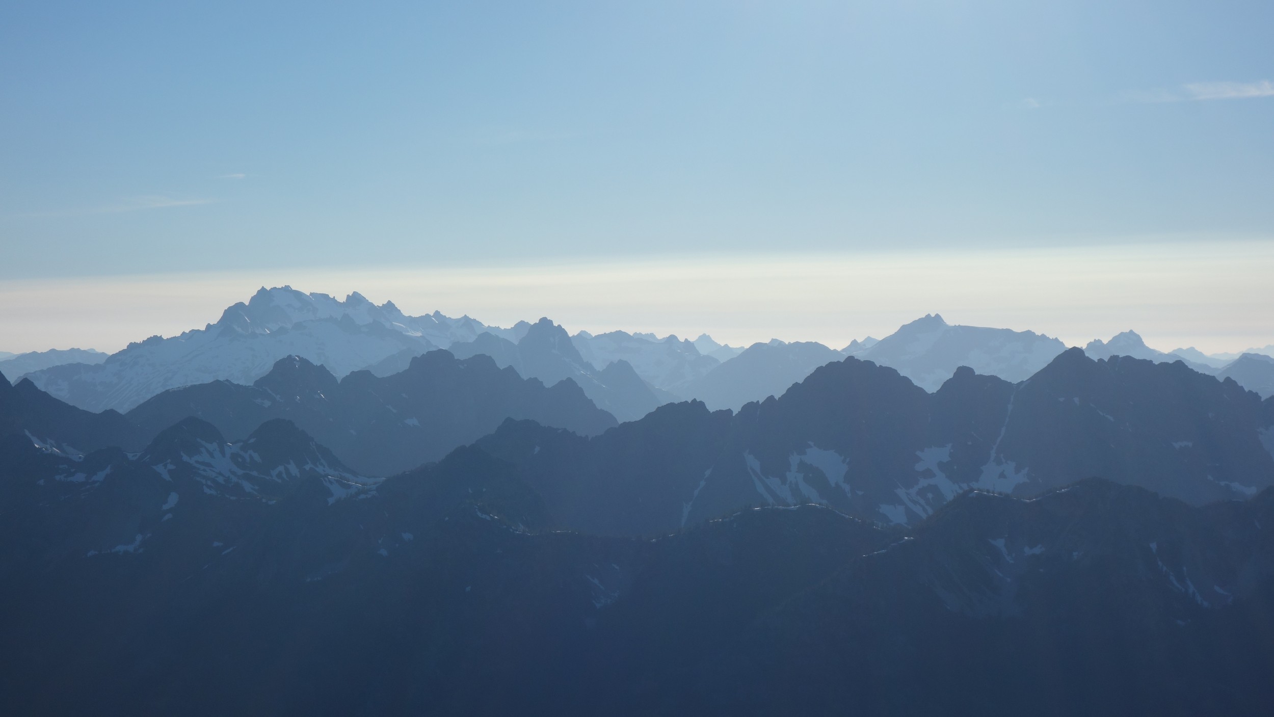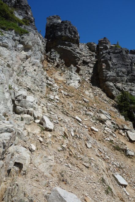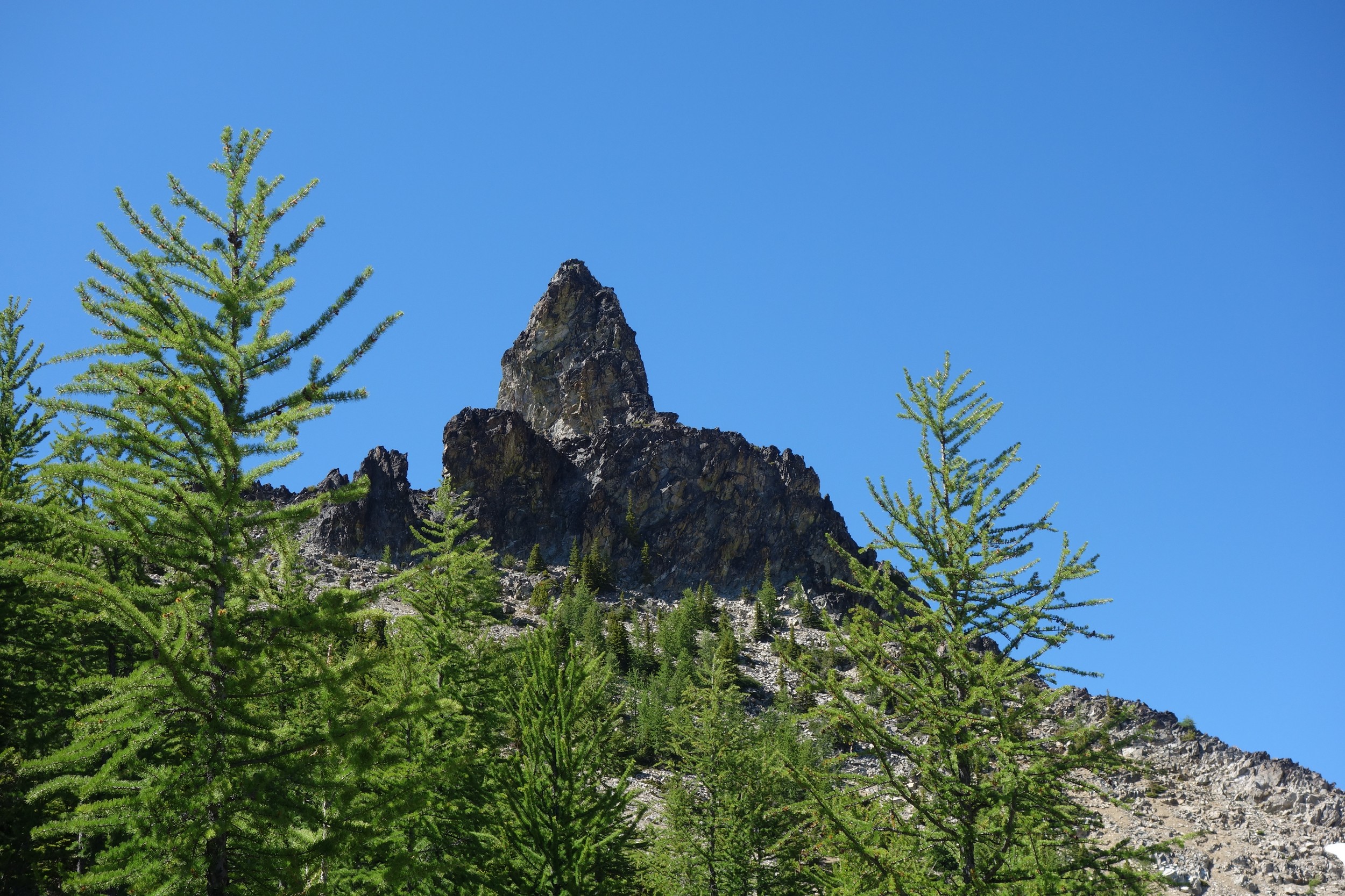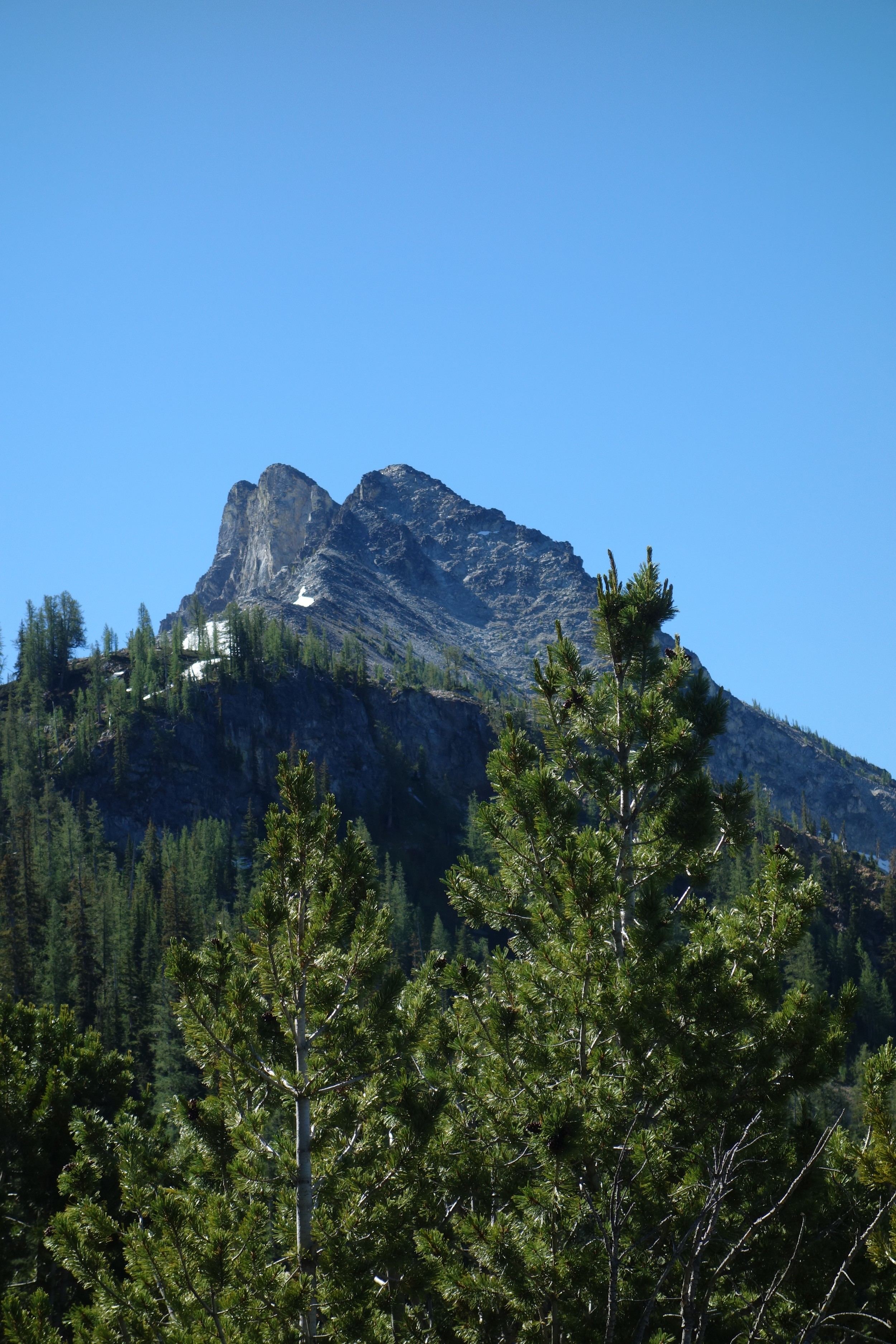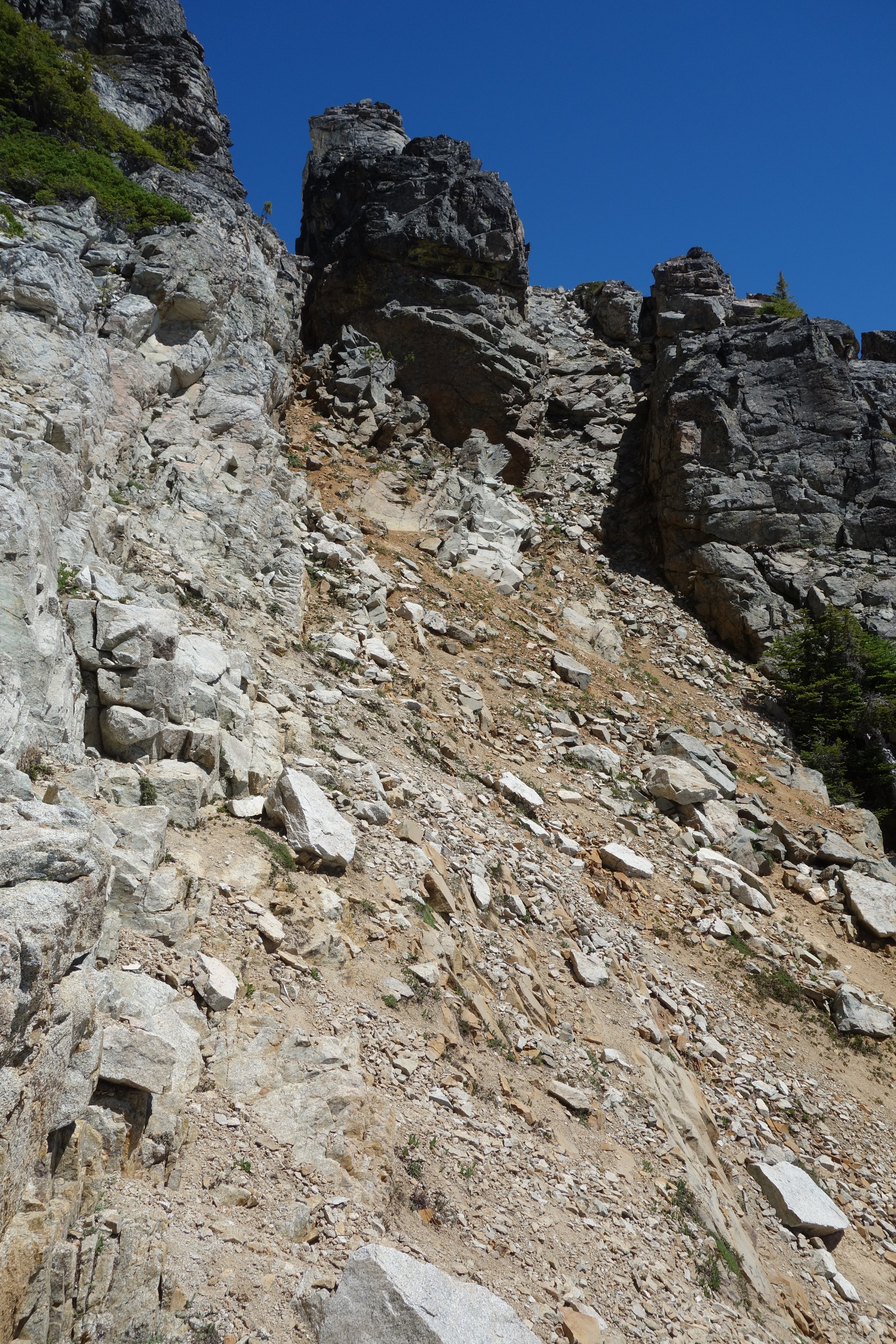 This is a continuation of my report for Mount Logan. After returning back to Stehekin, eating a very good burger and making my way back to the Company creek TH, I bivied by the trailhead and started hiking up the trail around 5am. It was an initially steep hike up to 2800 feet on good trail, then it flattened out and remained easy, occasionally with a little brush overgrowing it until the log crossing. Views of the sun hitting the east face of Bonanza were stunning, and unexpected! I ran into a trail crew working on clearing out the trail and saw their tools scattered around. After a brief chat, I crossed the bridge and continued for a few minutes to the small creek draining the valley below the west face of Tupshin Peak. Just a few more minutes up the trail I began schwacking straight up the west facing slopes on White Goat Mountain. I utilized many veggie belays and scrambled small rock cliffs, avoiding most of any brushy areas. I actually went straight through the steepest section in the 4200-4600 range.