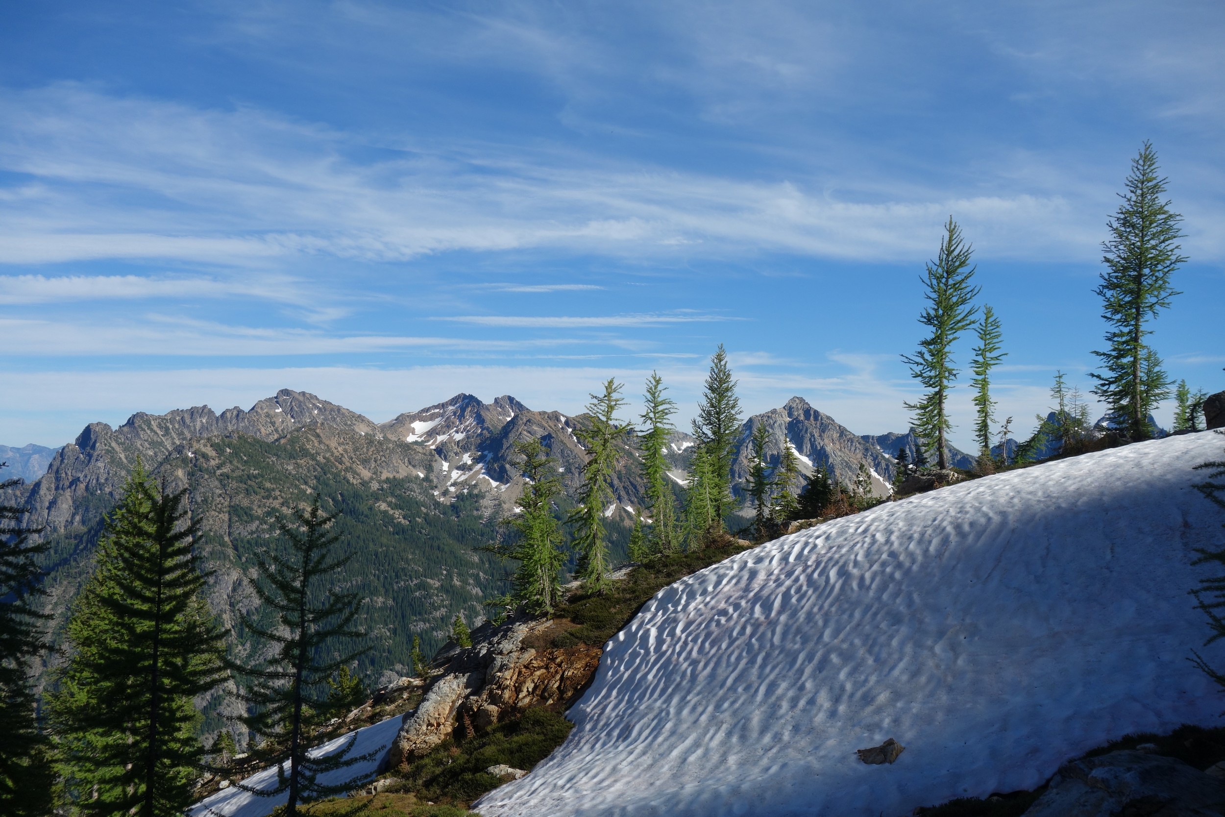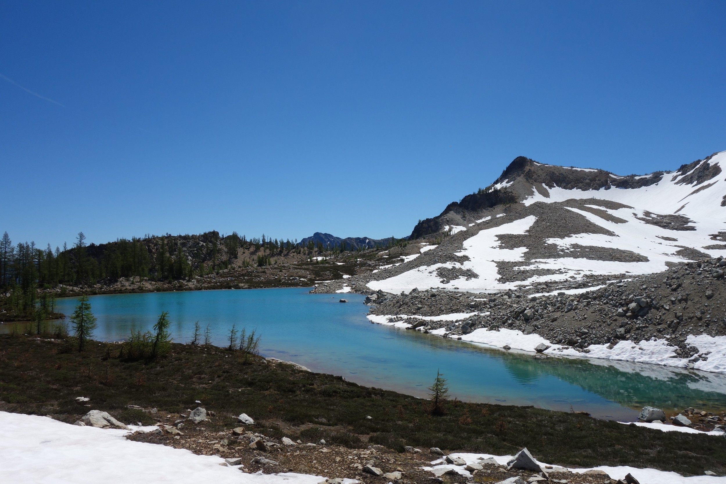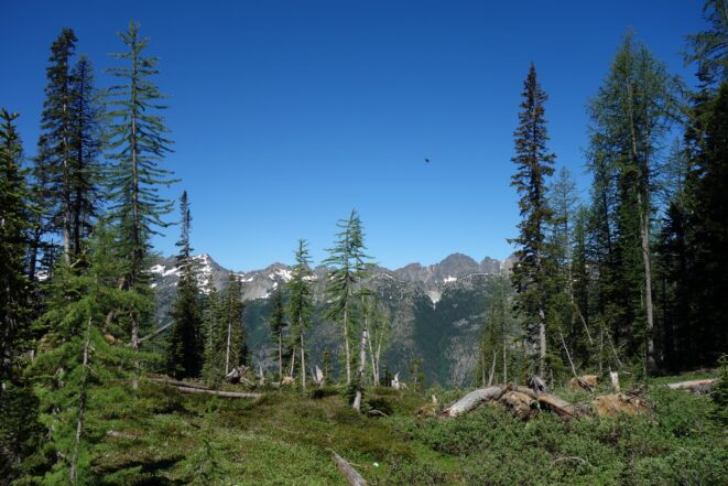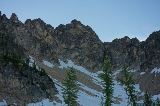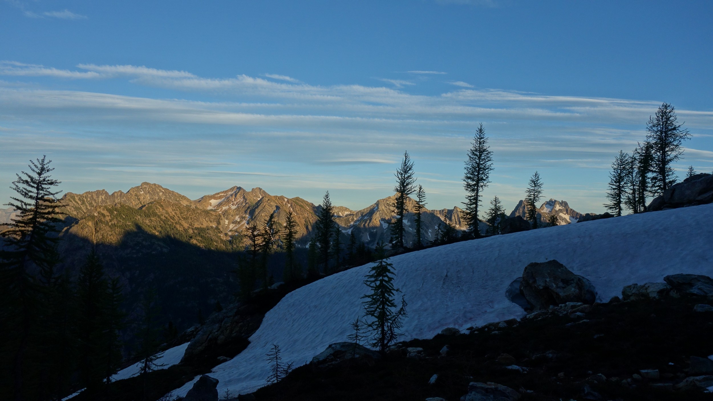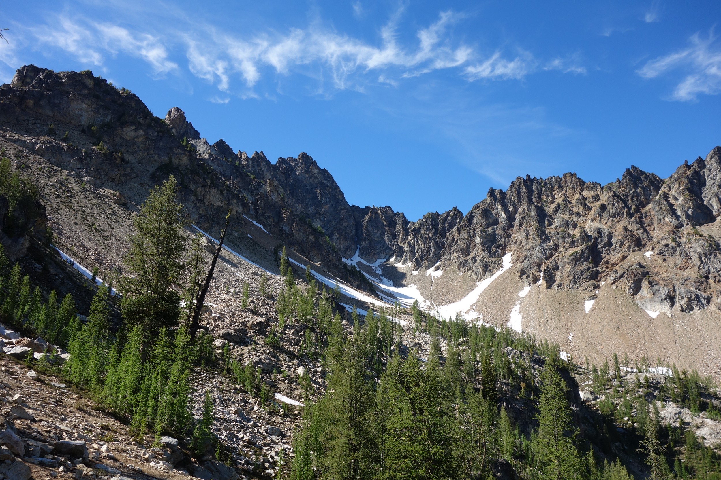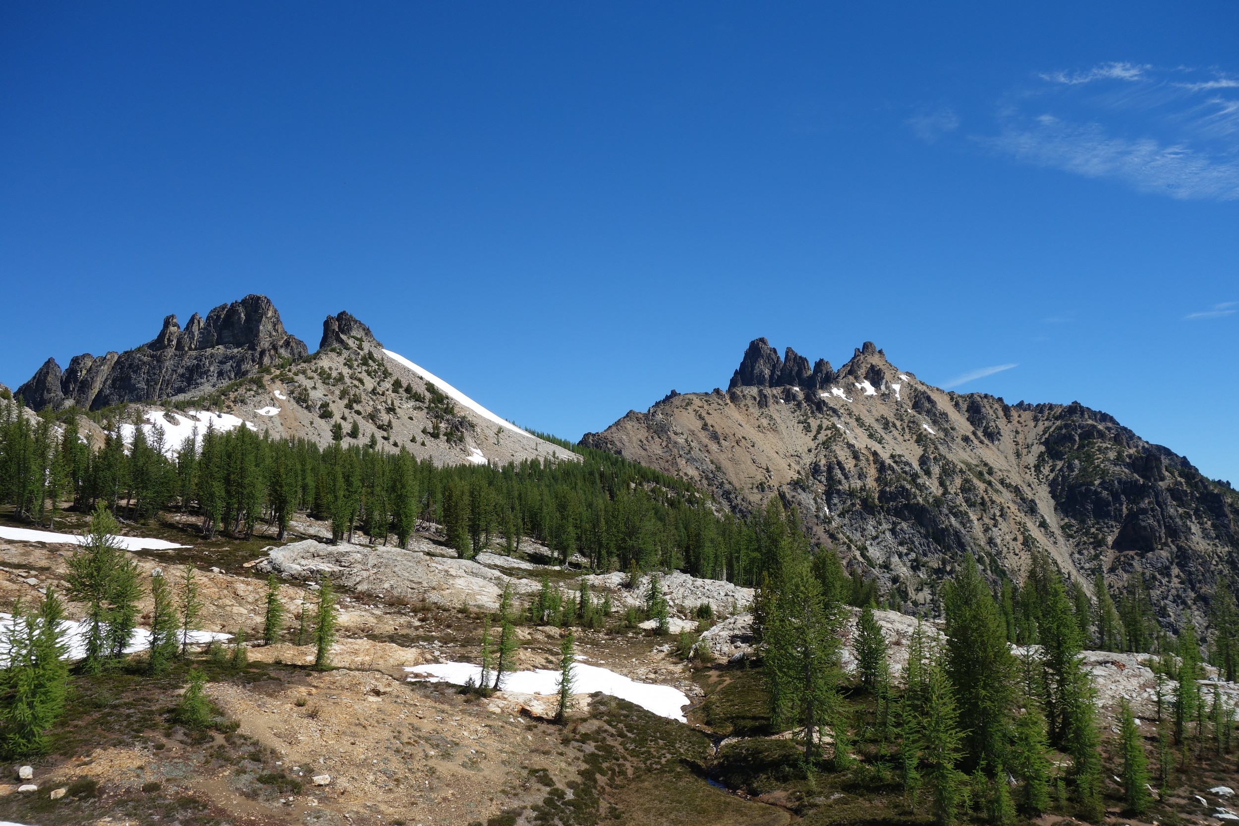 I quickly retraced my steps back down the ridge, then down the snow to my pack and began hiking back to the lakes. I would have really loved to stay here for the night, but I knew I needed to make the traverse around to Tupshin in order to make it out in time to catch the ferry at noon the next day. So I began traversing through the larch heaven in a northward direction until I was able to spot the class 3 ledges that drop right below Whitegoat Peak. This key section is hard to spot from above, as the entire area is cliffs below. Do NOT try to descend Bird Creek. The class 3 ledges bring you down from 7400 to 7000 feet through the only weakness in the cliff down to the basin below the southeast side of whitegoat. I was lucky to have a bunch of snow covering the loose talus so I made great time running down the basin, but then the sidehill traverse began. I stayed roughly at the 6700 foot range, never dropping below 6600 feet traversing the open grassy terrain until cresting the lower south ridge of Tupshin at 7000 feet where it was flat. I then entered the basin SE of Tupshin and ascended 200 feet or so to the highest larch trees and found the flat spot and the creek mentioned before. I cooked myself dinner, not planning to do anything else for the day and prepared my bivy site. I relaxed for a few minutes and took my shoes off to dry them out a little while I still had a few minutes of direct sunlight left. After awhile I checked the time and was shocked to see it was only 6pm! I thought about it for a bit and decided to just do Tupshin right then and there.
