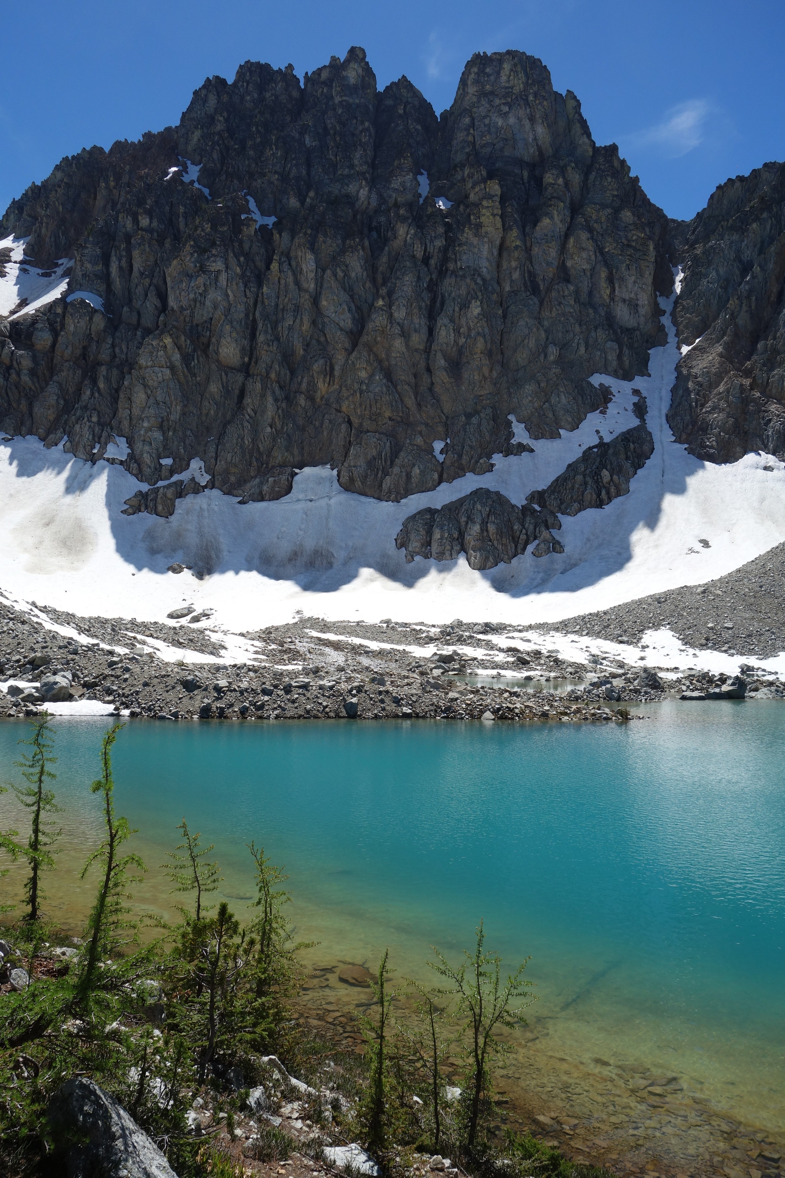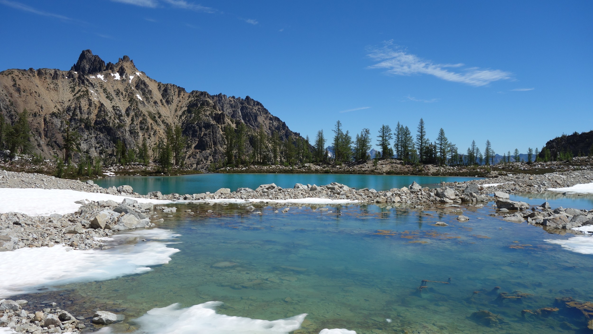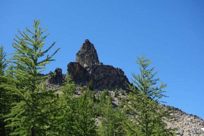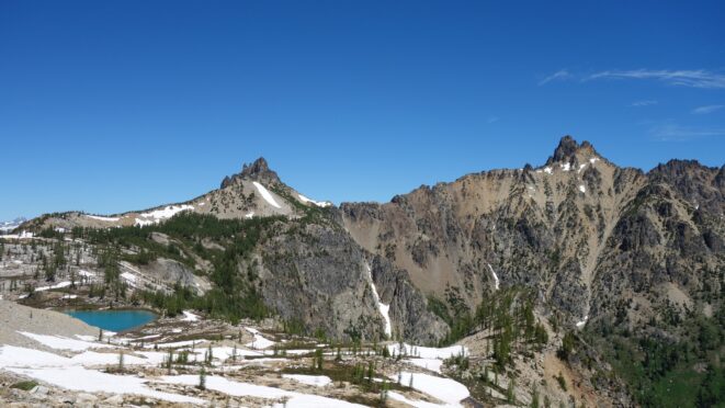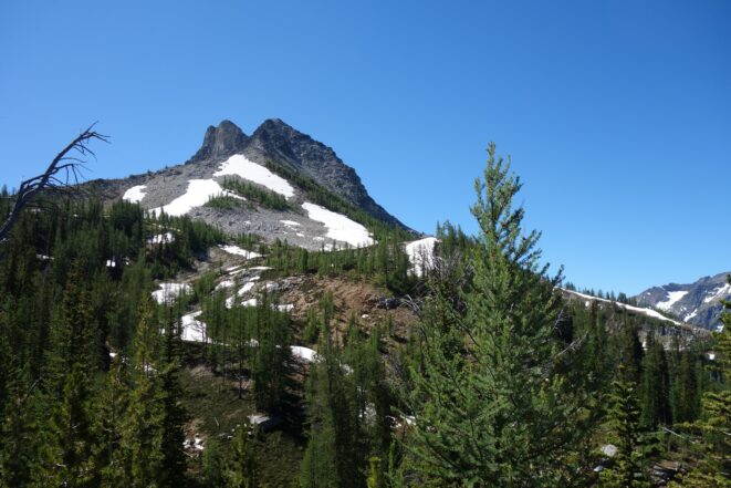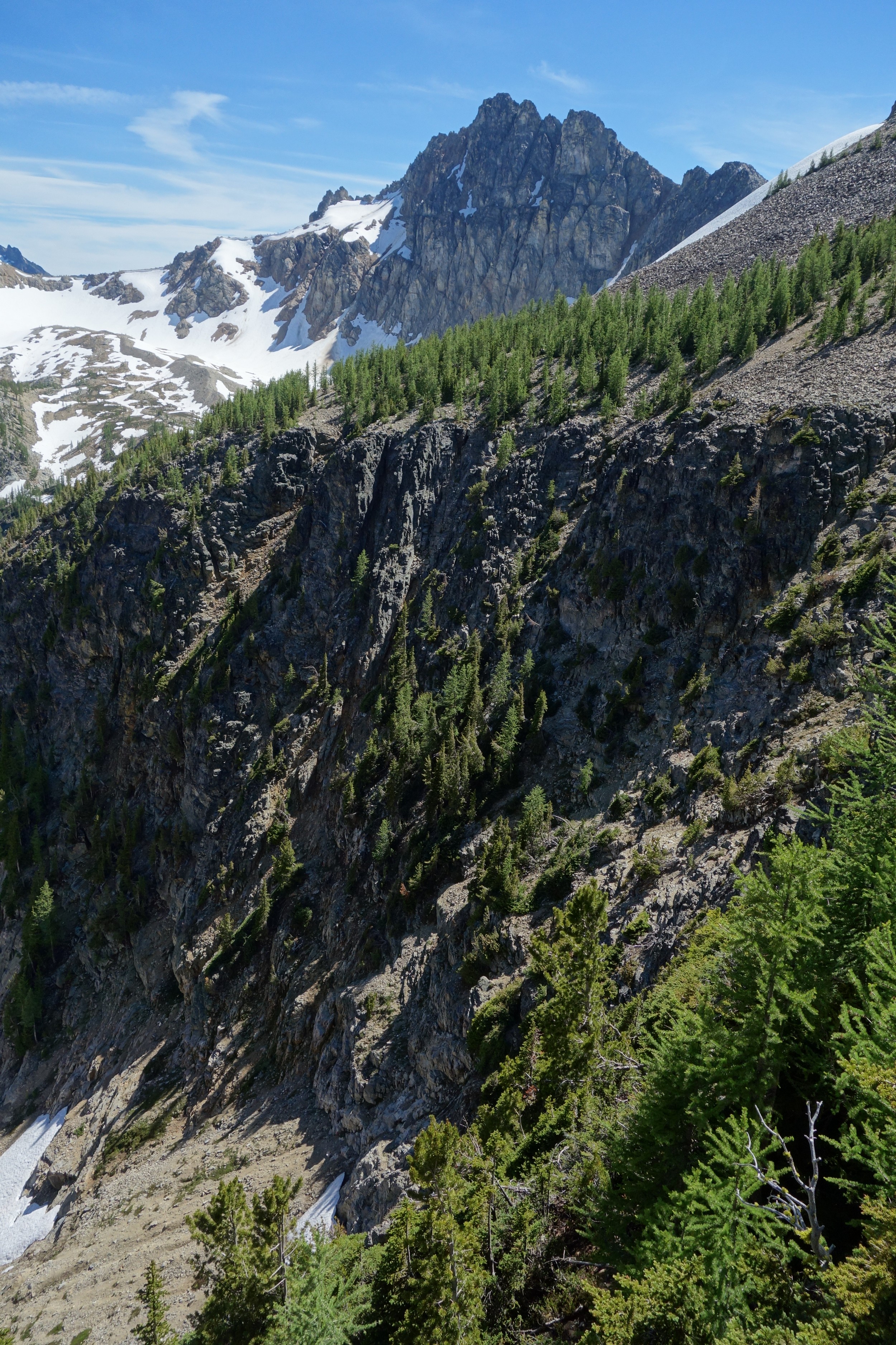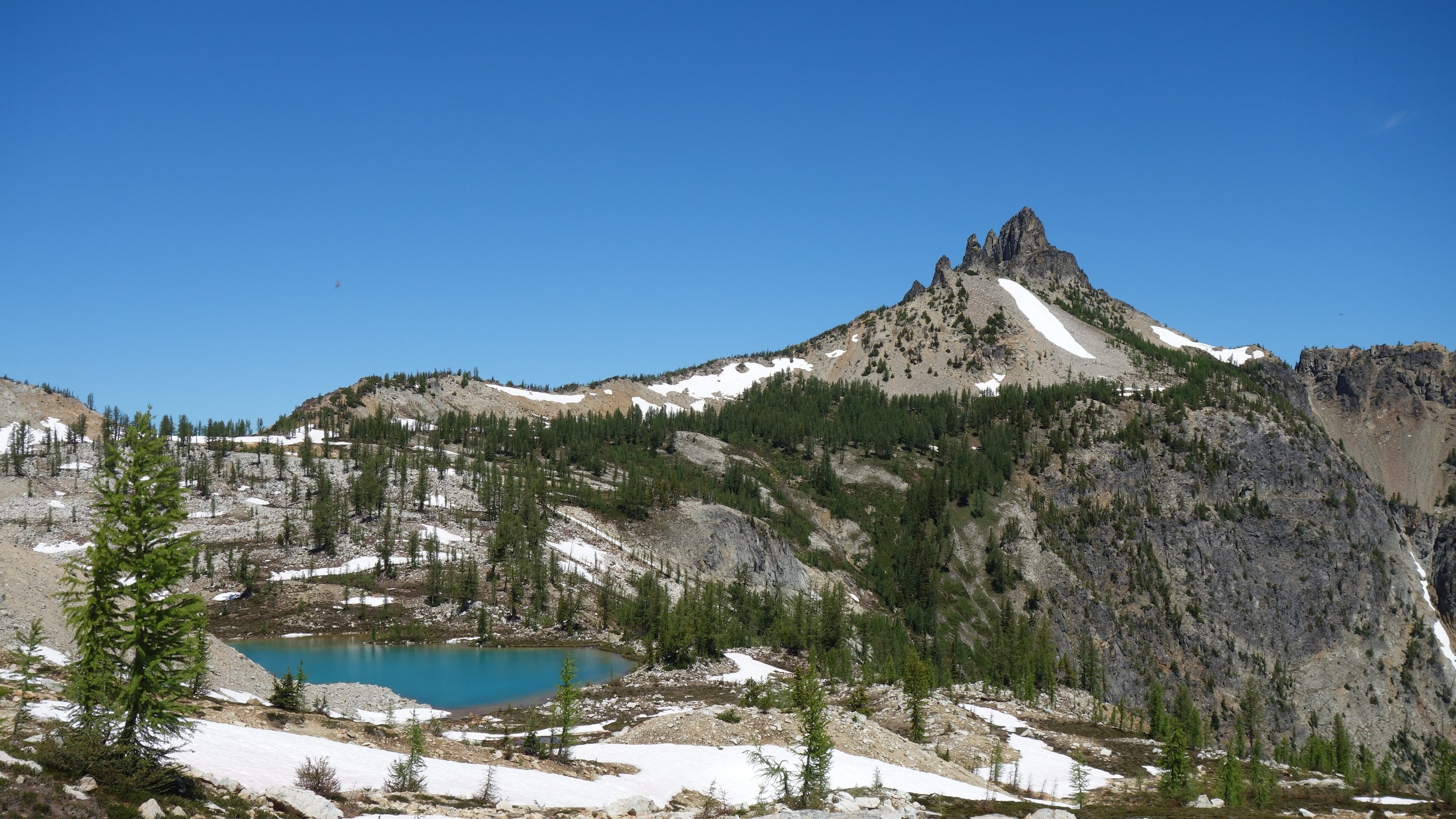 I quickly retraced my steps back down the ridge, then down the snow to my pack and began hiking back to the lakes. I would have really loved to stay here for the night, but I knew I needed to make the traverse around to Tupshin in order to make it out in time to catch the ferry at noon the next day. So I began traversing through the larch heaven in a northward direction until I was able to spot the class 3 ledges that drop right below Whitegoat Peak. This key section is hard to spot from above, as the entire area is cliffs below. Do NOT try to descend Bird Creek. The class 3 ledges bring you down from 7400 to 7000 feet through the only weakness in the cliff down to the basin below the southeast side of whitegoat. I was lucky to have a bunch of snow covering the loose talus so I made great time running down the basin, but then the sidehill traverse began. I stayed roughly at the 6700 foot range, never dropping below 6600 feet traversing the open grassy terrain until cresting the lower south ridge of Tupshin at 7000 feet where it was flat. I then entered the basin SE of Tupshin and ascended 200 feet or so to the highest larch trees and found the flat spot and the creek mentioned before. I cooked myself dinner, not planning to do anything else for the day and prepared my bivy site. I relaxed for a few minutes and took my shoes off to dry them out a little while I still had a few minutes of direct sunlight left. After awhile I checked the time and was shocked to see it was only 6pm! I thought about it for a bit and decided to just do Tupshin right then and there.