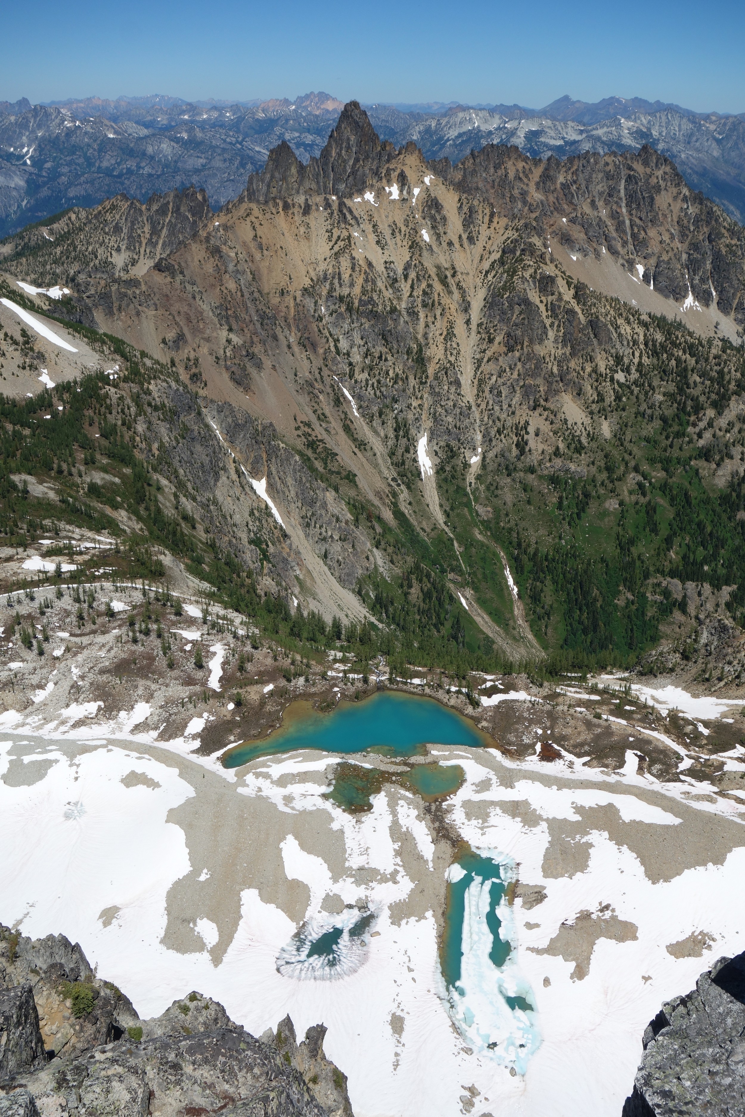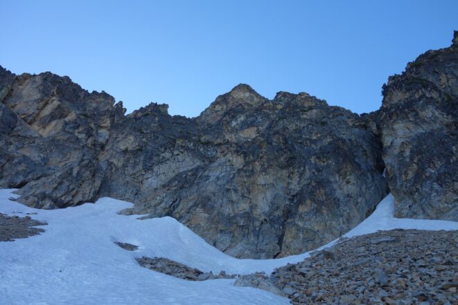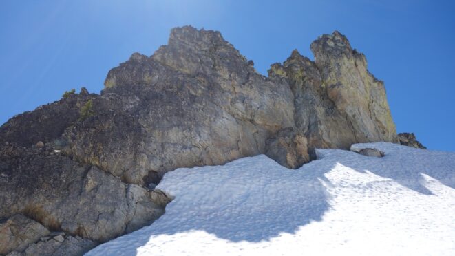 Beyond the steepest part, I started making my way rightward, beginning a long ascending traverse to the right. I crested over a small rib at 6200 feet and descended a few feet into the nice basin immediately west of Whitegoat. I continued across this basin southward and mad my way to the 7200 foot pass above Bird Lakes. This was truly a sight to behold! As I descended to the lakes, the rugged north face of Devore towered above, and I was wondering how exactly I would make it up! I rounded the lakes, the uppermost one still partially frozen, and aimed for the small 7280 foot moraine knob just SE of the lakes. Here I dropped my pack and began kicking steps in the snow to the small saddle in the lower east ridge. Once on the ridge, it was an easy ridgewalk to the base of the Bottles (the obvious double towers midway up the east ridge) around 7650 feet. I was easily able to traverse and ascend the snow on the north side of these towers to the small notch immediately west of them. Past reports in later season speak of traversing in the moat, however in early season it's east snow climbing with one short section about 40 degrees in steepness. I didn't have to lose any elevation doing this short traverse.