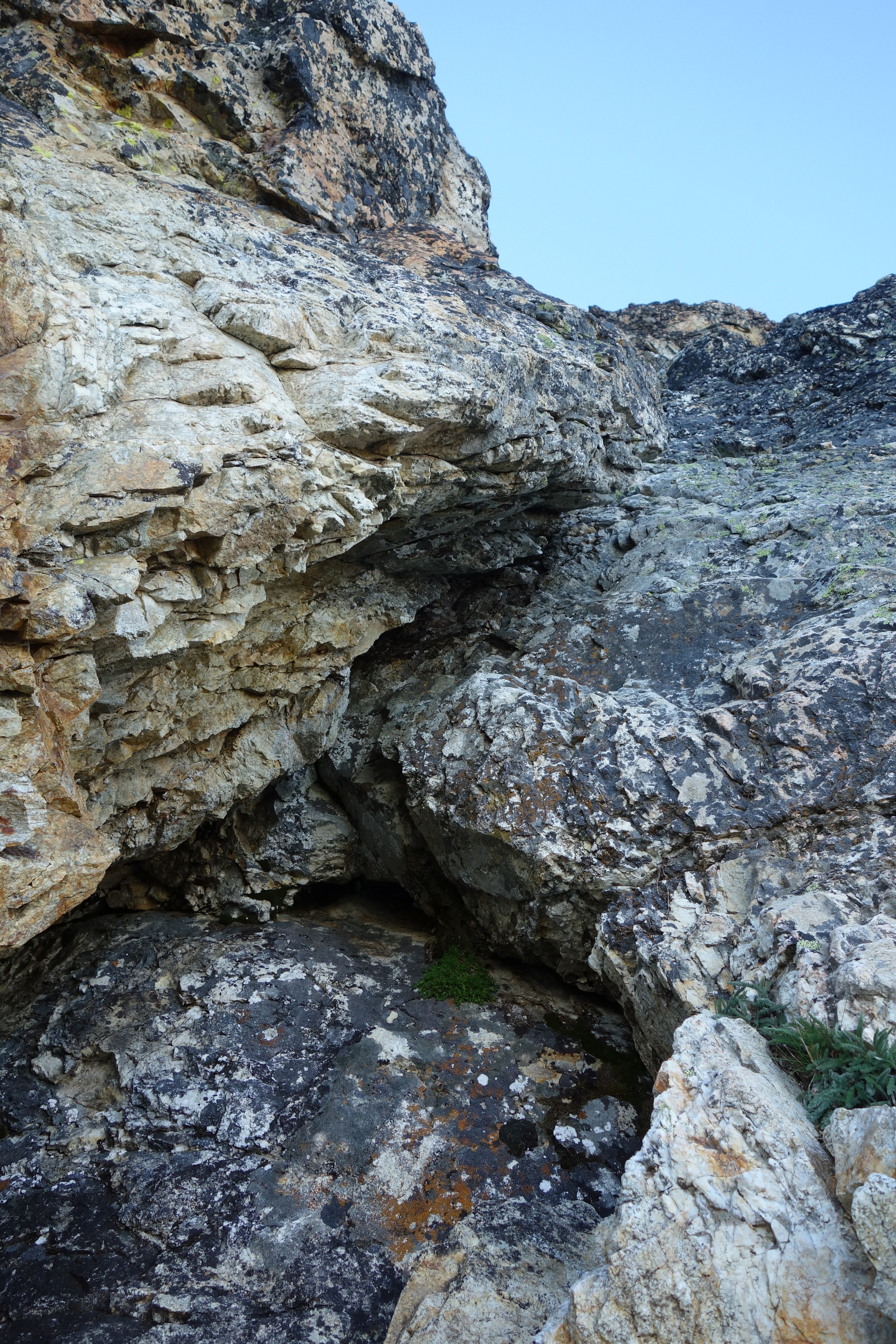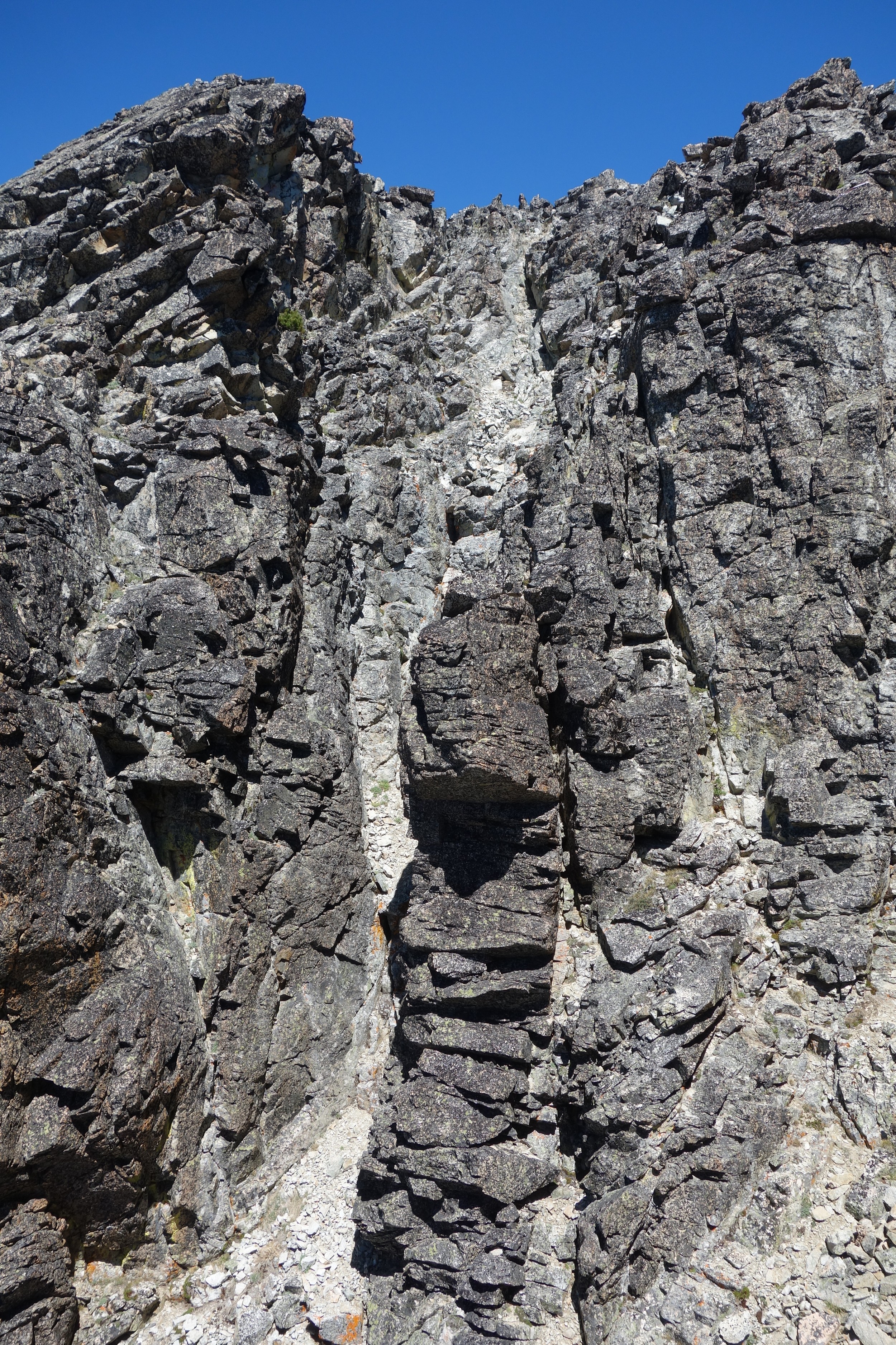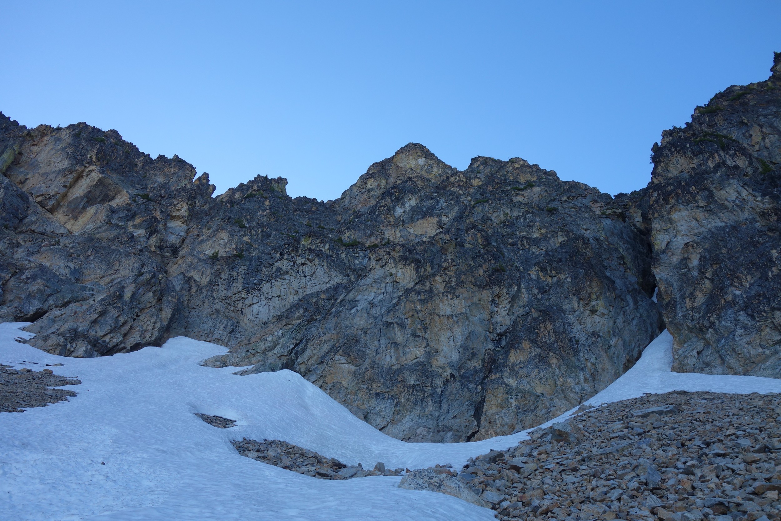 So I put my bivy gear aside and packed the rope and my rock shoes and ascended the 450 feet of snow to the obvious right trending ramp that marks the beginning of the scrambling. I was thankful not to have to ascend that talus without snow cover. I scrambled the slabby class 3 ramp which was at times covered in kitty litter, and found the short class 4 chimney. Above that it was more blocky ledges and class 3 scrambling until I hit the first crux, which Klenke describes as 5.hard. This right facing slightly overhanging flake can be avoided by scrambling out to the right, up a small ramp and rounding a very exposed corner and cutting back left on an easy ledge. A small descent is required to then meet back up with the ledge leading to the mandatory crux pitch. Here, I put on my rock shoes, and the rope on my back and left the pack. I had my harness on and a few slings in case my 30 meter rope wasn't long enough to rappel the whole crux pitch.