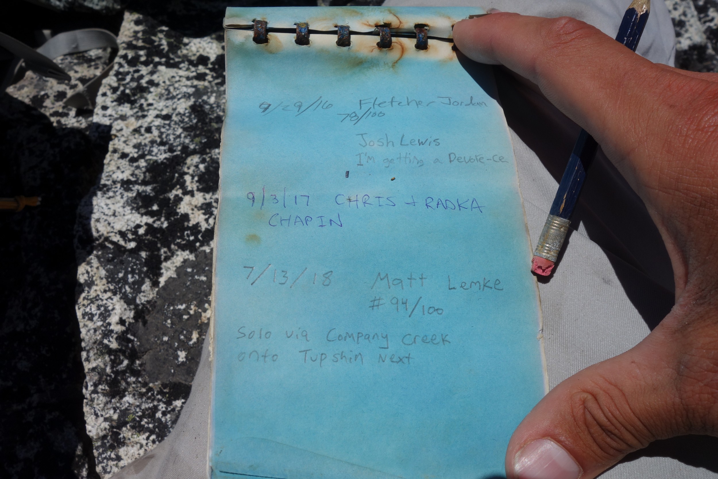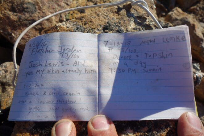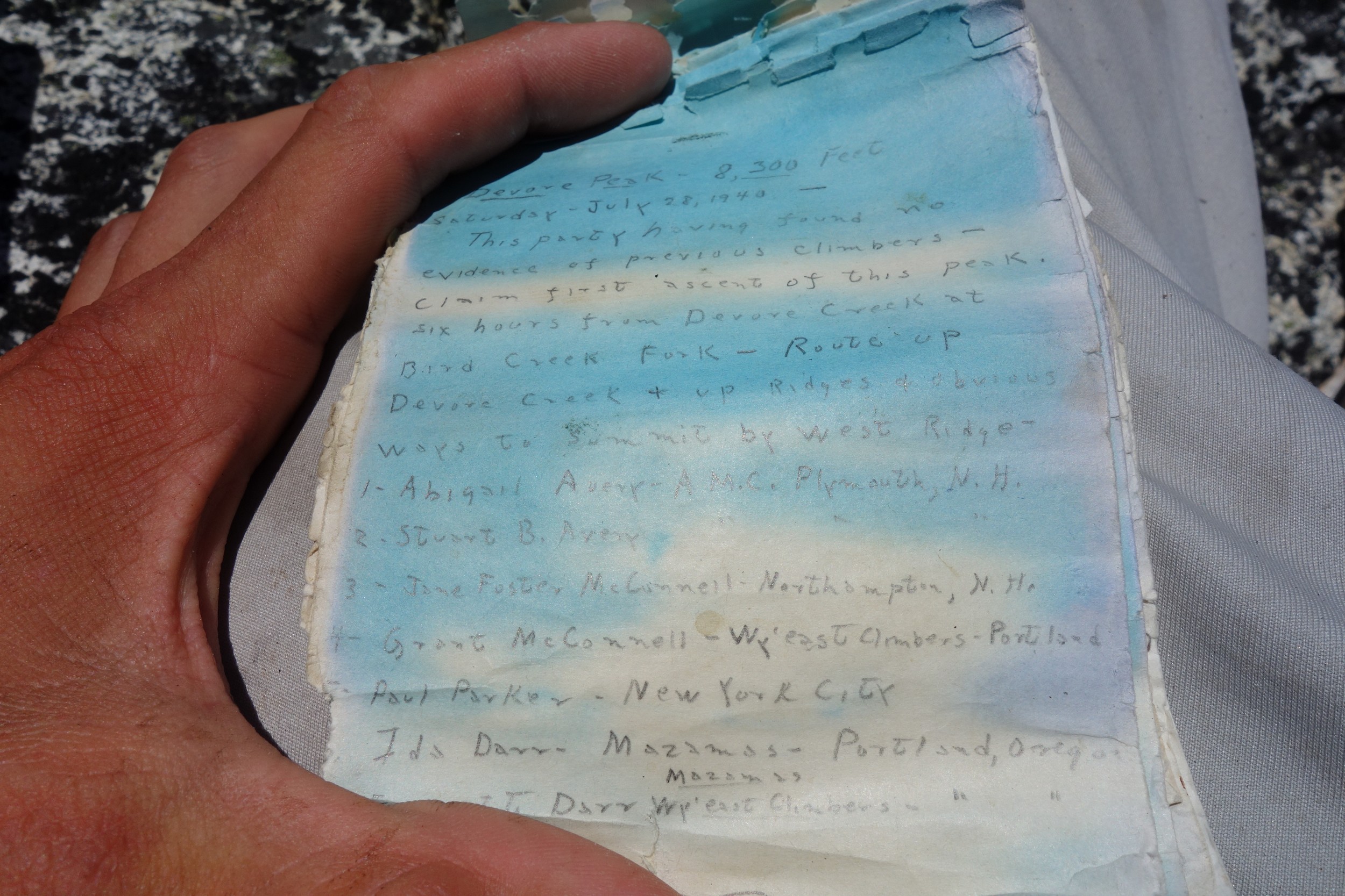 I then descended about 100 feet onto the south side of the ridge crossing through the notch, and followed a ledge traversing until below a long rambly Class 2-3 slope covered in somewhat loose rock. I quickly ascended this slope directly up to the crest of the south ridge, reaching it about 8200 feet where the false summit came into view not far away. I then followed cairns more or less just below the crest on the west side, utilizing small ledges to the 20 foot class 4 step. It is the obvious near vertical step right on the ride and cant be missed. I climbed it, then cut left a couple minutes on some class 2 talus until I was able to round the corner via the very exposed step around, at which point the true summit came into view. I descended maybe 15 feet and located the obvious Class 3-4 gully that leads straight to the summit. I was at the top around 1:30pm and signed the historic register. Unfortunately I forgot to bring up a replacement tube, so the register (placed in 1940!!) is still open to the elements. I didn't even have another bag to put it in, and the ones Fletcher and Radka placed are filled with holes. May not last the winter if no one goes up later this summer.