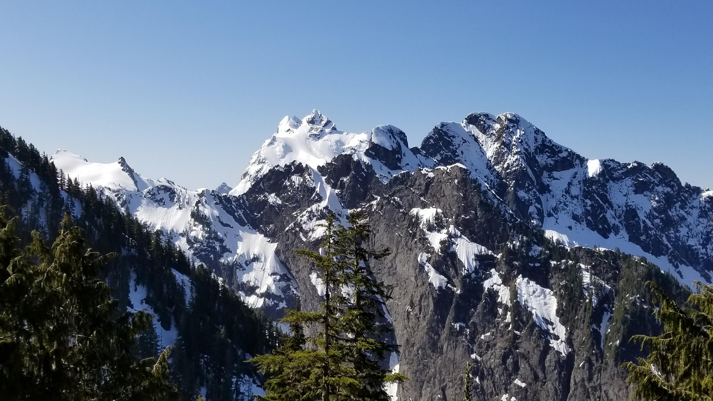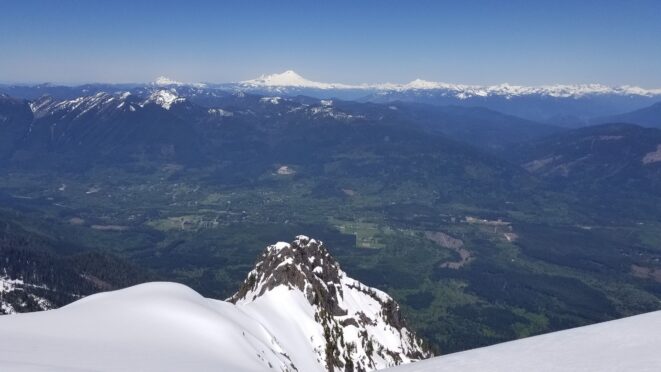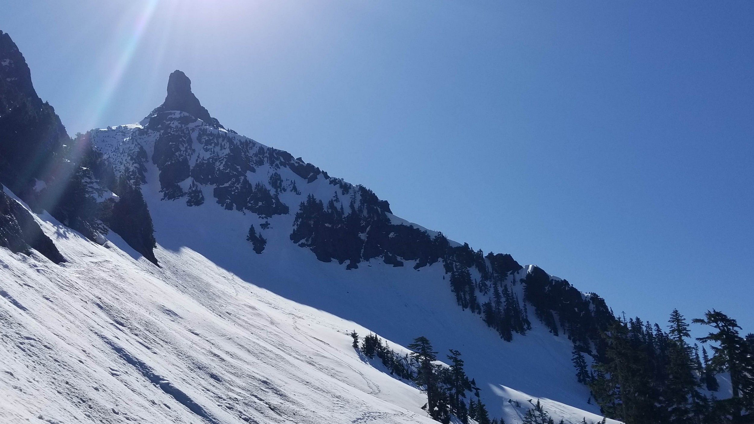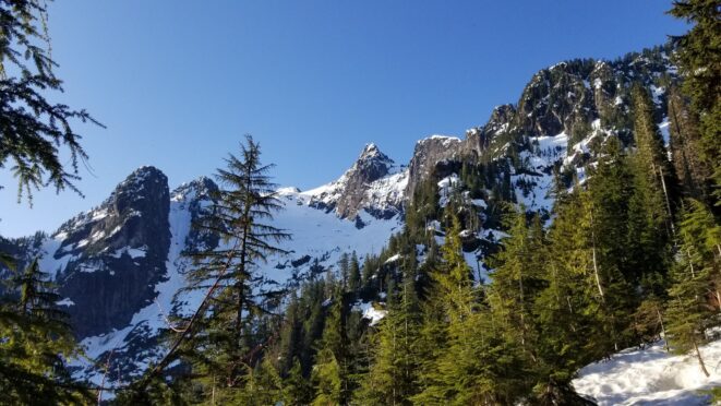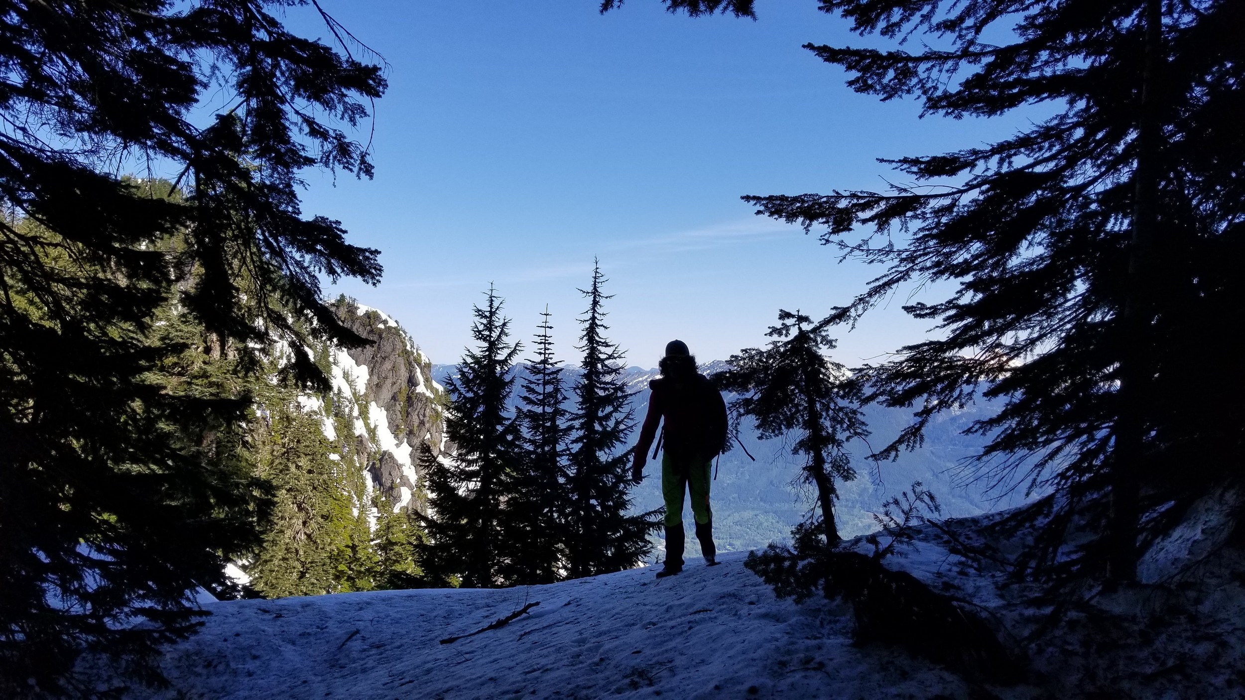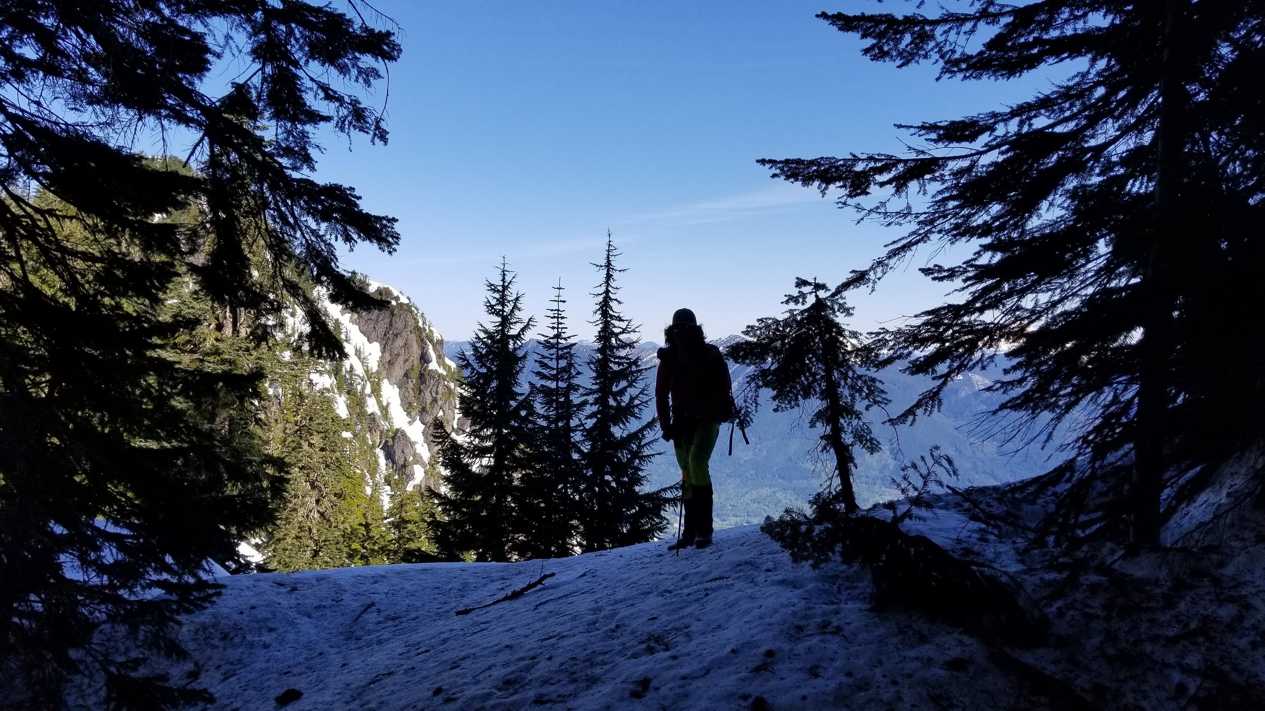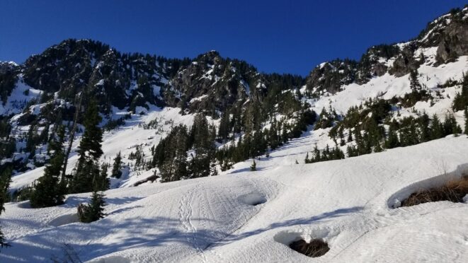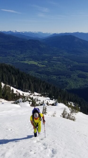 On Friday this past week, my friend Chris and I ascended Whitehorse Mountain via Lone Tree Pass. He had just moved up to Renton from Las Vegas, which coincidentally is where I am also staying right now, so it was easy to simply pick him up at 3:30AM and off we went in my van to Darrington. Upon reaching the trailhead a couple hours later, we saddled up and got moving at 5:45am up the wide and gentle old road. I decided to only bring leather hiking shoes and microspikes, hoping the snow would not be super icy at the top. We also brought a thin 60 meter rope and a picket to make a rappel from the summit if we needed to. The hike up the trail leading up the lower NW slopes through the forest was quite pleasant, and was flagged quite a bit too making it easy to follow in areas where the slide alder had bounced up. When we hit 2600 feet, we emerged into the open slopes, and luckily this is where we hit consistent snow because this area would be full of slide alder in a months’ time. With good snow coverage though, and being early enough in the morning, we were able to follow tracks from a party that headed up the day before, and on firm snow all the way to Lone Tree Pass which we reached about 9am. The snow never exceeded 40 degrees on this whole ascent to the pass, and most of it was in the 25-30 degree range. We made a point to look out for wet slides when we were descending.