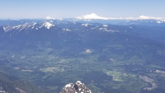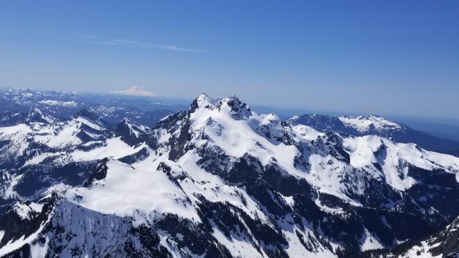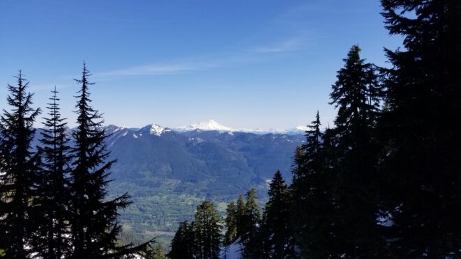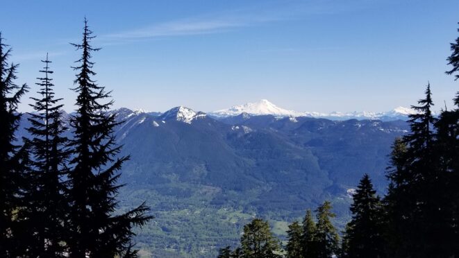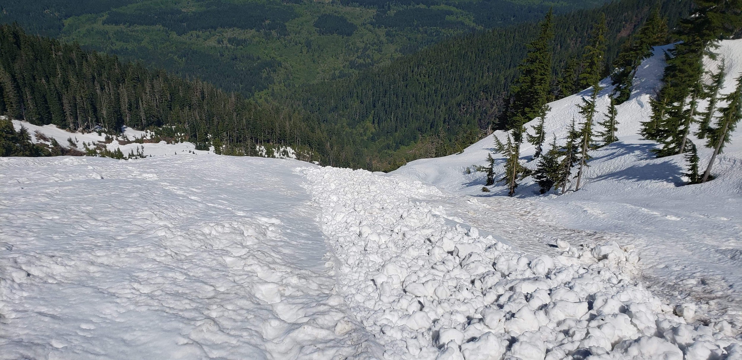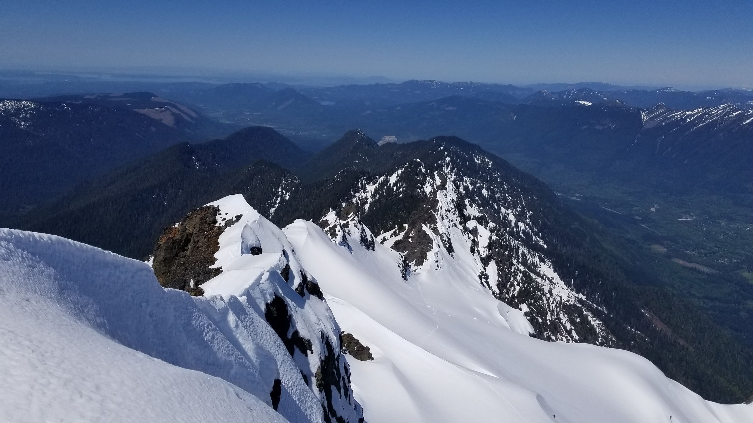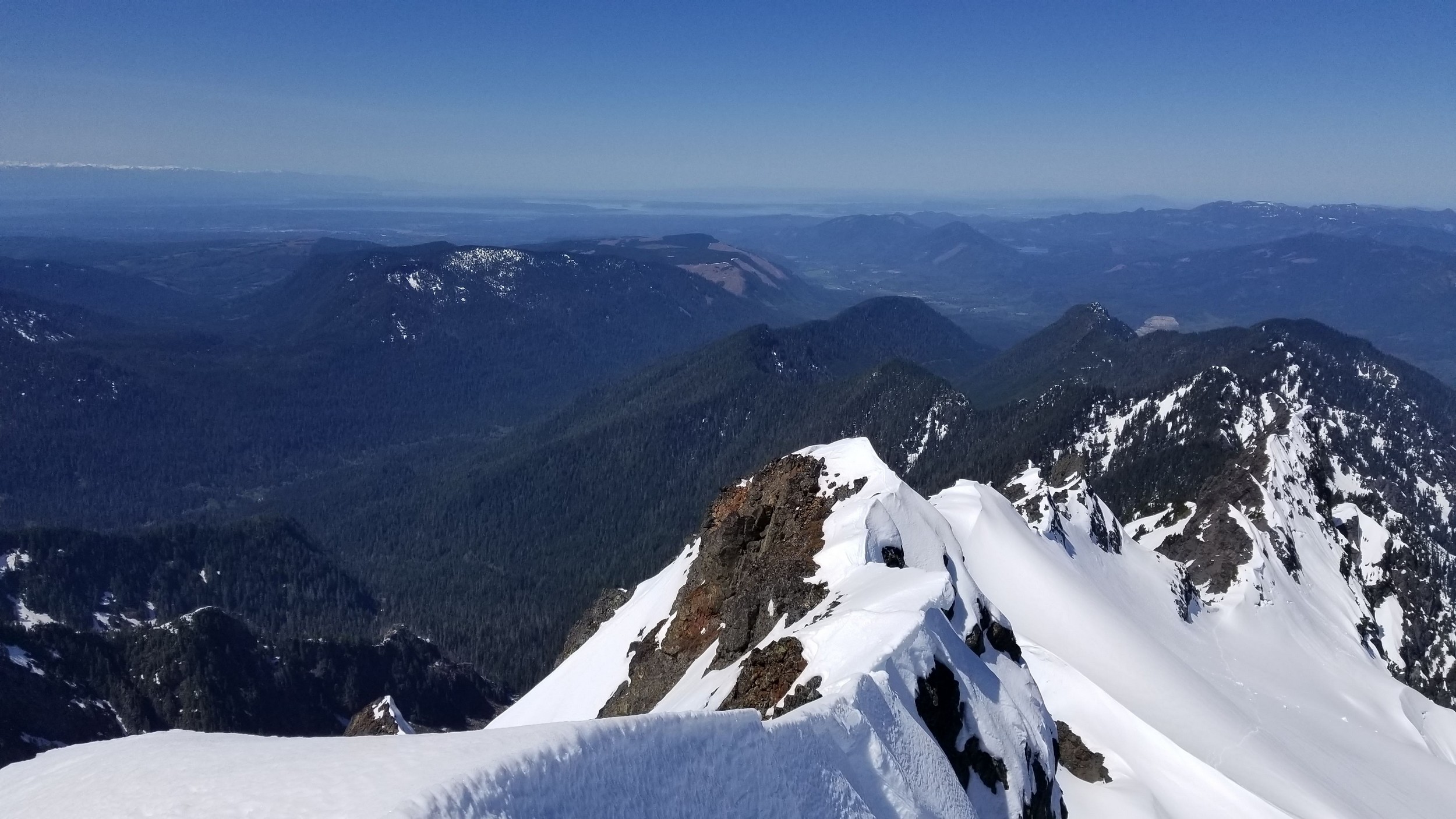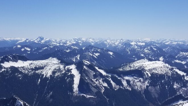 On Friday this past week, my friend Chris and I ascended Whitehorse Mountain via Lone Tree Pass. He had just moved up to Renton from Las Vegas, which coincidentally is where I am also staying right now, so it was easy to simply pick him up at 3:30AM and off we went in my van to Darrington. Upon reaching the trailhead a couple hours later, we saddled up and got moving at 5:45am up the wide and gentle old road. I decided to only bring leather hiking shoes and microspikes, hoping the snow would not be super icy at the top. We also brought a thin 60 meter rope and a picket to make a rappel from the summit if we needed to. The hike up the trail leading up the lower NW slopes through the forest was quite pleasant, and was flagged quite a bit too making it easy to follow in areas where the slide alder had bounced up. When we hit 2600 feet, we emerged into the open slopes, and luckily this is where we hit consistent snow because this area would be full of slide alder in a months’ time. With good snow coverage though, and being early enough in the morning, we were able to follow tracks from a party that headed up the day before, and on firm snow all the way to Lone Tree Pass which we reached about 9am. The snow never exceeded 40 degrees on this whole ascent to the pass, and most of it was in the 25-30 degree range. We made a point to look out for wet slides when we were descending.