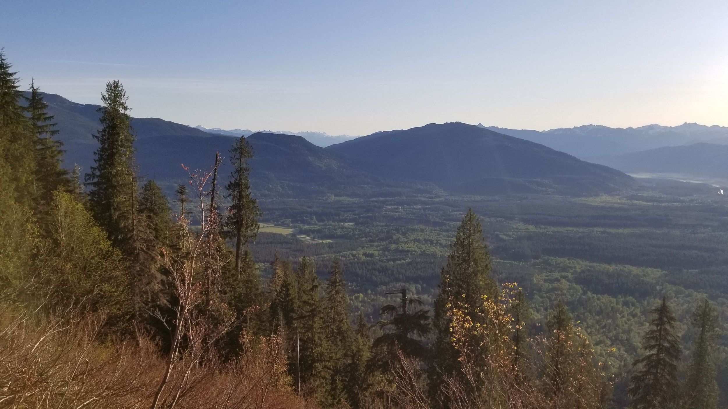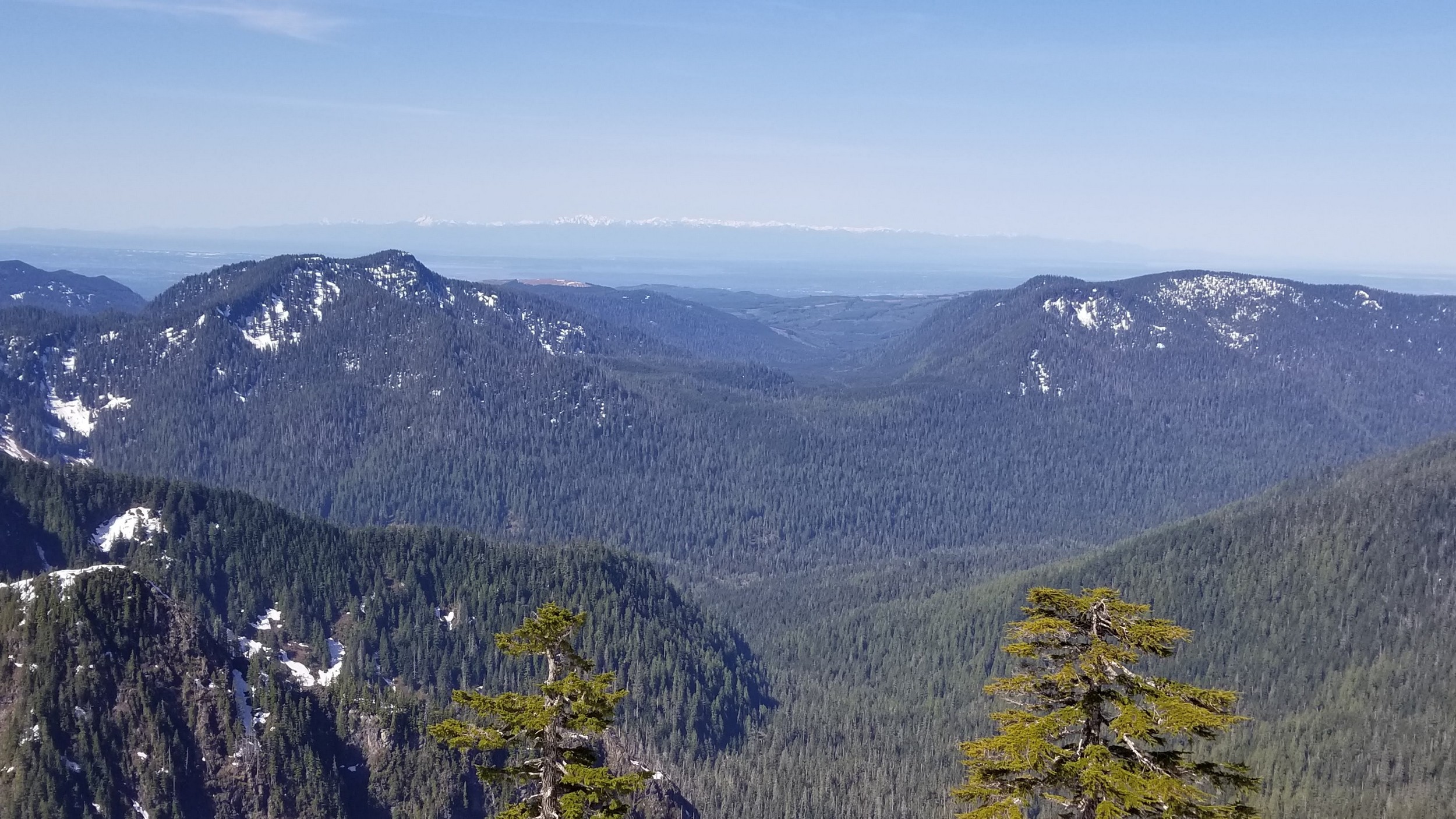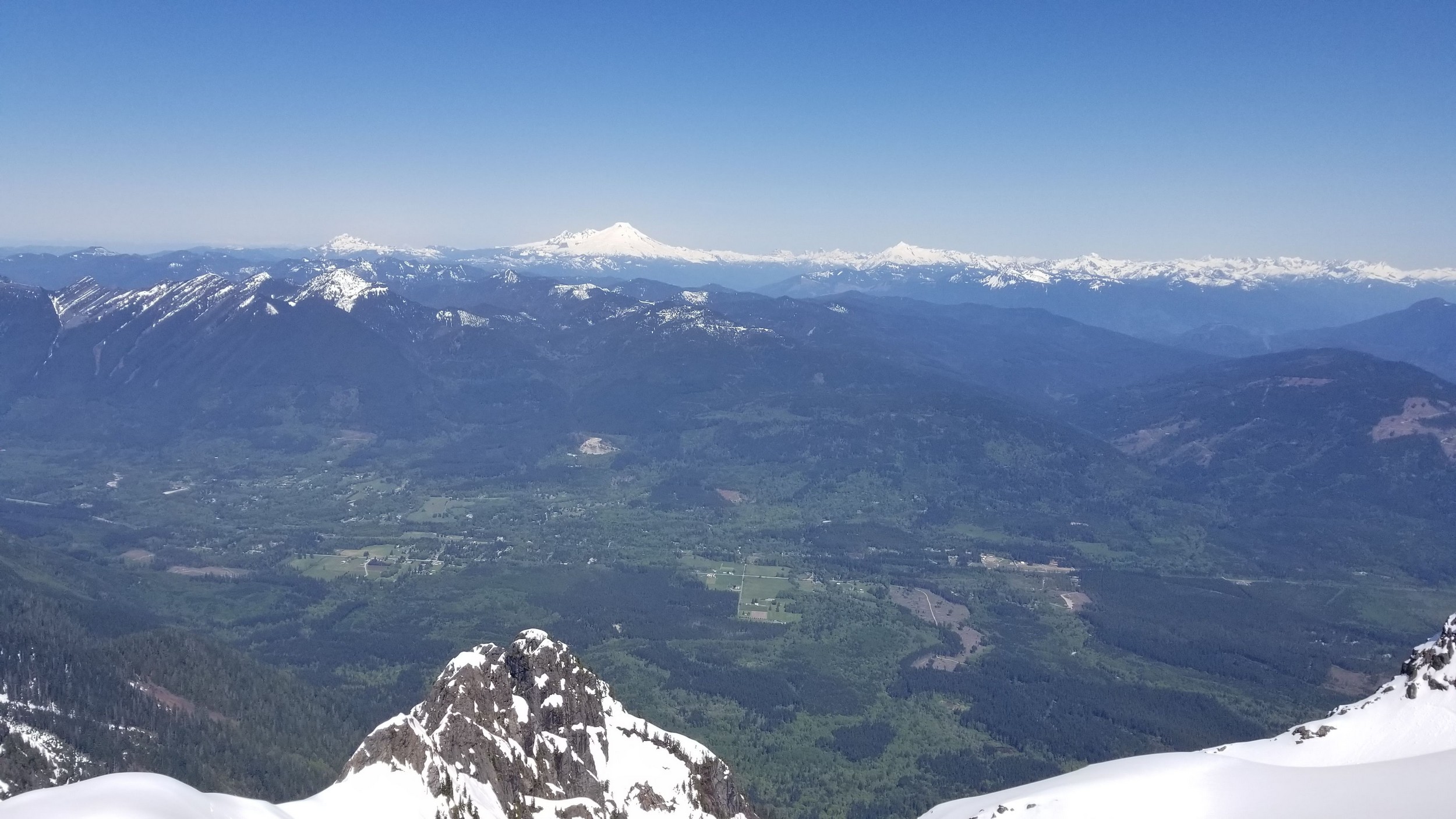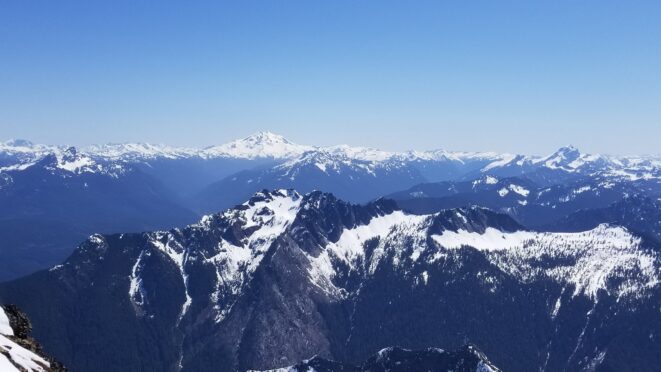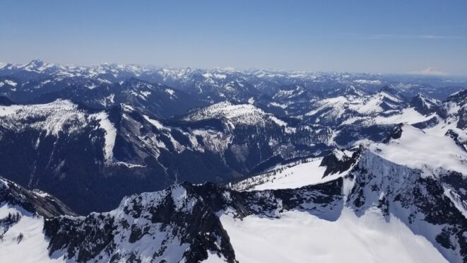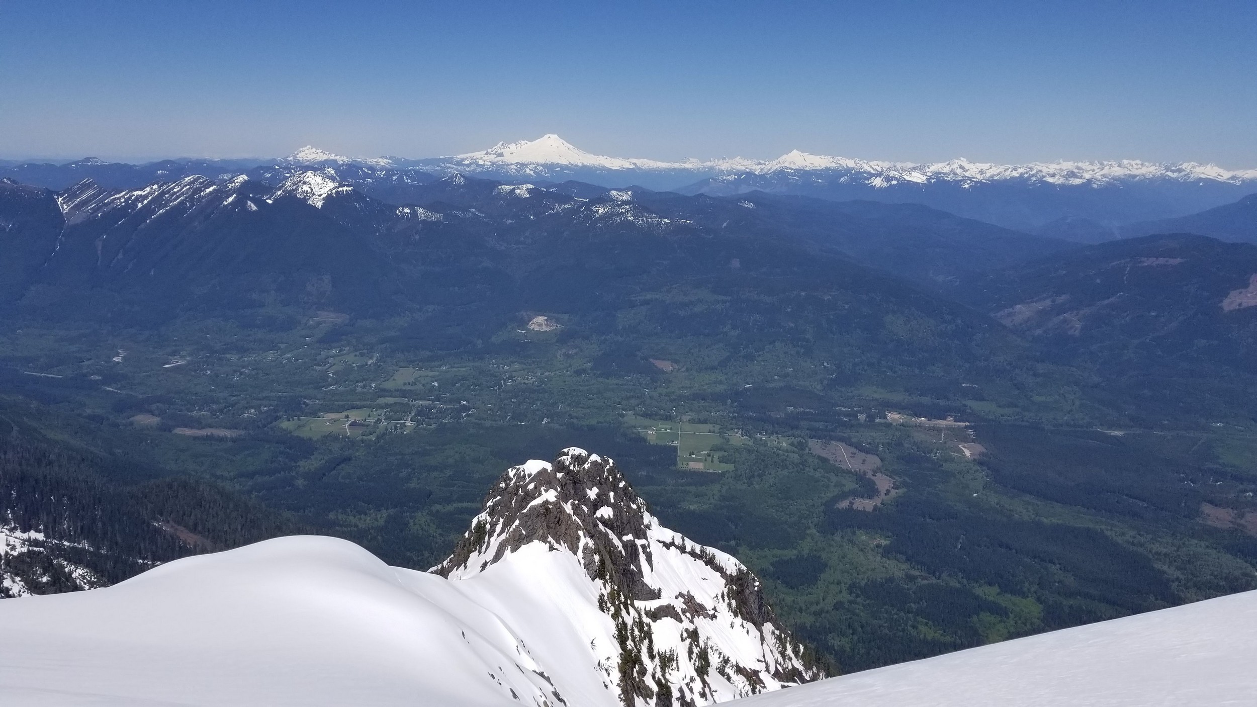 On Friday this past week, my friend Chris and I ascended Whitehorse Mountain via Lone Tree Pass. He had just moved up to Renton from Las Vegas, which coincidentally is where I am also staying right now, so it was easy to simply pick him up at 3:30AM and off we went in my van to Darrington. Upon reaching the trailhead a couple hours later, we saddled up and got moving at 5:45am up the wide and gentle old road. I decided to only bring leather hiking shoes and microspikes, hoping the snow would not be super icy at the top. We also brought a thin 60 meter rope and a picket to make a rappel from the summit if we needed to. The hike up the trail leading up the lower NW slopes through the forest was quite pleasant, and was flagged quite a bit too making it easy to follow in areas where the slide alder had bounced up. When we hit 2600 feet, we emerged into the open slopes, and luckily this is where we hit consistent snow because this area would be full of slide alder in a months’ time. With good snow coverage though, and being early enough in the morning, we were able to follow tracks from a party that headed up the day before, and on firm snow all the way to Lone Tree Pass which we reached about 9am. The snow never exceeded 40 degrees on this whole ascent to the pass, and most of it was in the 25-30 degree range. We made a point to look out for wet slides when we were descending.