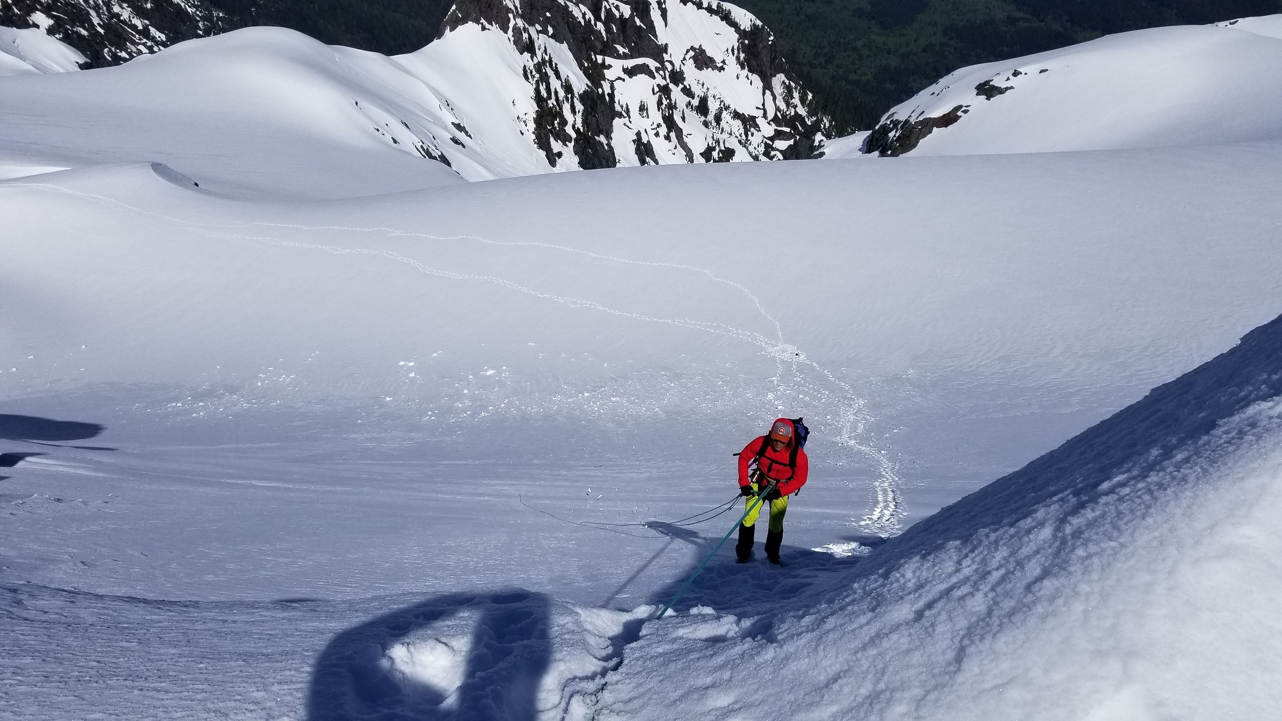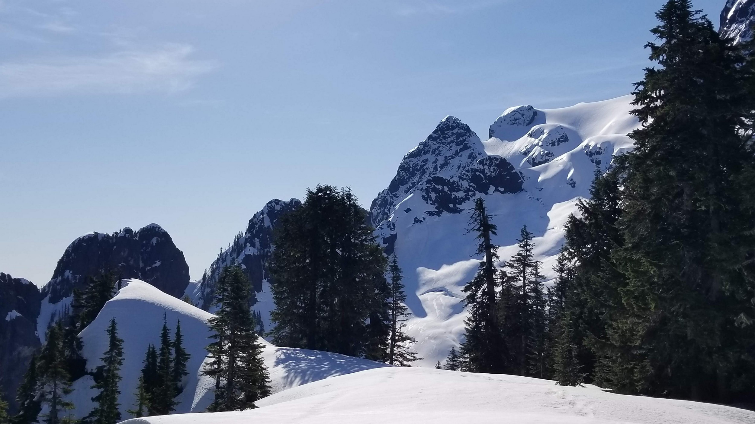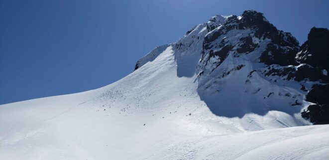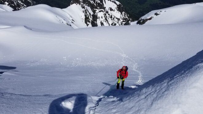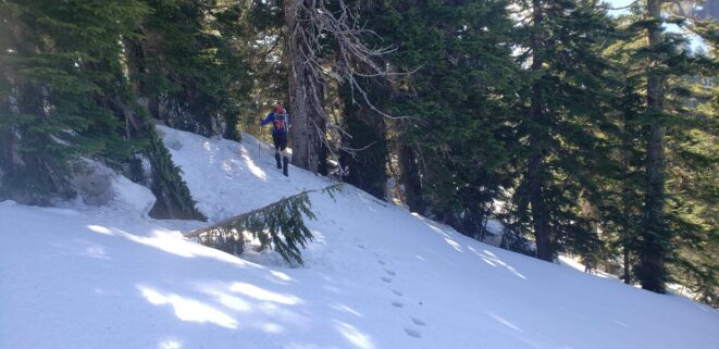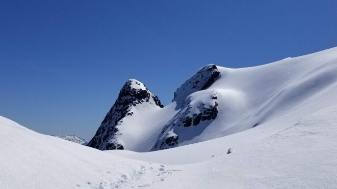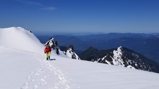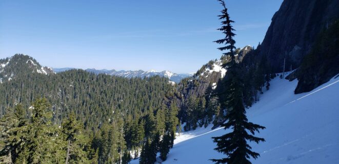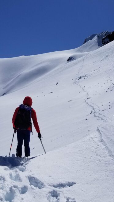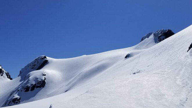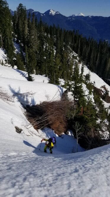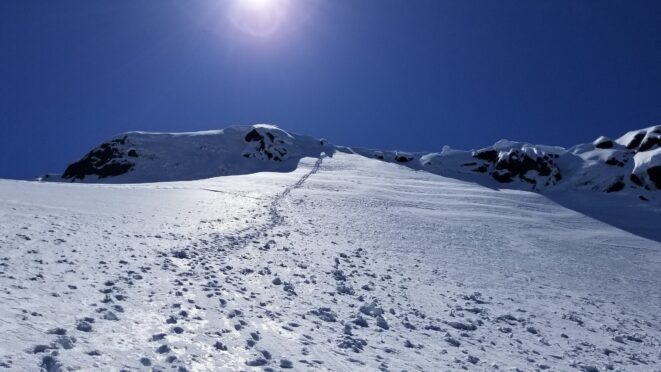 Once at the pass (elevation 4950 feet), we took a 5 minute break and turned left, following the tree covered flat ridge east for 15 minutes or so, then making a traversing descent about 350 feet to round the buttress and begin the long, gently ascending traverse towards High Pass. Thankfully, this entire slope is west facing, and was still mainly in the shade through the 9 o’clock hour and firm enough to warrant putting on my spikes, and Chris to put on his crampons. The final 400 feet to High Pass was a bit steeper, enough to replace the trekking pole with an axe (40 degree max). We reached High Pass about 10:45am and took another 5 minute food/drink rest and examined the remaining route. The tracks from the previous day were clutch through the gentle, snow loaded upper slopes as it was beginning to soften up since we were back on northeast facing slopes. We made quick work gaining 600 feet on gentle snow and to my amazement, nothing appeared to have recently slid in the upper bowl. 200 feet below the summit the snow angle increases back to 40, then 45 degrees but bucket steps made it really easy (thank you!). About 30 feet below the summit the steepness increased to 50 degrees, then the final 10 feet hardened to 55 degree ice. Since Chris had crampons on he solod through it to the top and fed me a few feet of rope for me to have a safety belay while I pulled myself up without much purchase with my microspikes. It would have been doable to solo with the spikes but not a necessary risk since it only added 5 minutes for me to tie in.