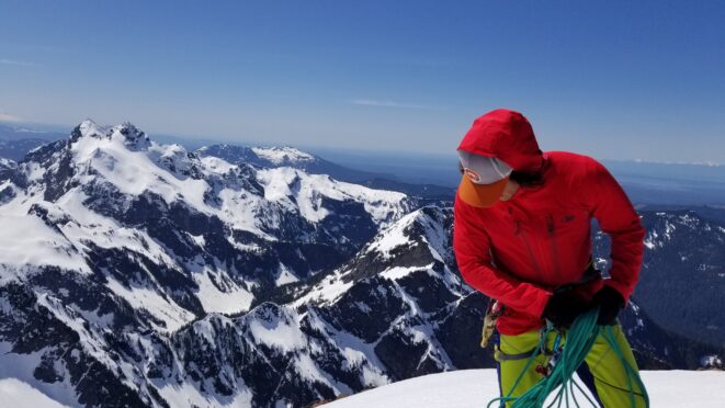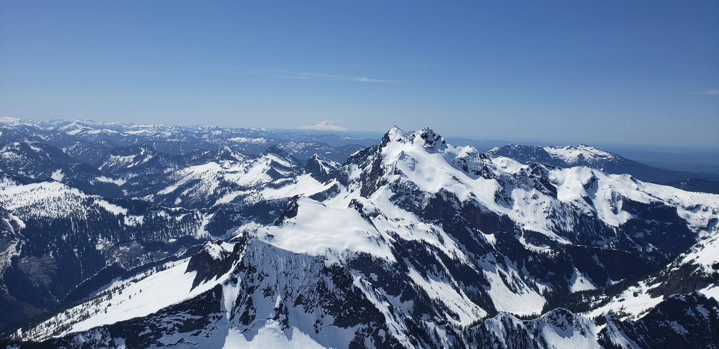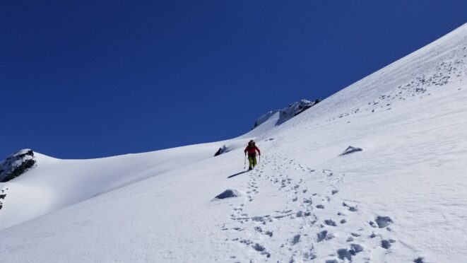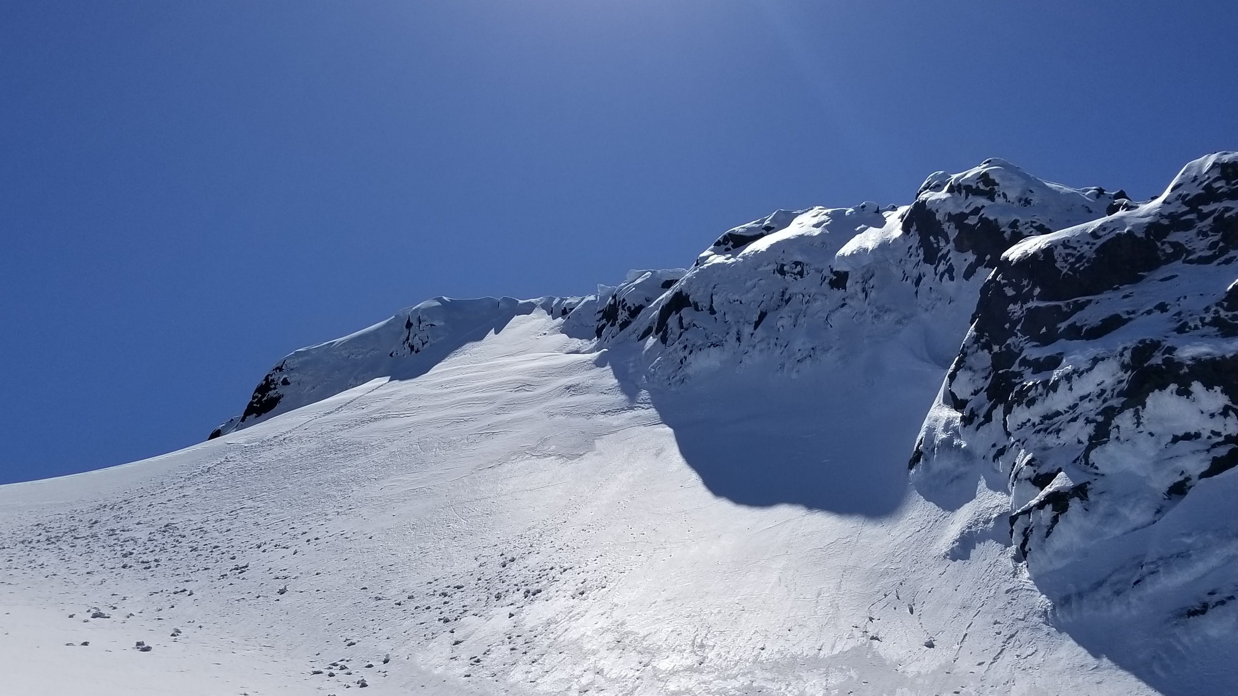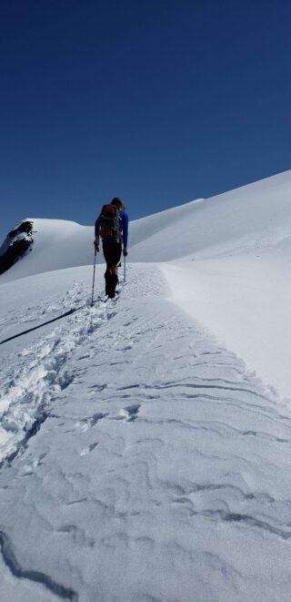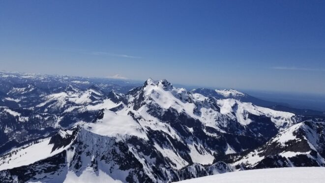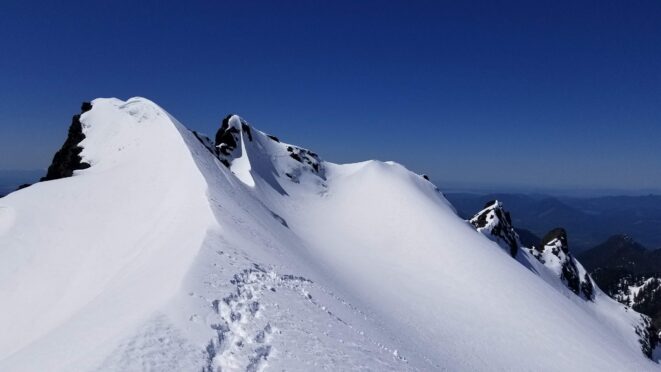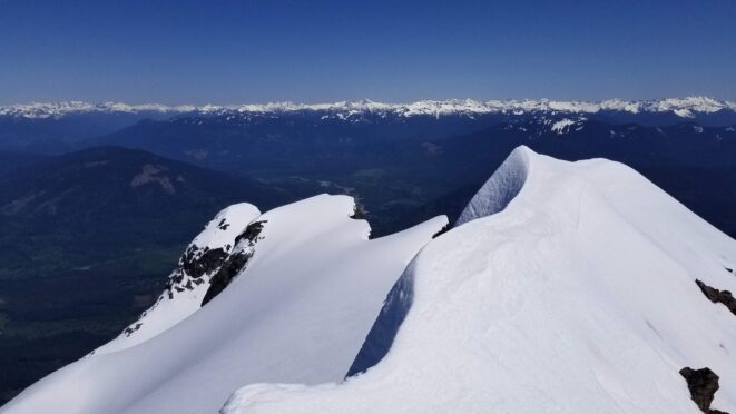 Once at the pass (elevation 4950 feet), we took a 5 minute break and turned left, following the tree covered flat ridge east for 15 minutes or so, then making a traversing descent about 350 feet to round the buttress and begin the long, gently ascending traverse towards High Pass. Thankfully, this entire slope is west facing, and was still mainly in the shade through the 9 o’clock hour and firm enough to warrant putting on my spikes, and Chris to put on his crampons. The final 400 feet to High Pass was a bit steeper, enough to replace the trekking pole with an axe (40 degree max). We reached High Pass about 10:45am and took another 5 minute food/drink rest and examined the remaining route. The tracks from the previous day were clutch through the gentle, snow loaded upper slopes as it was beginning to soften up since we were back on northeast facing slopes. We made quick work gaining 600 feet on gentle snow and to my amazement, nothing appeared to have recently slid in the upper bowl. 200 feet below the summit the snow angle increases back to 40, then 45 degrees but bucket steps made it really easy (thank you!). About 30 feet below the summit the steepness increased to 50 degrees, then the final 10 feet hardened to 55 degree ice. Since Chris had crampons on he solod through it to the top and fed me a few feet of rope for me to have a safety belay while I pulled myself up without much purchase with my microspikes. It would have been doable to solo with the spikes but not a necessary risk since it only added 5 minutes for me to tie in.
