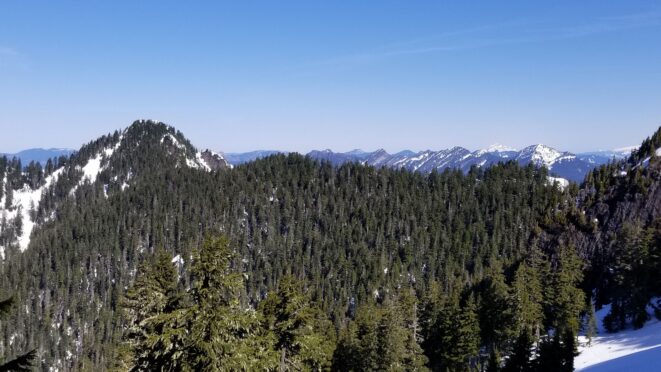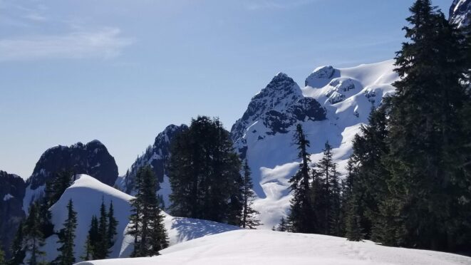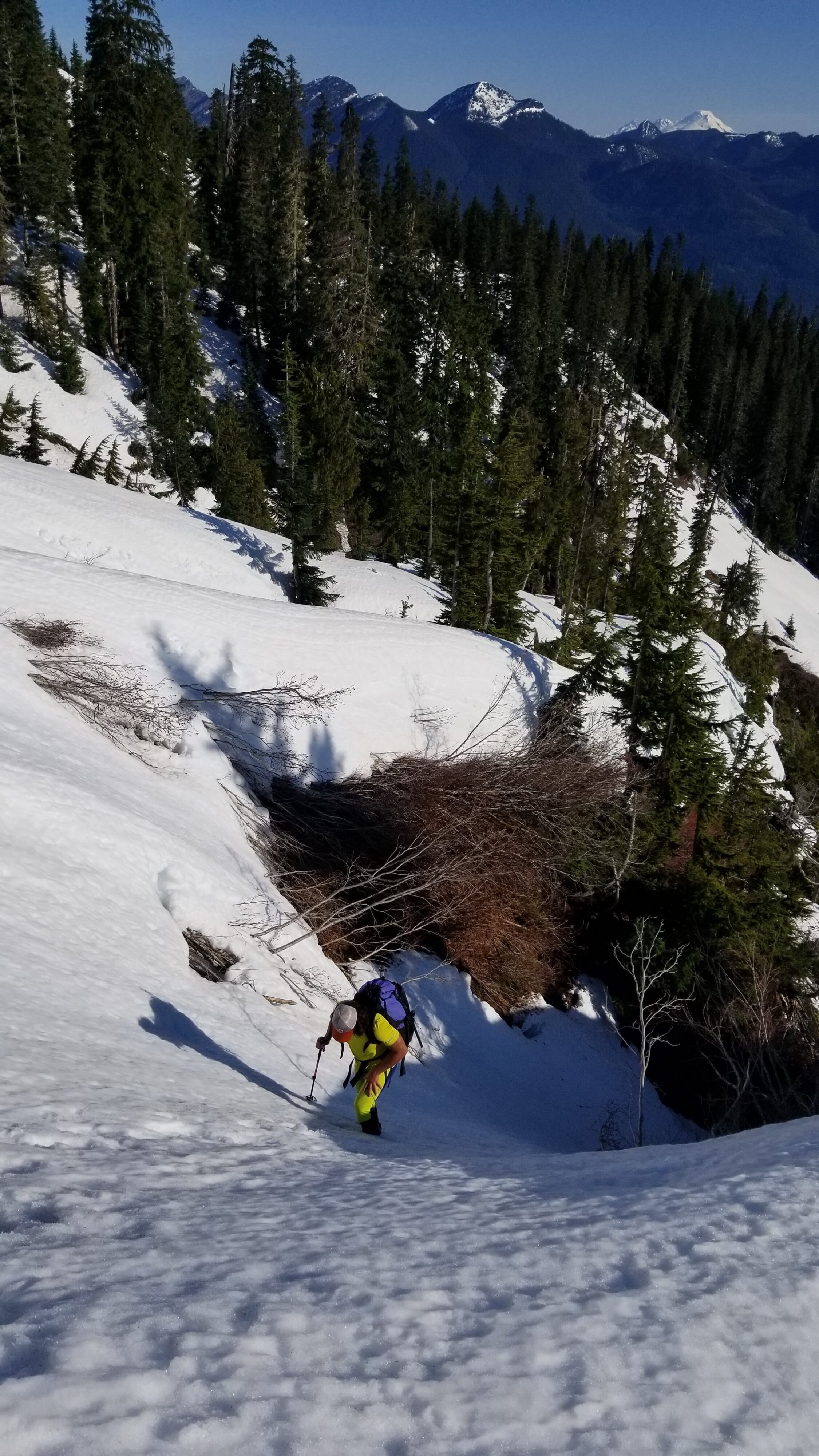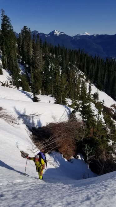 On the summit, which we reached at 11:45am, we had very commanding views of the entire Darrington valley, the Mountain Loop highway Peaks and the North Cascades. However, the view of Three Fingers just across the way to the south stole the show! We relaxed on the warm (but breezy) summit for 20 minutes and enjoyed the views. I placed the picket I brought into the bomber snow on the summit and we made one 30 meter rappel, which was nice because I have downclimbed steep snow more than enough in my climbing days and it’s a little stressful sometimes. Once back on easy terrain, we were quick to return to High Pass, then when we started the return traverse, the snow became considerably softer, so much so that I opted to put my snowshoes on. Chris unfortunately didn’t have any and suffered mid-thigh postholing and the occasional knee deep sink. Once we returned to the ridge and back in the trees, the snow was much firmer with easier travel. We ran into a couple who were starting to dig a tent platform along the ridge near Lone Tree Pass who planned to make the remaining ascent the next day. I wished them good luck and shared some beta.